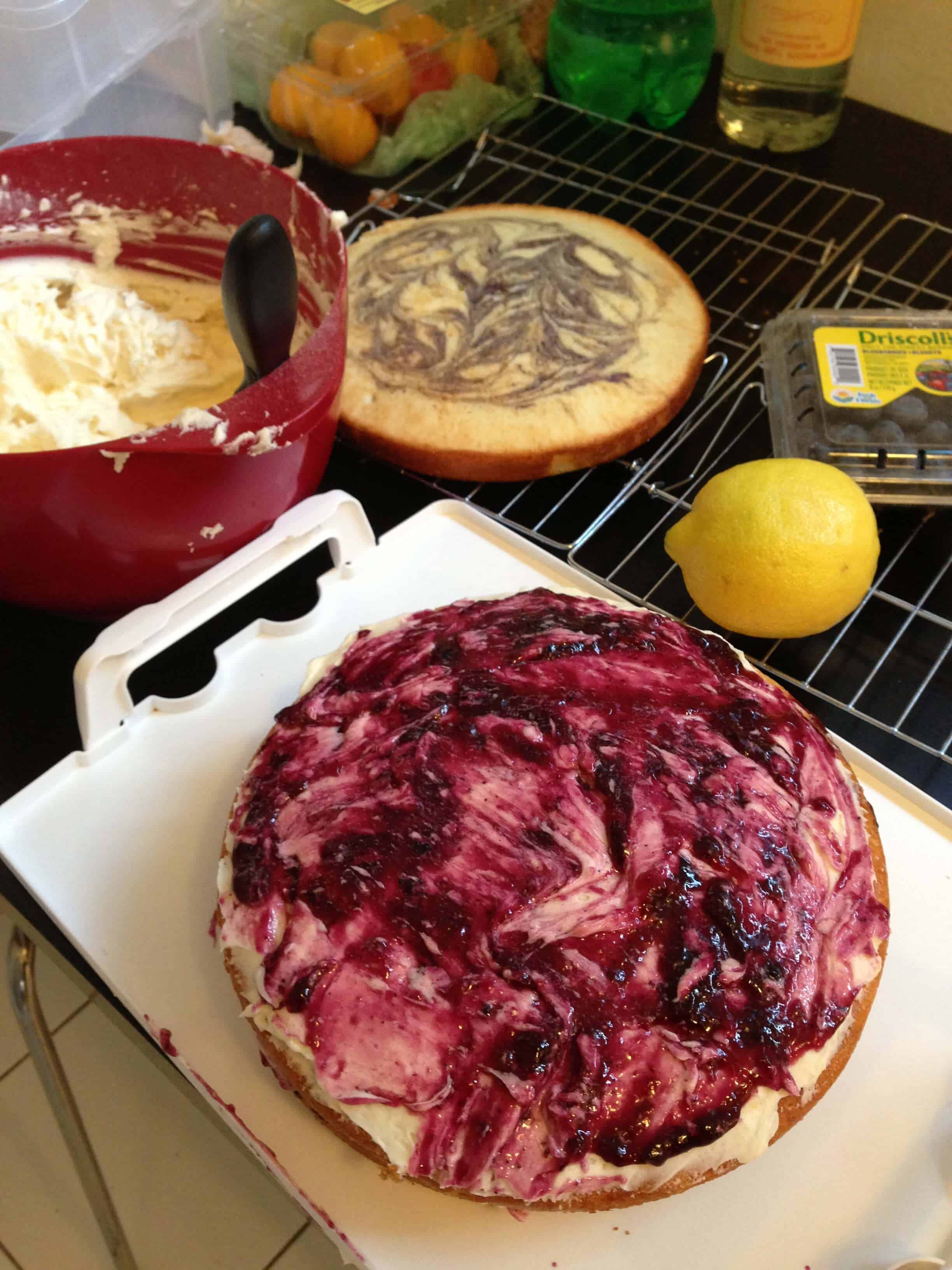 这可以让果酱混合物稍微融入面糊中,但只是进入上层。切蛋糕的时候看起来很漂亮,每一层的顶部都有一点蓝色。