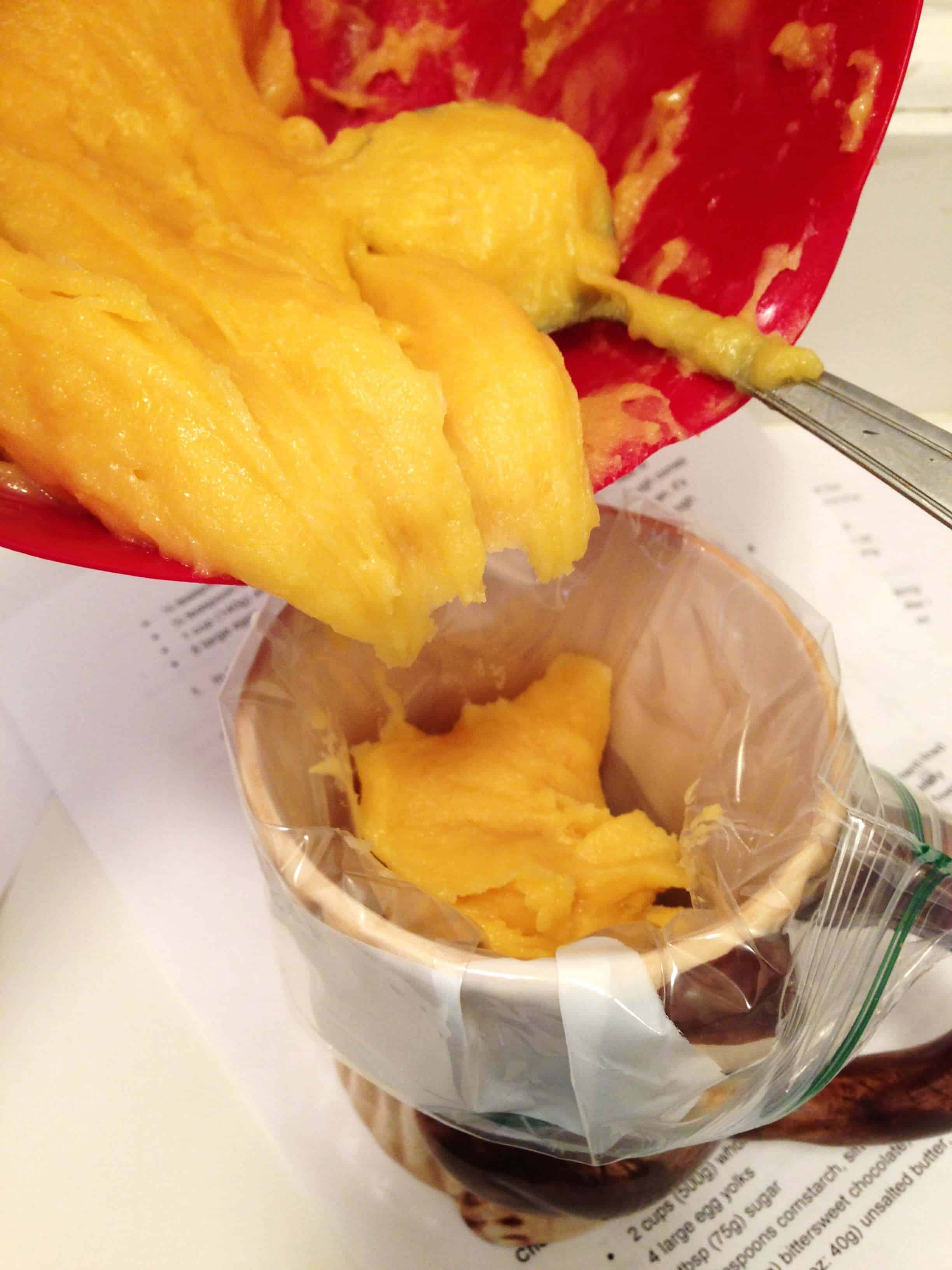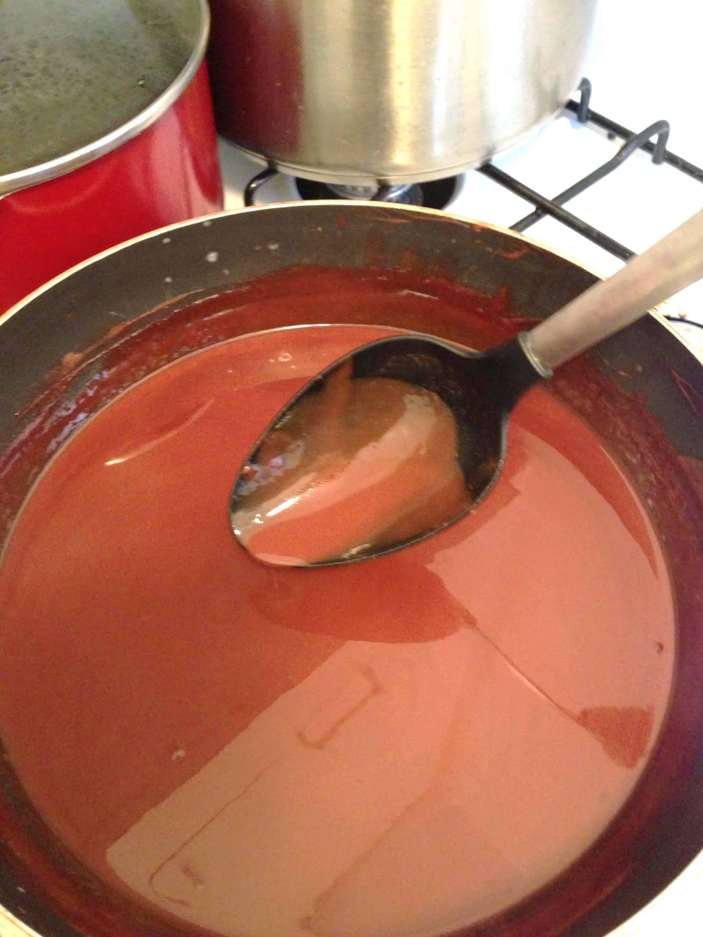 然后我确保没有一个鸡蛋炒(并确保删除任何鸡蛋),并将混合物倒回酱油锅中,同时猛烈搅拌(是的,这给了我一个伟大的手臂),直到混合物返回煮沸。我继续搅拌几分钟,然后在融化的巧克力中搅拌。