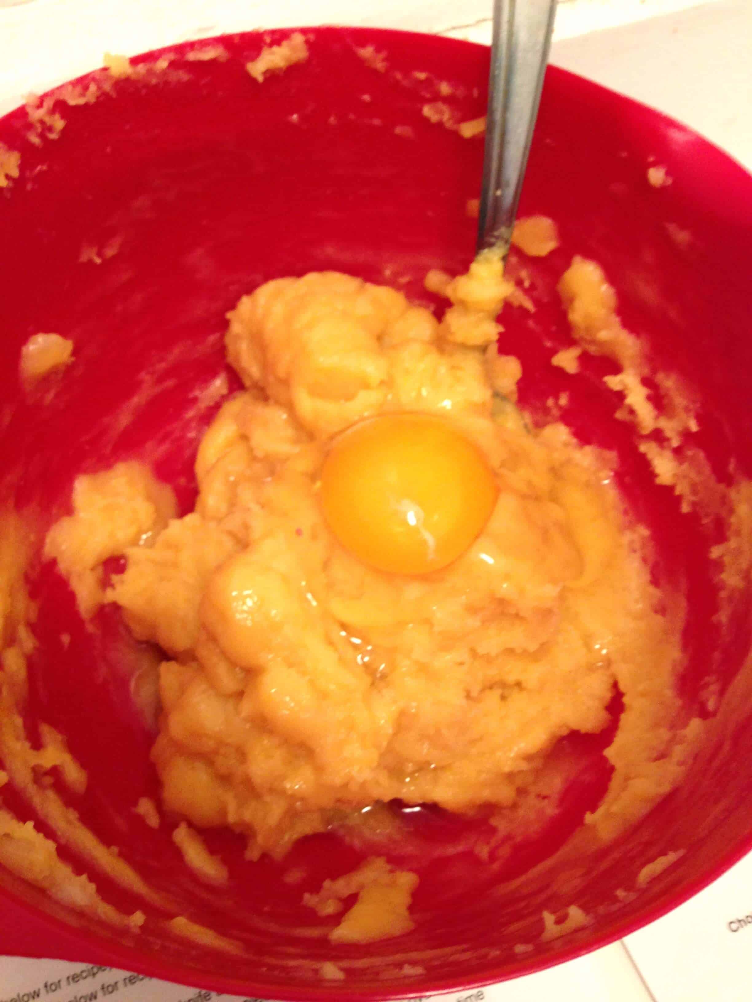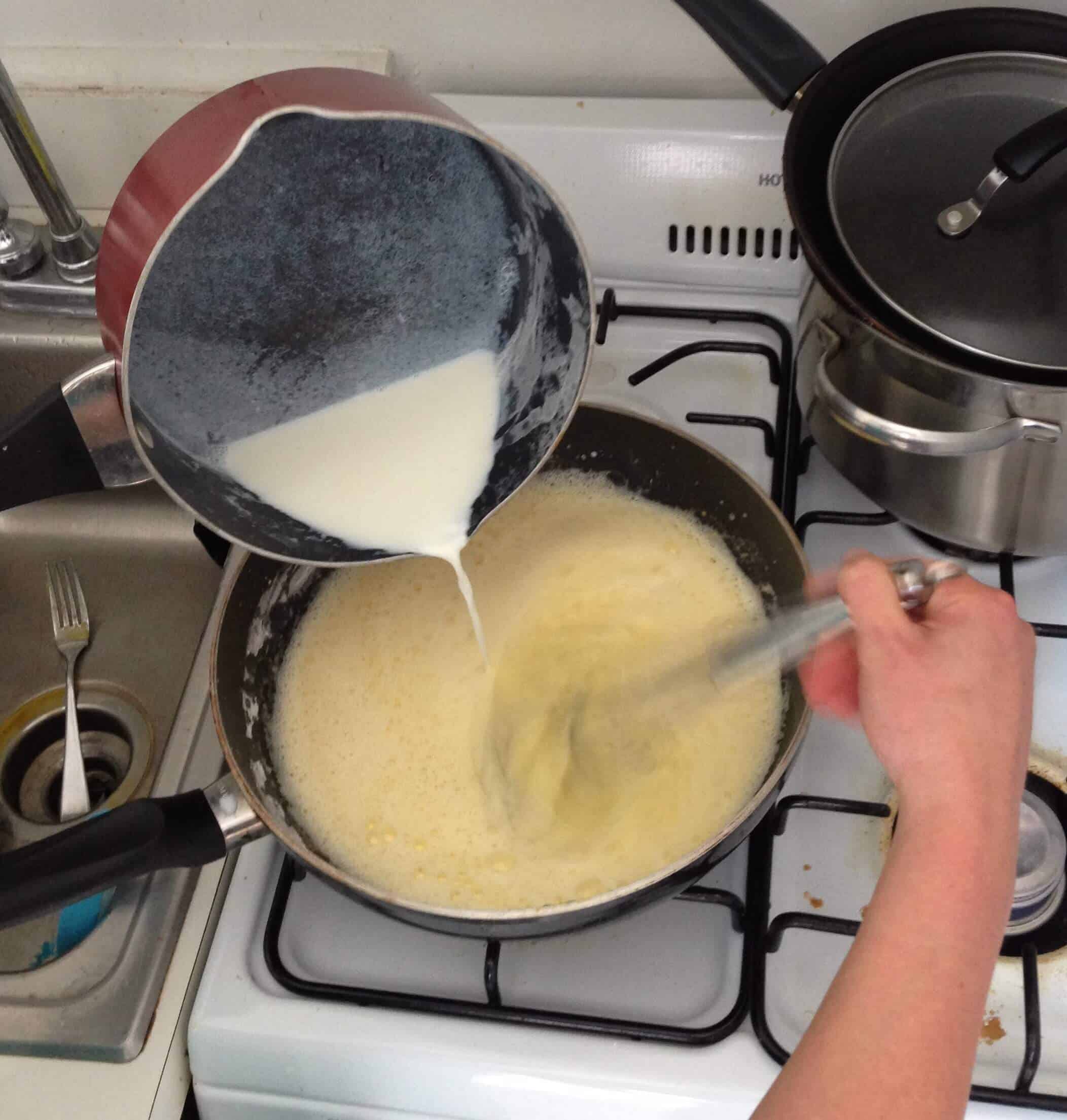 我将牛奶,水,黄油,糖和盐煮沸到沉重的底部的平底锅中。然后加入杯面粉并将热量降至培养基,同时剧烈搅拌。我继续搅拌约2-3分钟,使面团可以干燥一点,直到它柔软而光滑。如果在这个过程中在锅底的底部形成略微的地壳形式,请不要担心 - 它应该发生。然后我将面团转移到中尺寸的混合碗中,并使混合物冷却约10分钟。重要的是,在添加鸡蛋之前让它冷却,以便面团将正确上升。然后我一次将每个鸡蛋混合。不要担心如果你的面团分开,当你加入第一个夫妇鸡蛋时,它将在继续混合它时回来。
