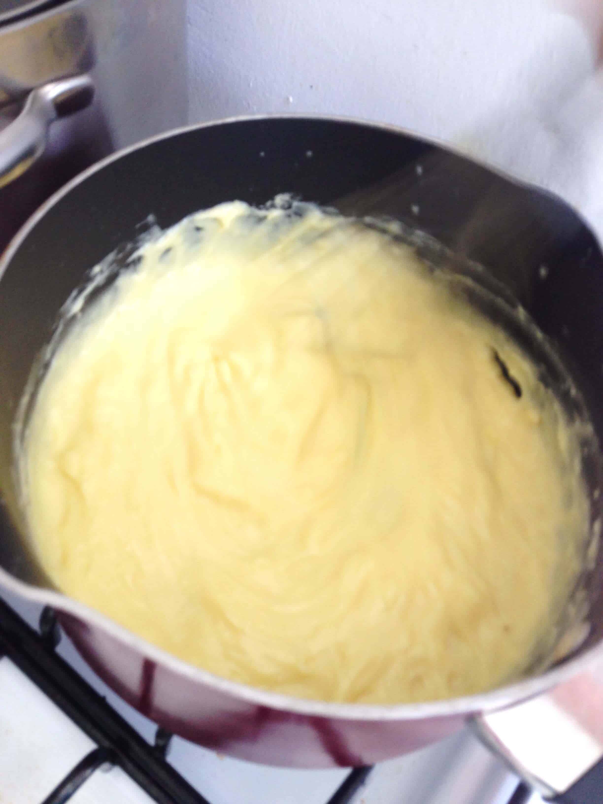 在一个小酱油中,我将牛奶煮沸。虽然我在等待牛奶加热,但我将蛋黄,糖和玉米淀粉组合在一起,在一块厚底的酱汁锅中。当牛奶沸腾时,我慢慢地用搅拌鸡蛋搅拌蛋混合的牛奶。我继续搅拌鸡蛋并慢慢地将其余的牛奶倒入回火的蛋黄中。
