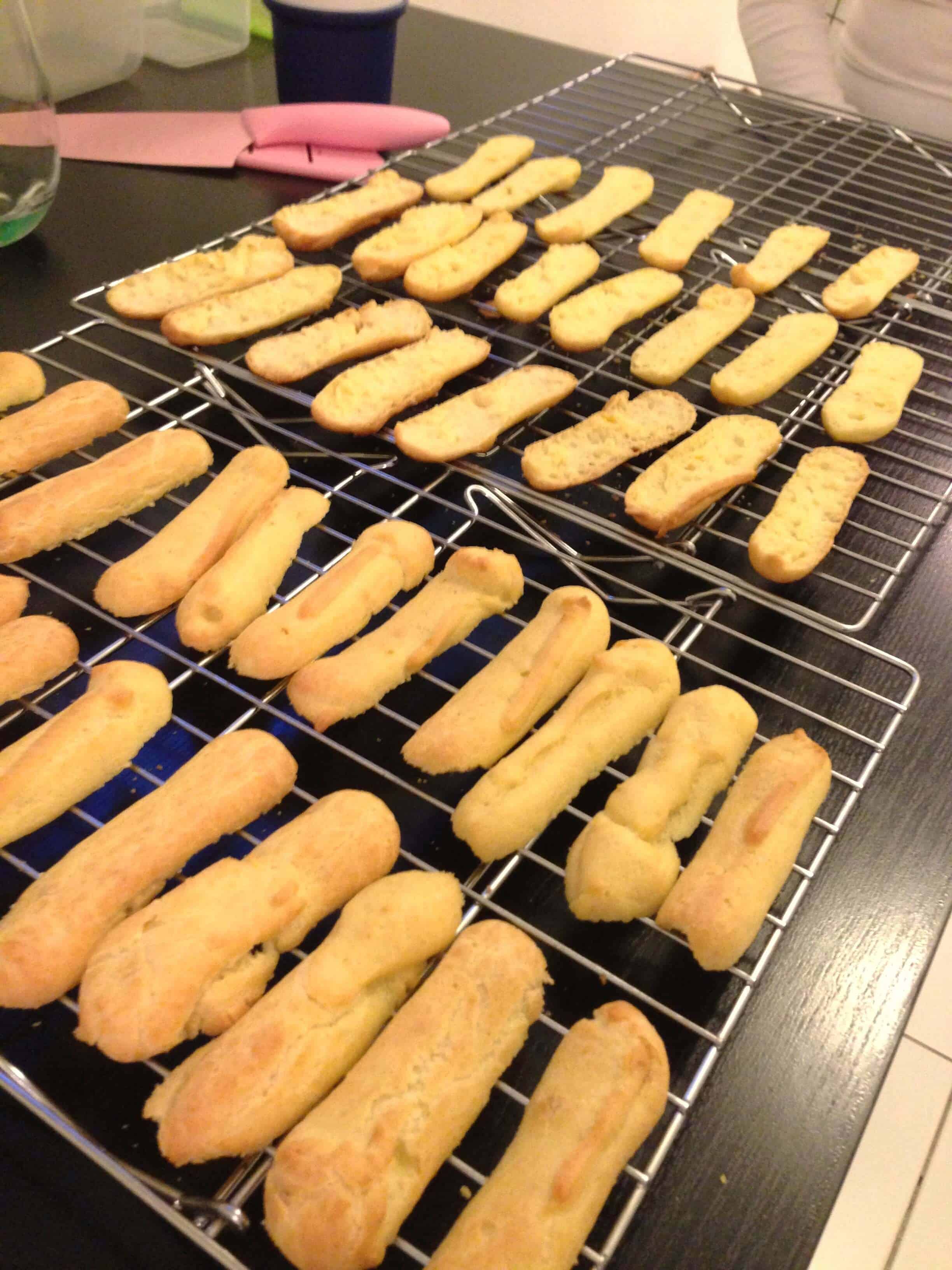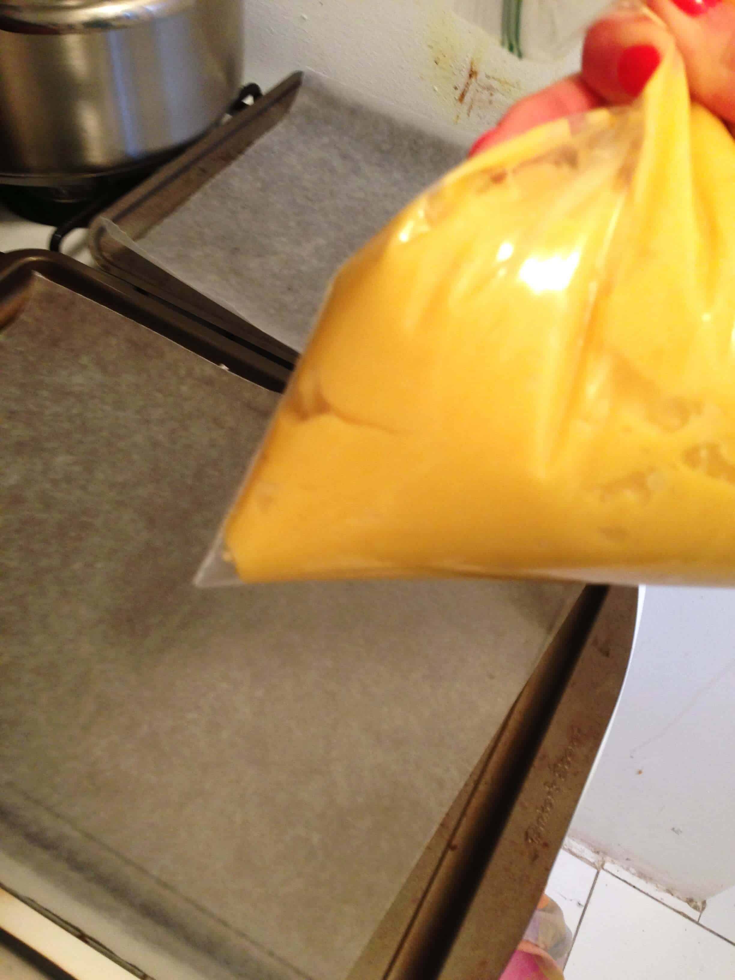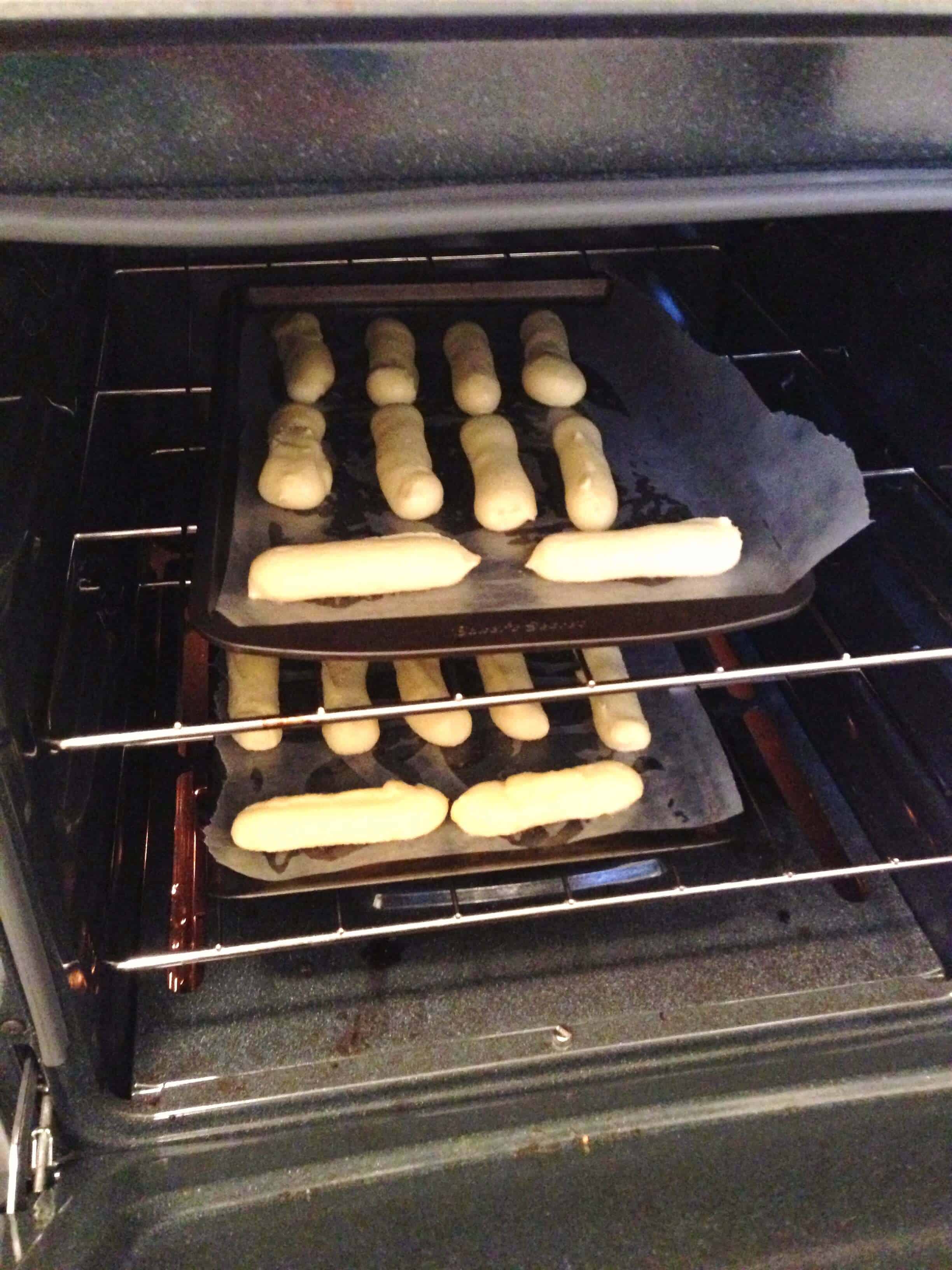 一旦面团混合在一起(仍然有点温暖),我把它放入袋子里并在我衬里的烤盘上以3英寸长的剥离管道。我把袋子的边缘切割了大约3/4英寸,然后管道大约30个eClairs。我冻结了其中一个床单(冷冻面团持续大约一个月),并在375度烘烤其他两个平底锅。这是一个奇怪的烘焙过程......但我跟着说明。我让糕点煮7分钟,然后用......一个木制的泥泞,张开烤箱门。我应该使用木勺的把手......但相信它或不是我没有木勺!泥泞的工作很好。糕点煮熟后,总共12分钟后,我将纸张顶到底部旋转到底部。然后我继续烘烤10分钟(直到糕点是膨化的,金色和坚定)。