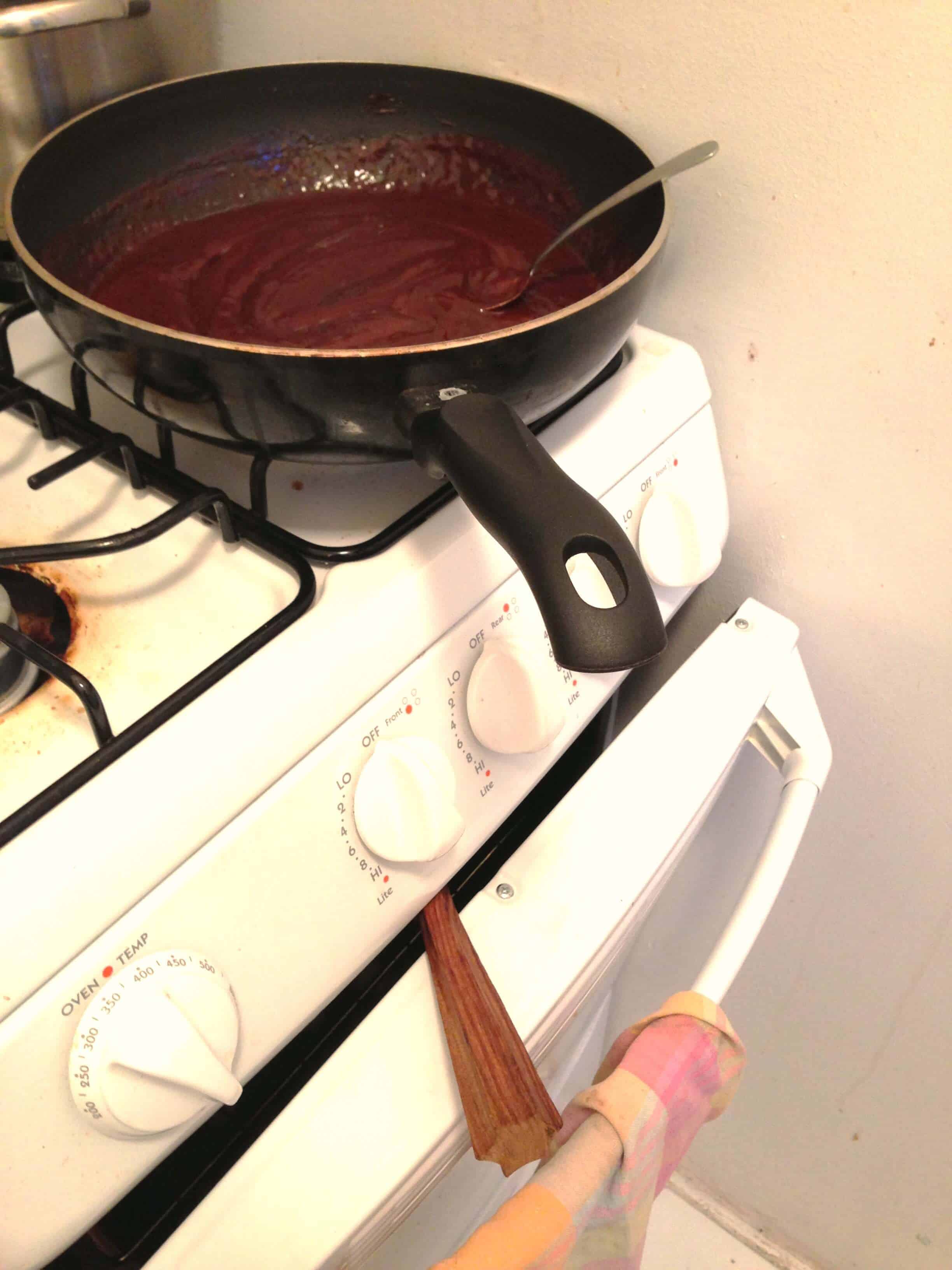 我将所有成分放在沉重的酱油锅中,并将混合物煮沸。不断搅拌,然后我将热量降低到低温并用勺子继续搅拌直至酱汁增稠(约10分钟)。当酱汁粘在你勺子的背部时,你会知道酱汁是这样做的。