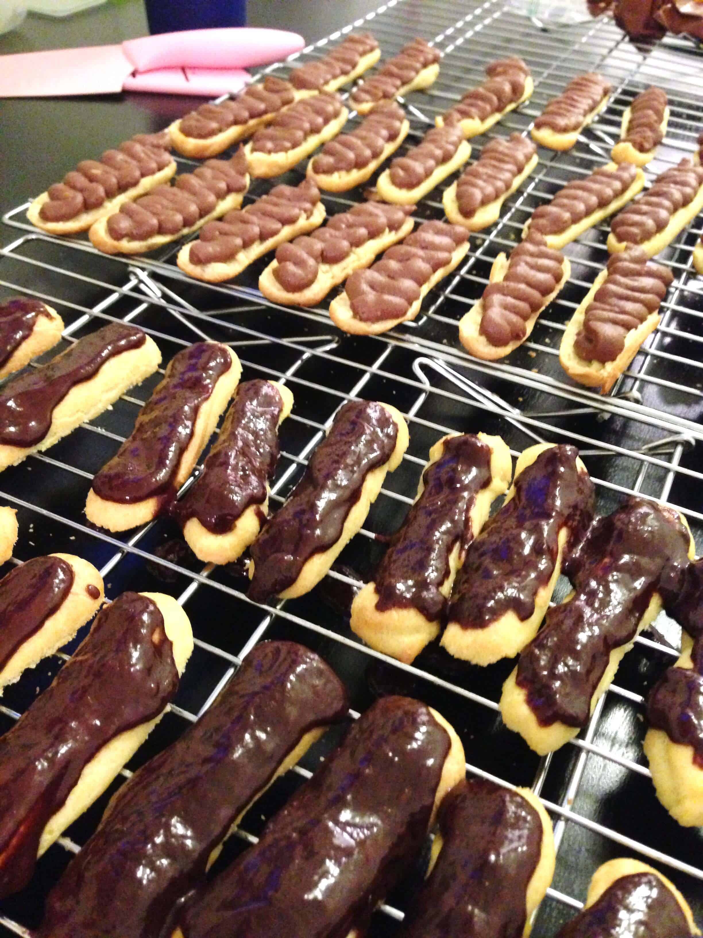一旦他们被冷却,我将它们切成两半,并朝着右侧奠定了朝上,以便我很容易釉。我用金属糖衣刮刀,将温暖的釉料蔓延到顶部。然后我将巧克力奶油填充到每个糕点的下半部分。在将顶部放在奶油覆盖的每个糕点的下半部分,我确保釉面套装。