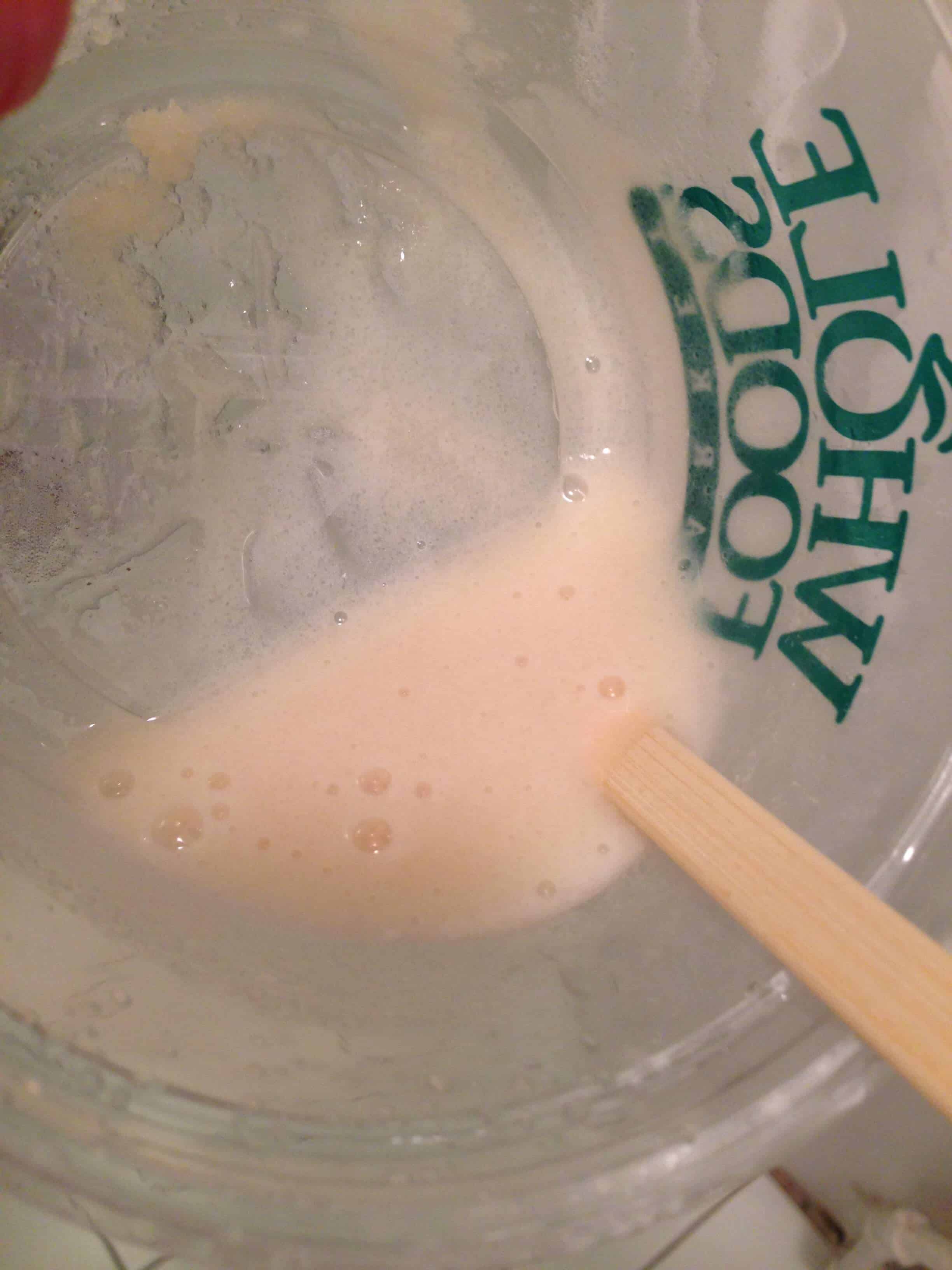 接下来加入约2汤匙牛奶。将成分混合在一起,直到它们具有粗糙,厚的一致性(见下文)。