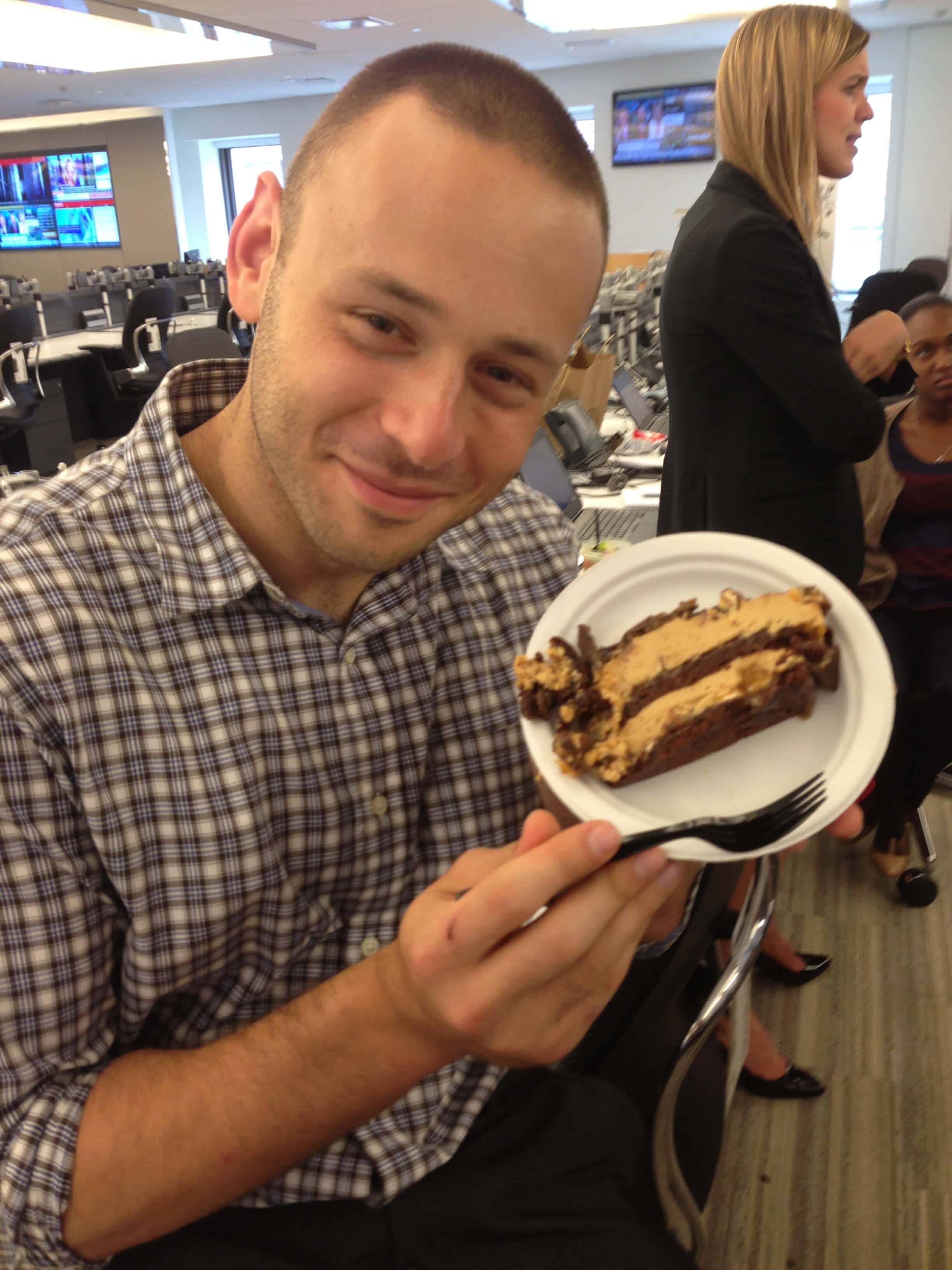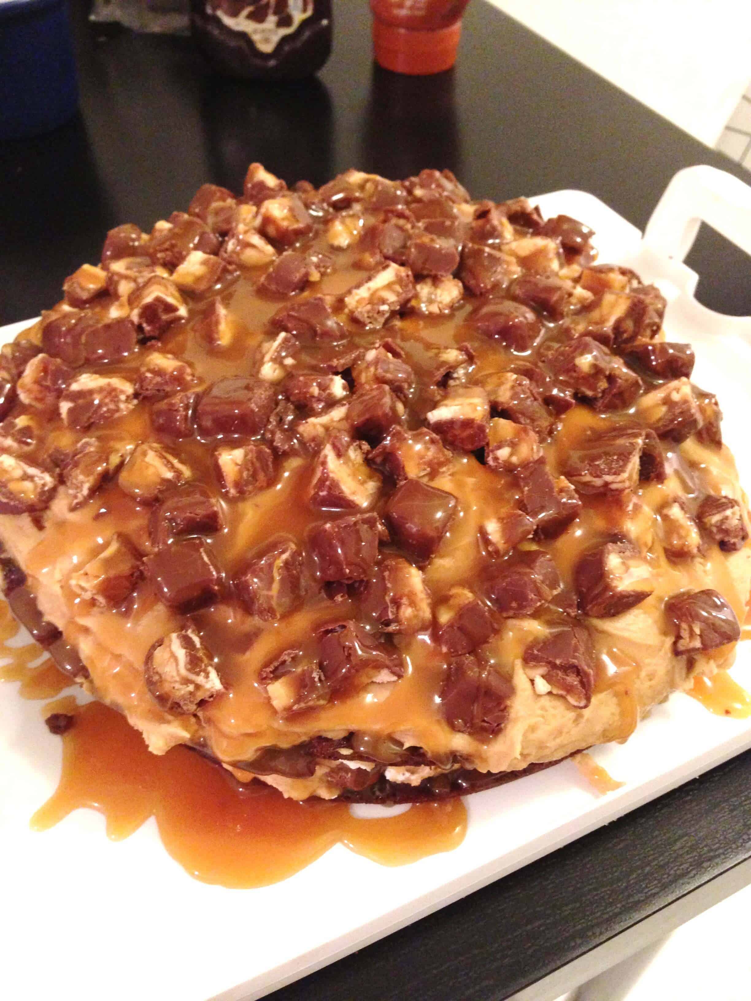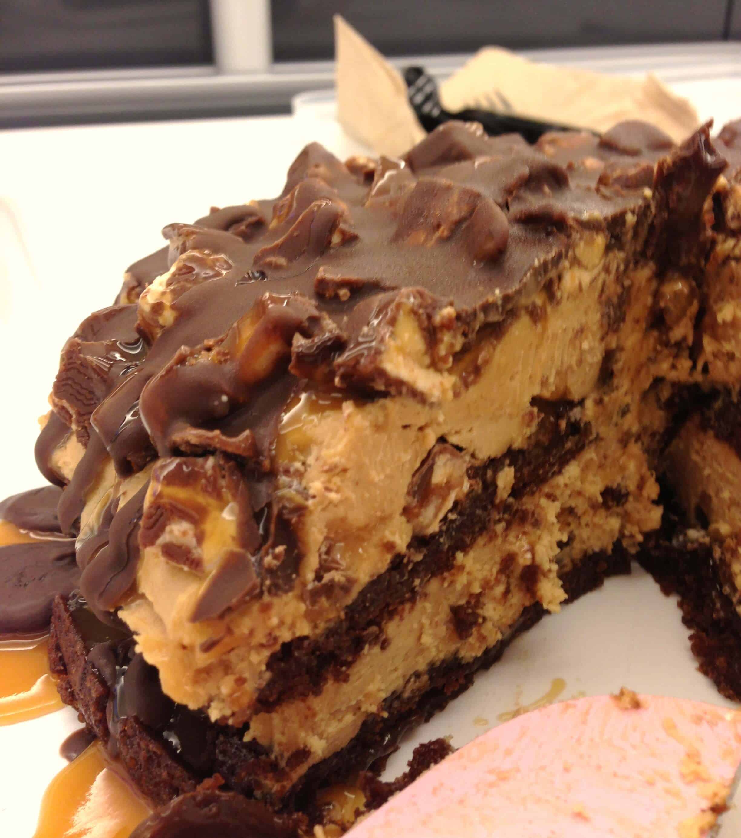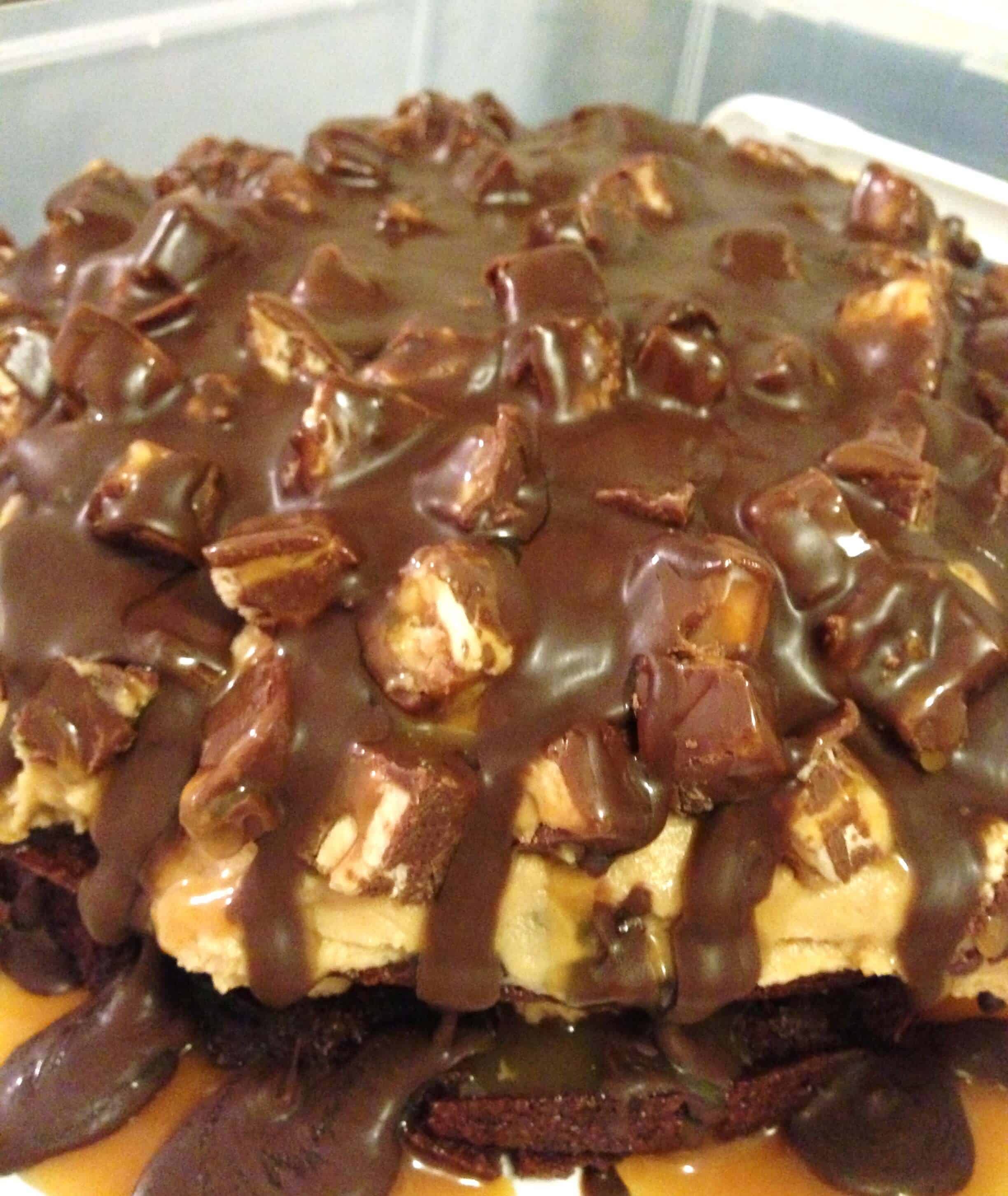 对于蛋糕的组装,我放在我的蛋糕托盘和窃笑均匀地分布在顶部蔓延1/3的中间层布朗尼之一。然后我淋上1/2杯焦糖酱和1/2杯巧克力酱在布朗尼的。然后我用花生酱冰激凌的一半突破这一点,并让约15分钟这一级冻结。然后我放置在冰淇淋的顶部上的第二层布朗尼,再次覆盖与所述第二组短切嘲笑的,1/2杯焦糖酱,和1/2杯巧克力酱布朗尼。我突破这个用剩下的花生酱冰激凌,然后用剩下的窃笑,焦糖酱,巧克力酱淋上,允许其小雨下来的两侧。