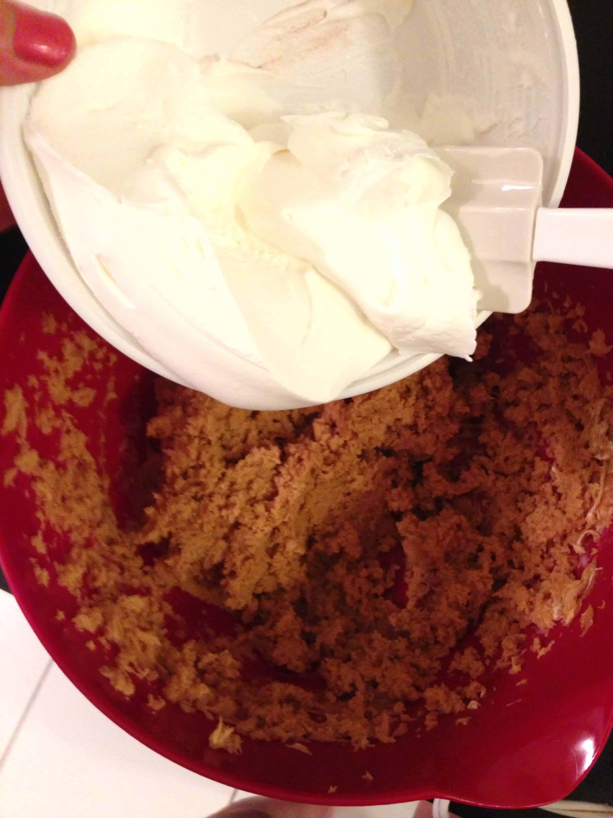 作为布朗尼被冷却,我提出的冰淇淋层。我结合在一起的牛奶,奶油奶酪,糖和花生酱,并用我的手搅拌机混合在一起他们。一旦所有的成分完全合并。然后,我在凉爽的鞭子折叠。