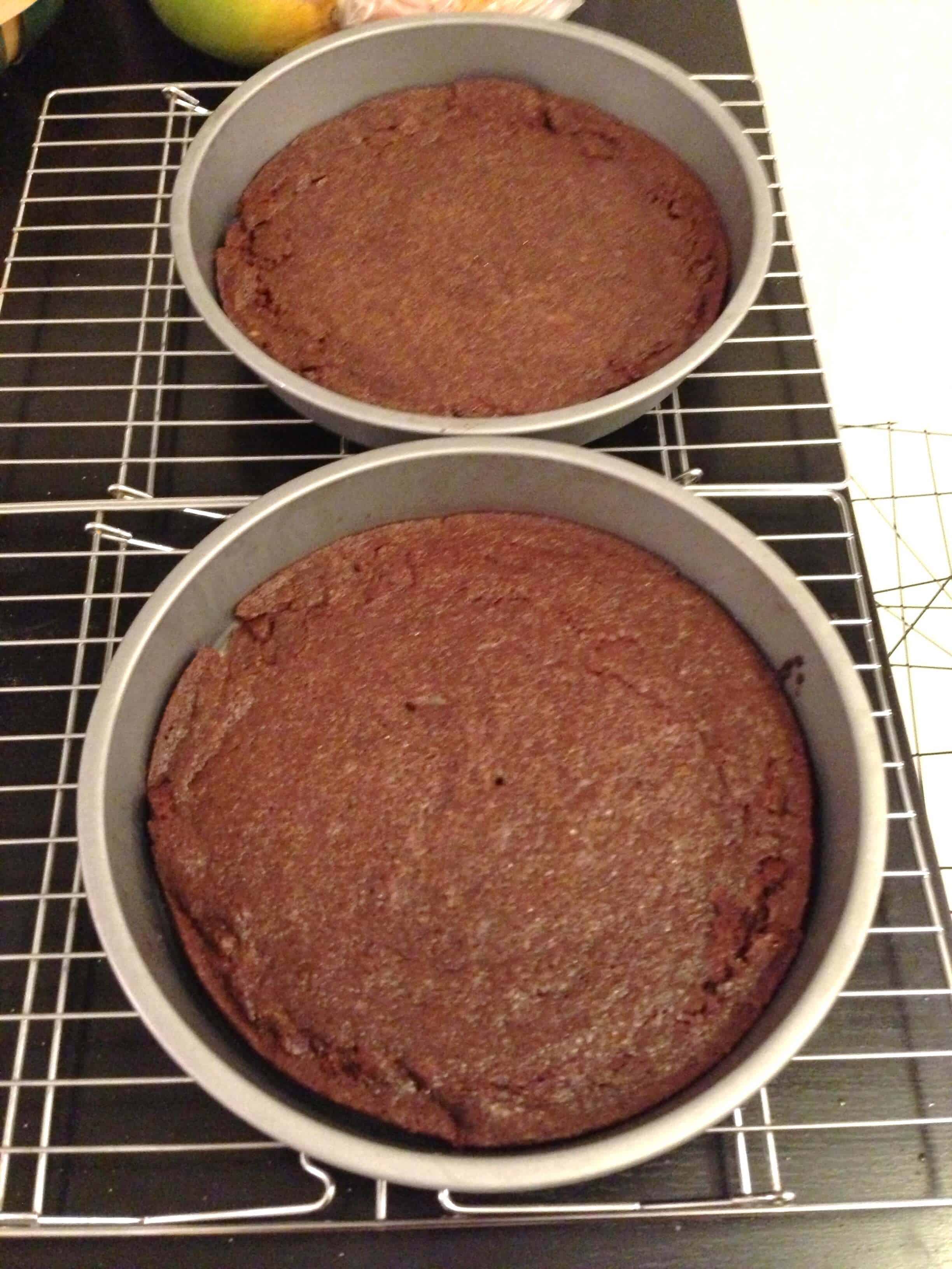 我开始润滑两个8英寸盘(弹簧扣平底锅将工作最好的,但所以我只是用9个蛋糕盘我没有任何),并衬有羊皮纸的底部,以便容易去除。我混在一起在一个大碗里所有的布朗尼成分和倒一半的面糊倒入烤盘每个。我让他们烤约12分钟左右,直到牙签出来干净,让他们冷却10分钟,将它们放置在一个有引线的架子前。