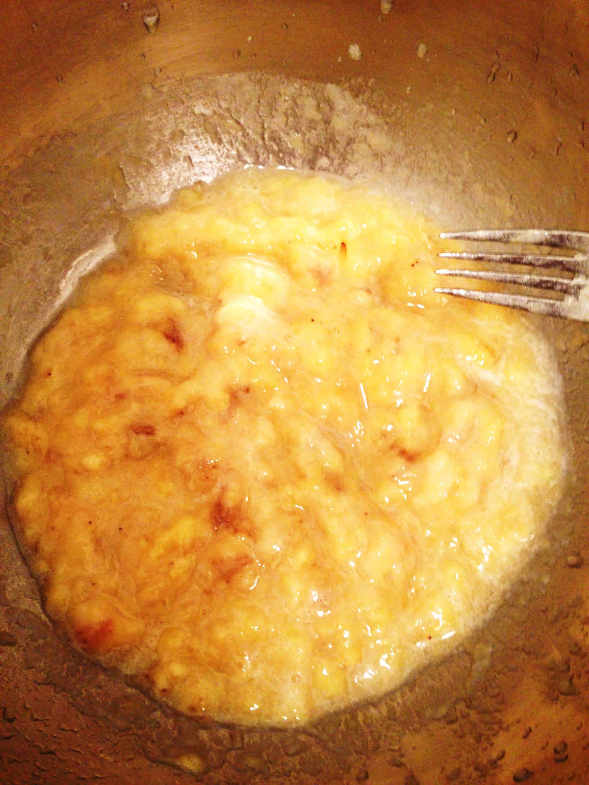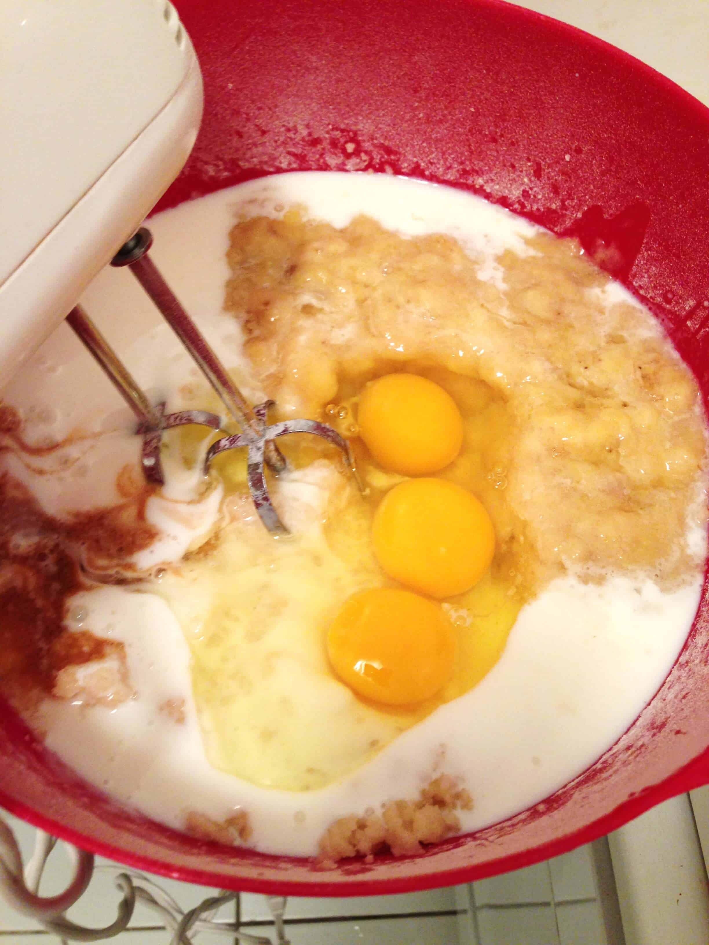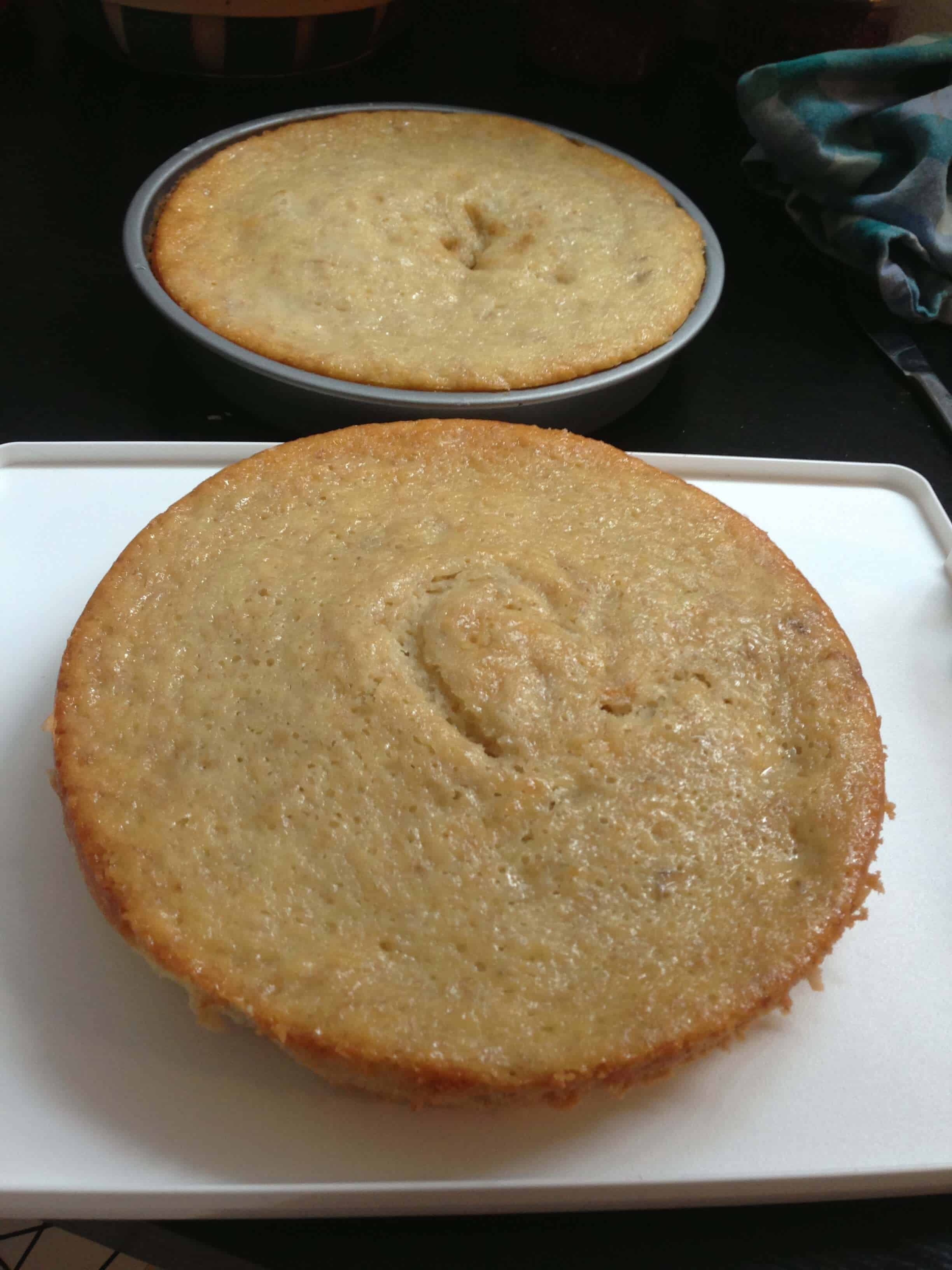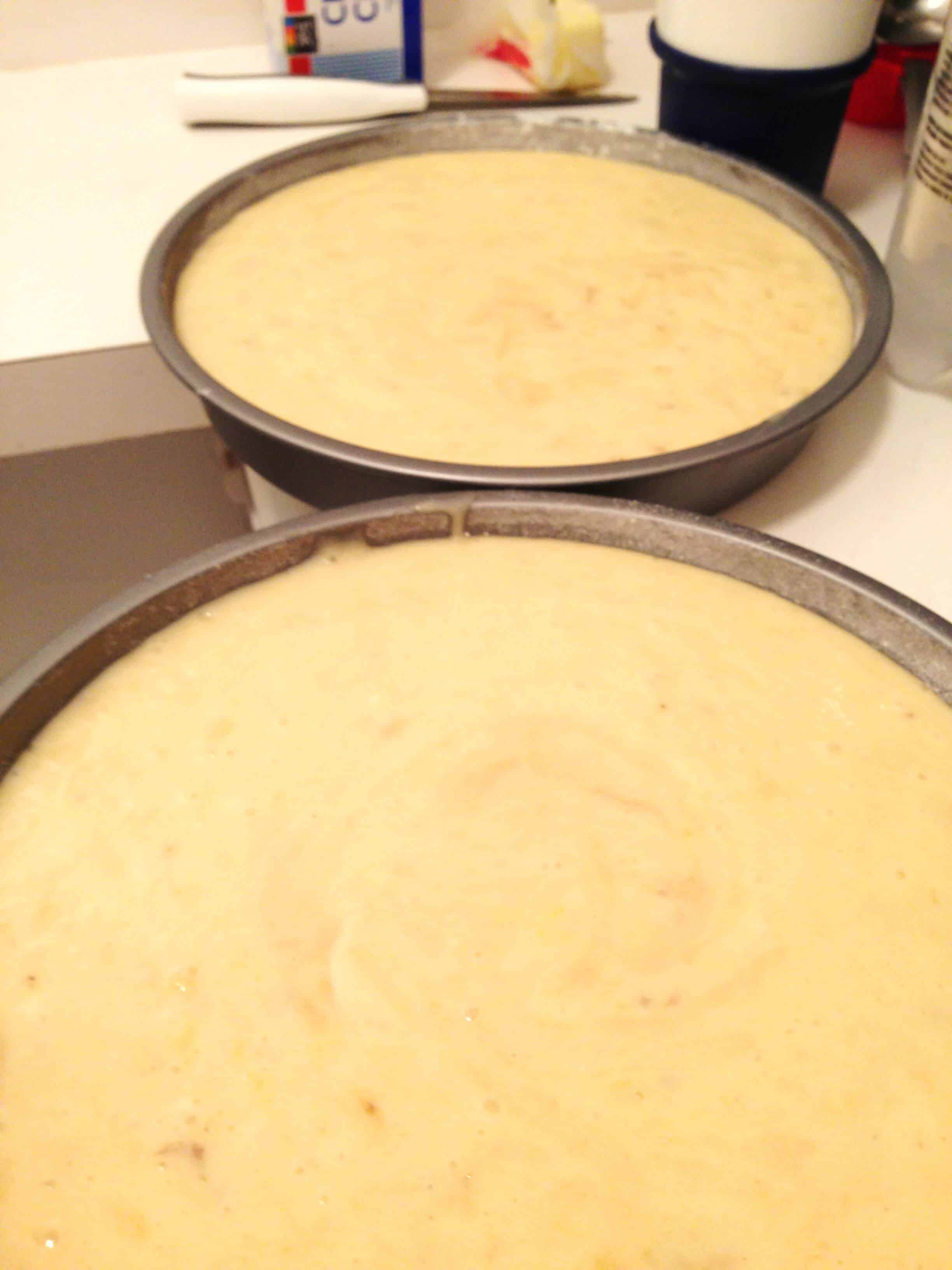 Like always I began by preheating my oven to 275°, and buttered, floured, and placed parchment paper circles in two nine inch circular cake pans. In a small bowl, I mixed the mashed banana with the lemon juice, and set it aside. In a medium bowl, I mixed the flour, baking soda and salt, then added eggs one at a time. In a large bowl, I creamed 3/4 cup butter and 2 1/8 cups sugar until light and fluffy, and then added the vanilla. I beat this butter mixture into the flour mixture alternately with the buttermilk, and then added in the banana mixture. I poured the batter into my prepared pan and baked them for about an one hour, until a toothpick inserted in center comes out clean.