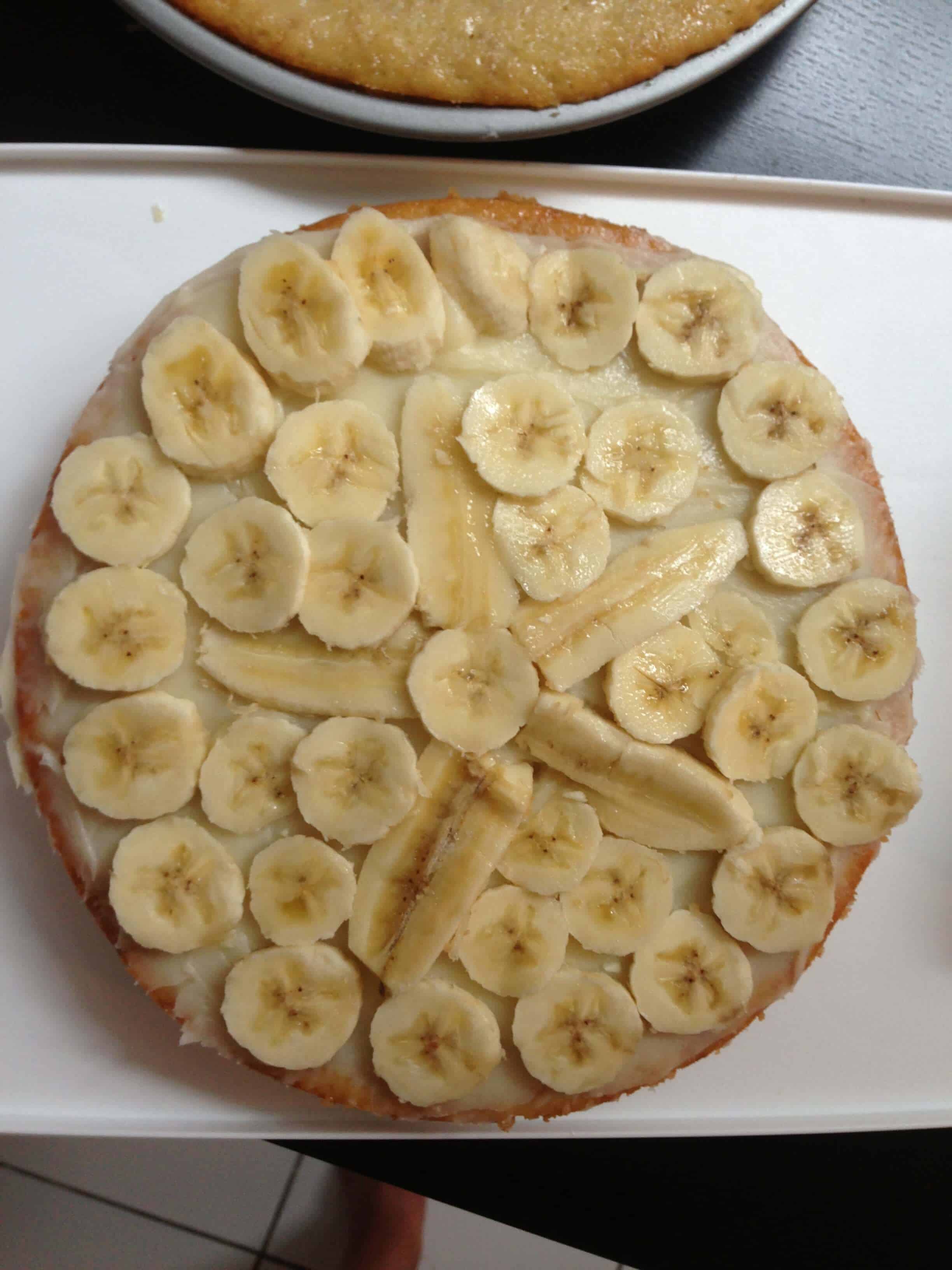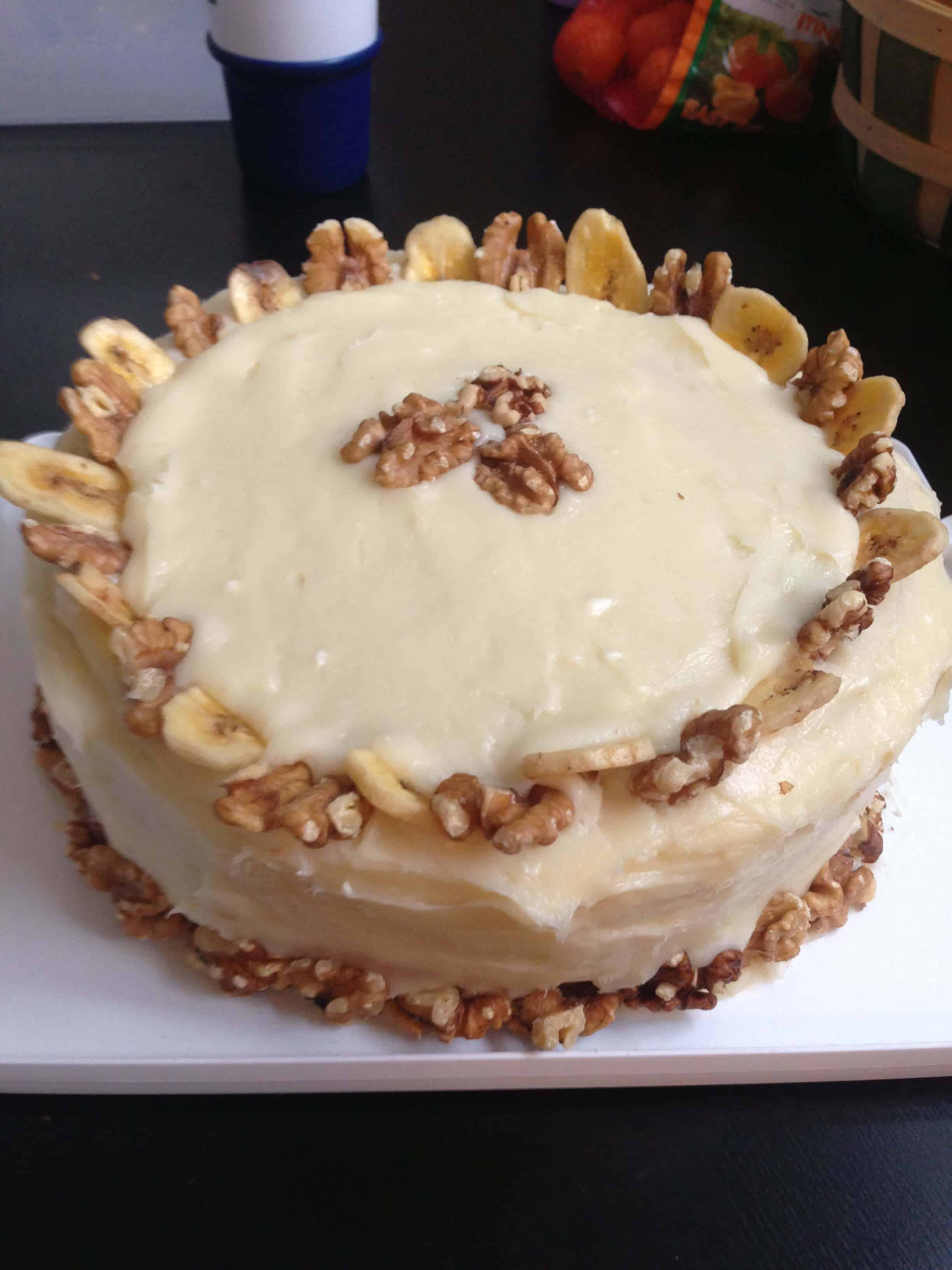 I then spread the icing on the cooled cake and added fresh banana slices between the layers (hence the name of the cake) and decorated the cake with walnuts and banana chips.