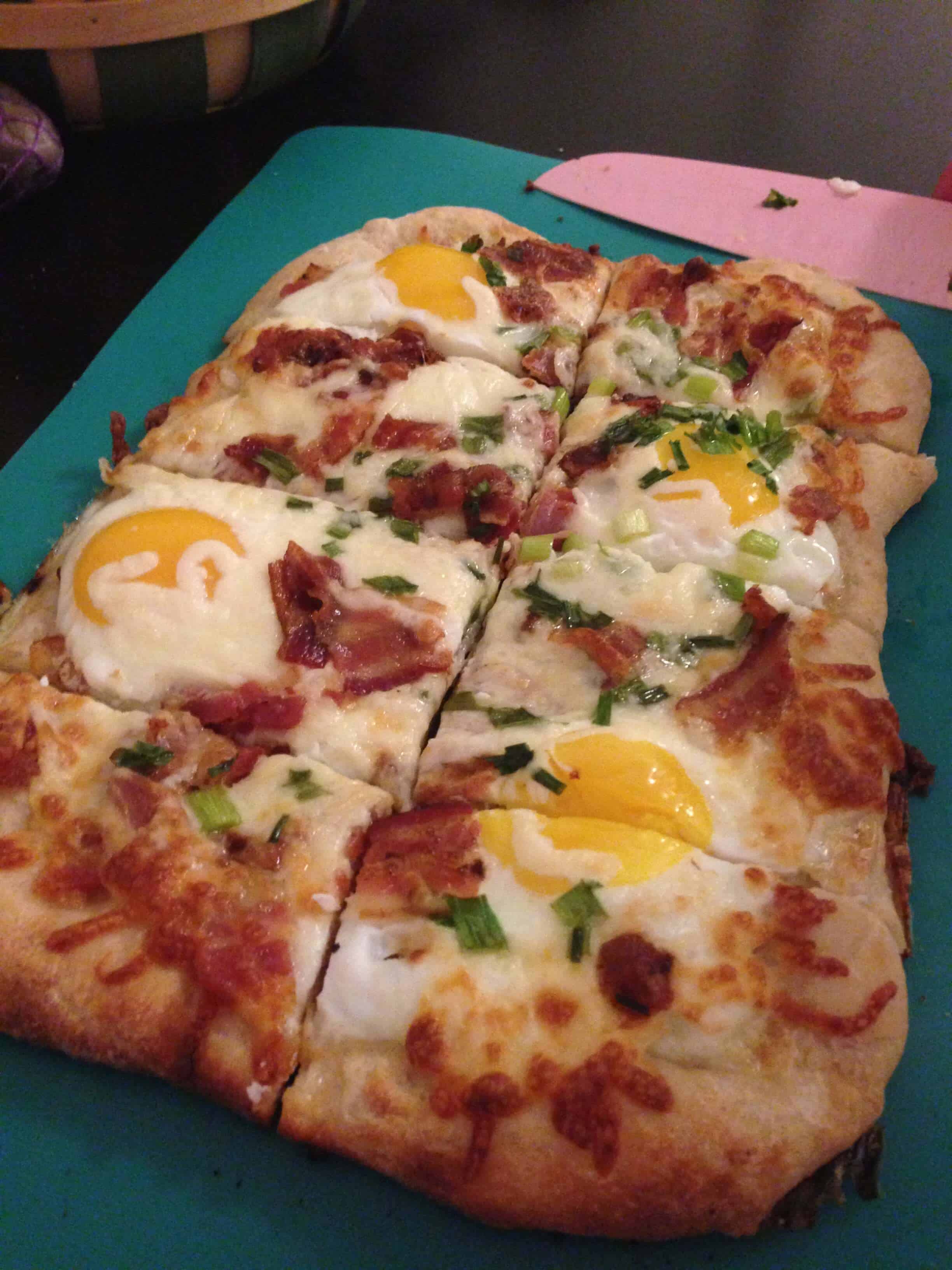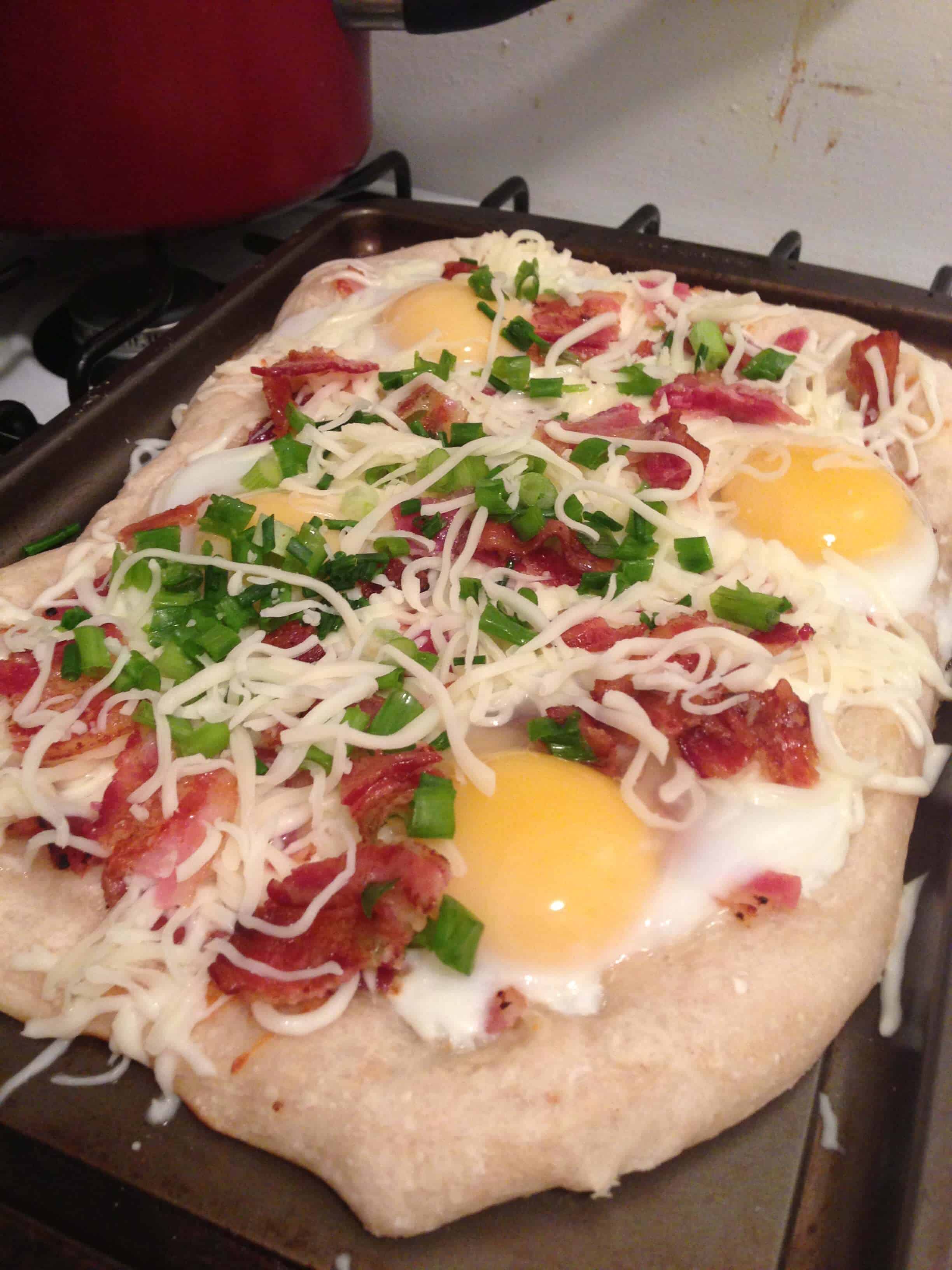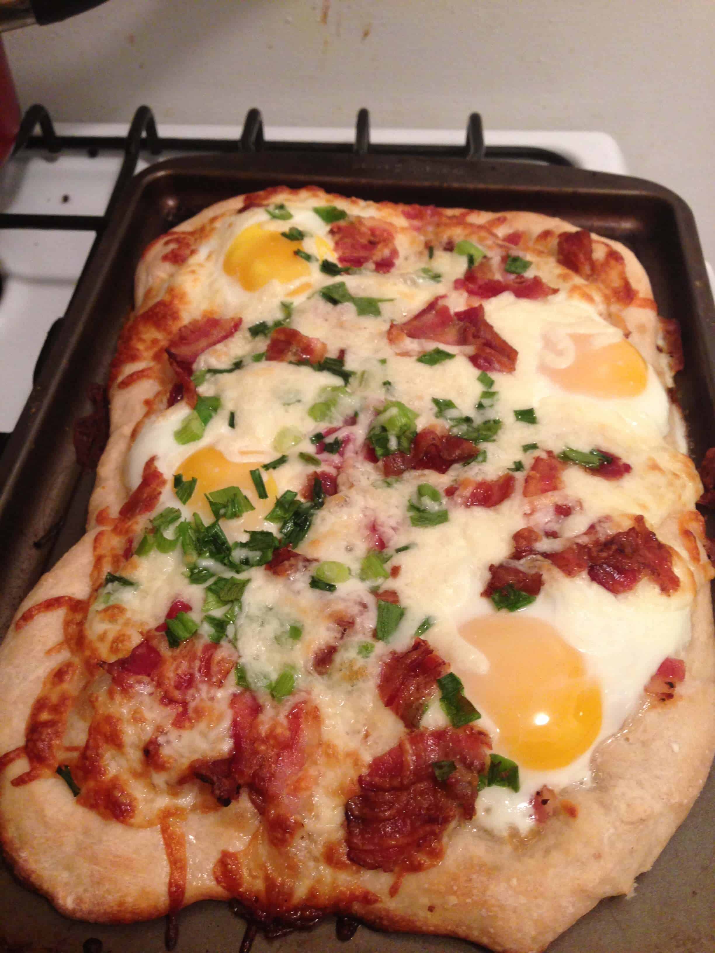年代tart by preheating the oven to 500 degrees and flour the cookie sheet for baking. Spread the pizza dough out, onto the floured cookie sheet, until it evenly covers the entire sheet, remembering that the dough will contract slightly during the cooking process. Then sprinkle half of the cheese and bacon onto the dough, and let this cook. After about 5 minutes in the oven, take the pizza out and crack the eggs on top. Put the pizza back in the oven and let it cook for another 2 minutes. Once the two minutes pass, sprinkle the pizza with scallions, chives, and the remaining bacon and cheese. Finally, pop the pizza back in the oven for another two minutes. Once the edges are golden brown, pull the pizza out and let it cool slightly before serving. It’s important you serve the pizza promptly because the eggs will continue to cook from the heat of the pizza.