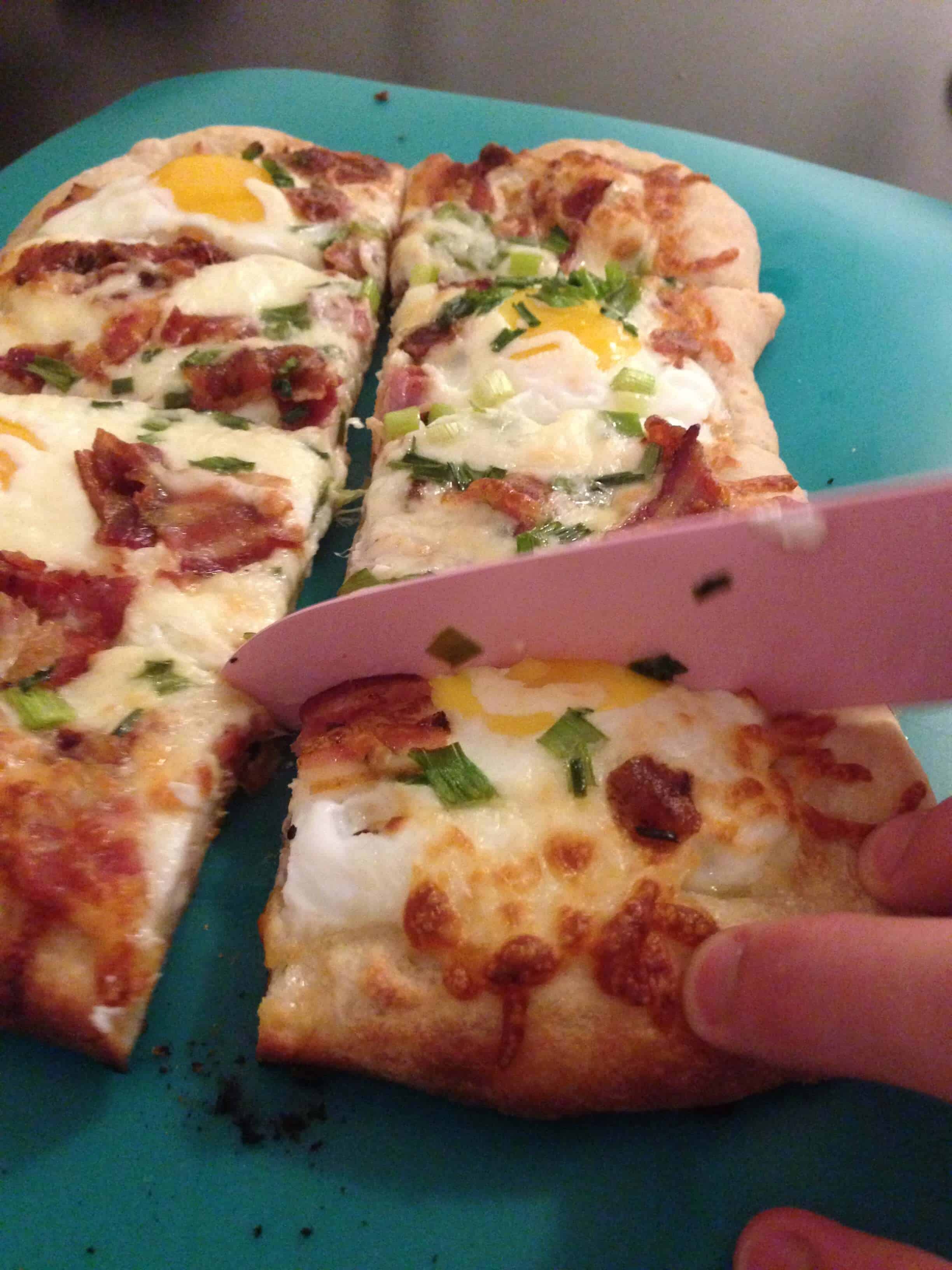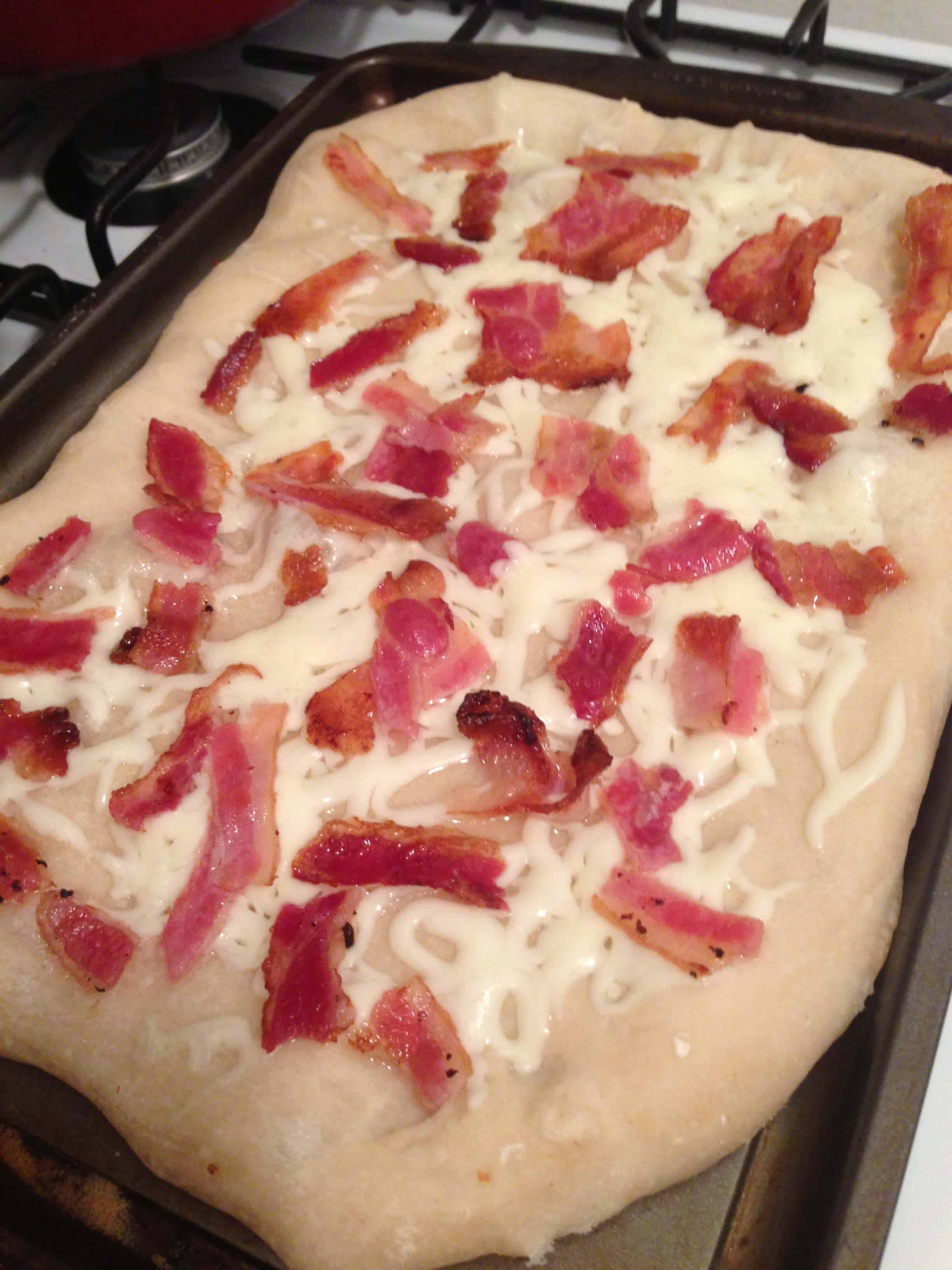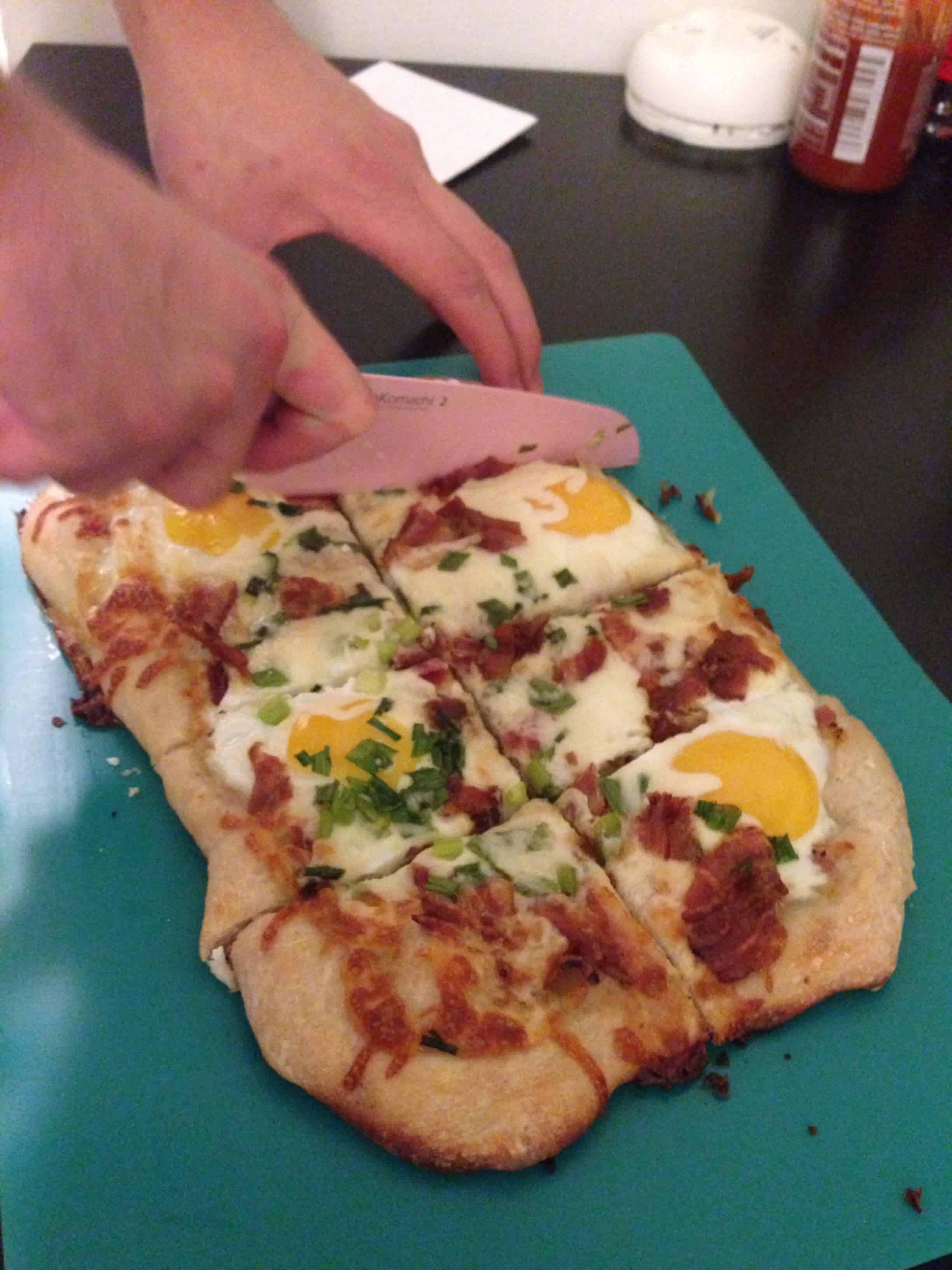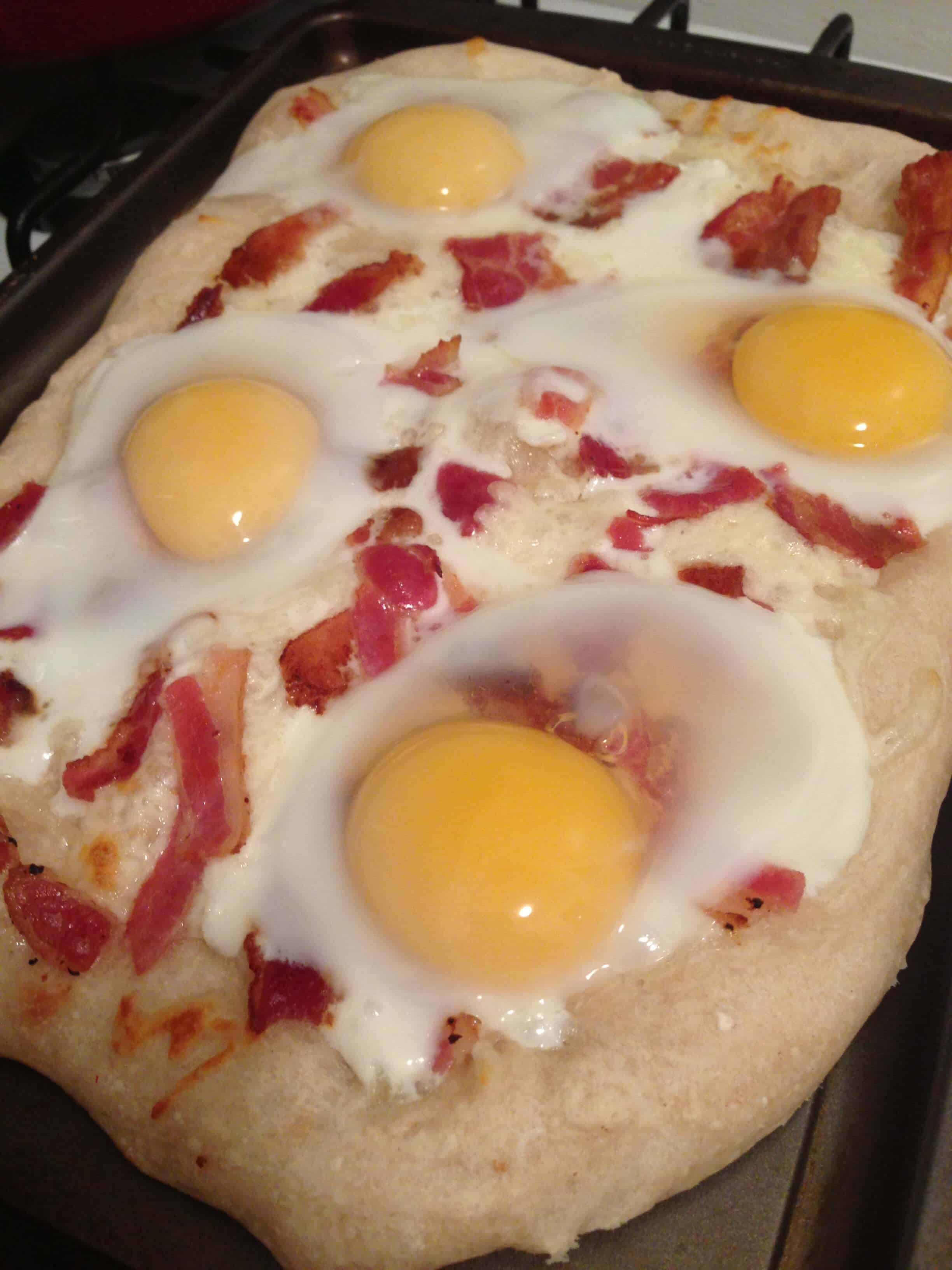 年代tart by preheating the oven to 500 degrees and flour the cookie sheet for baking. Spread the pizza dough out, onto the floured cookie sheet, until it evenly covers the entire sheet, remembering that the dough will contract slightly during the cooking process. Then sprinkle half of the cheese and bacon onto the dough, and let this cook. After about 5 minutes in the oven, take the pizza out and crack the eggs on top. Put the pizza back in the oven and let it cook for another 2 minutes. Once the two minutes pass, sprinkle the pizza with scallions, chives, and the remaining bacon and cheese. Finally, pop the pizza back in the oven for another two minutes. Once the edges are golden brown, pull the pizza out and let it cool slightly before serving. It’s important you serve the pizza promptly because the eggs will continue to cook from the heat of the pizza.