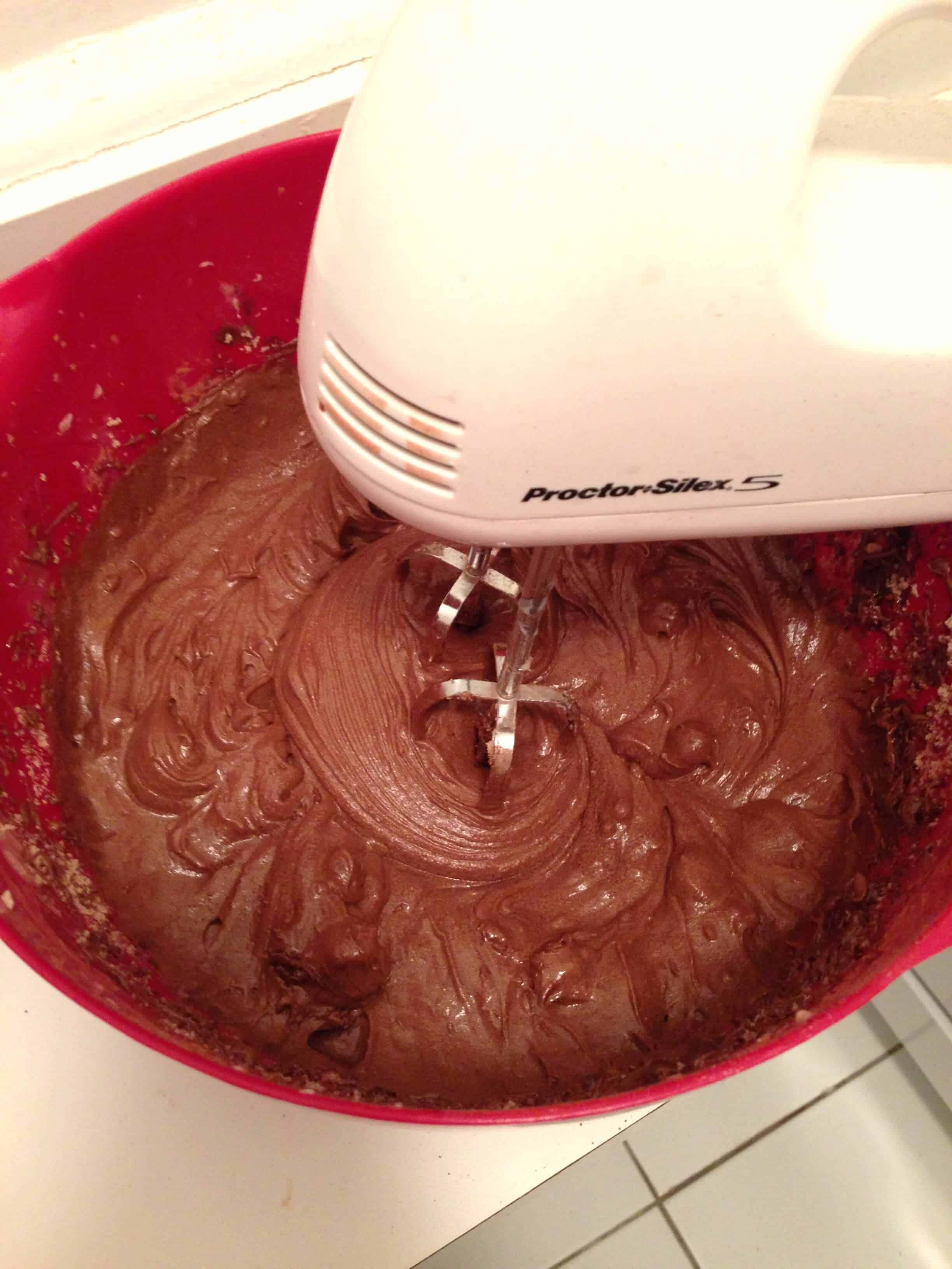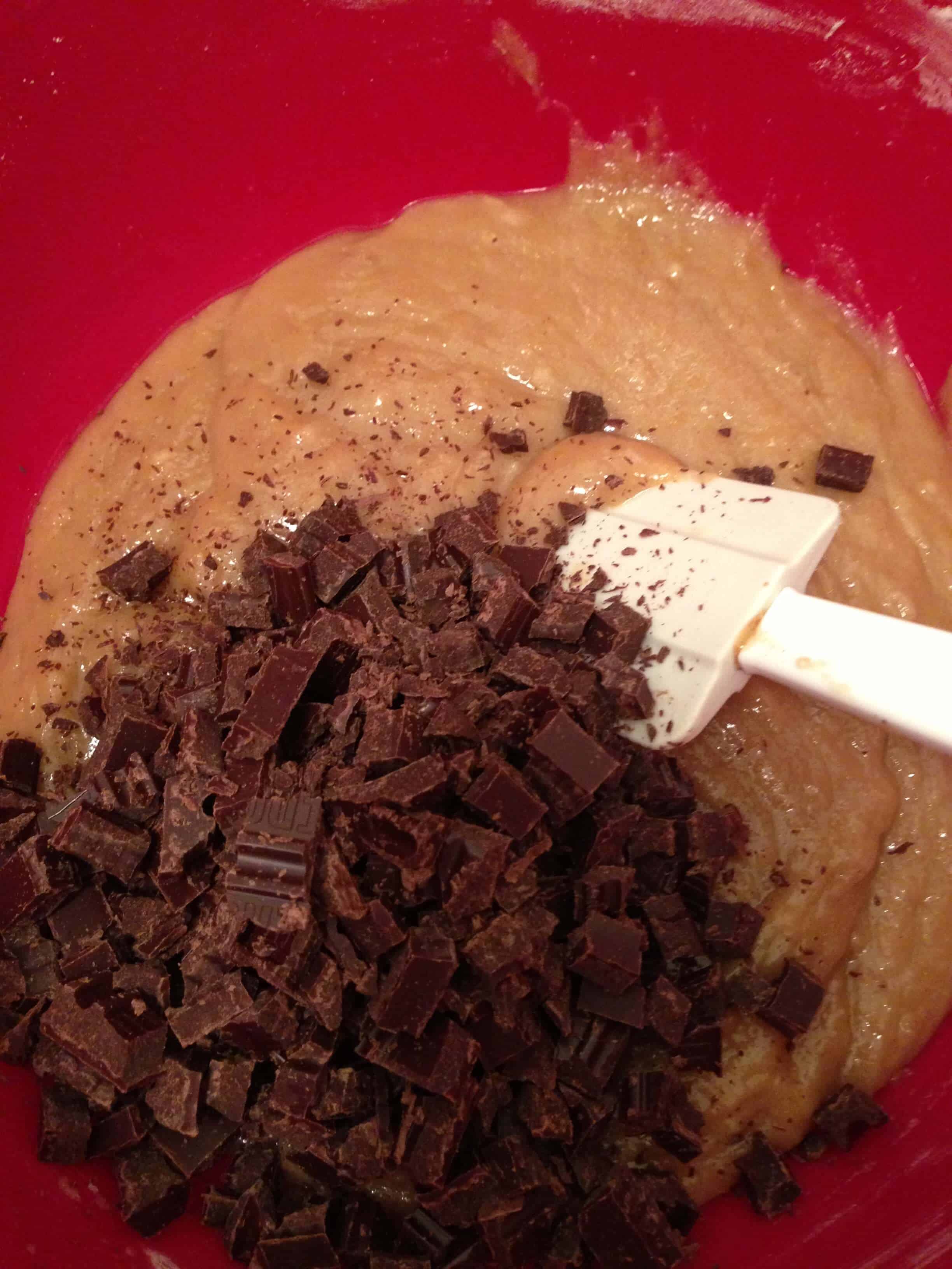 而加热该糖的第二时间,破解4个鸡蛋打入碗内,并与可可粉,盐打他们,发酵粉,咖啡粉,和香草直至完全混合。慢慢倒入热黄油/糖混合物倒入鸡蛋,搅拌至光滑。一旦所有的湿成分相结合,拌入面粉和巧克力片,再搅拌,直到顺利。