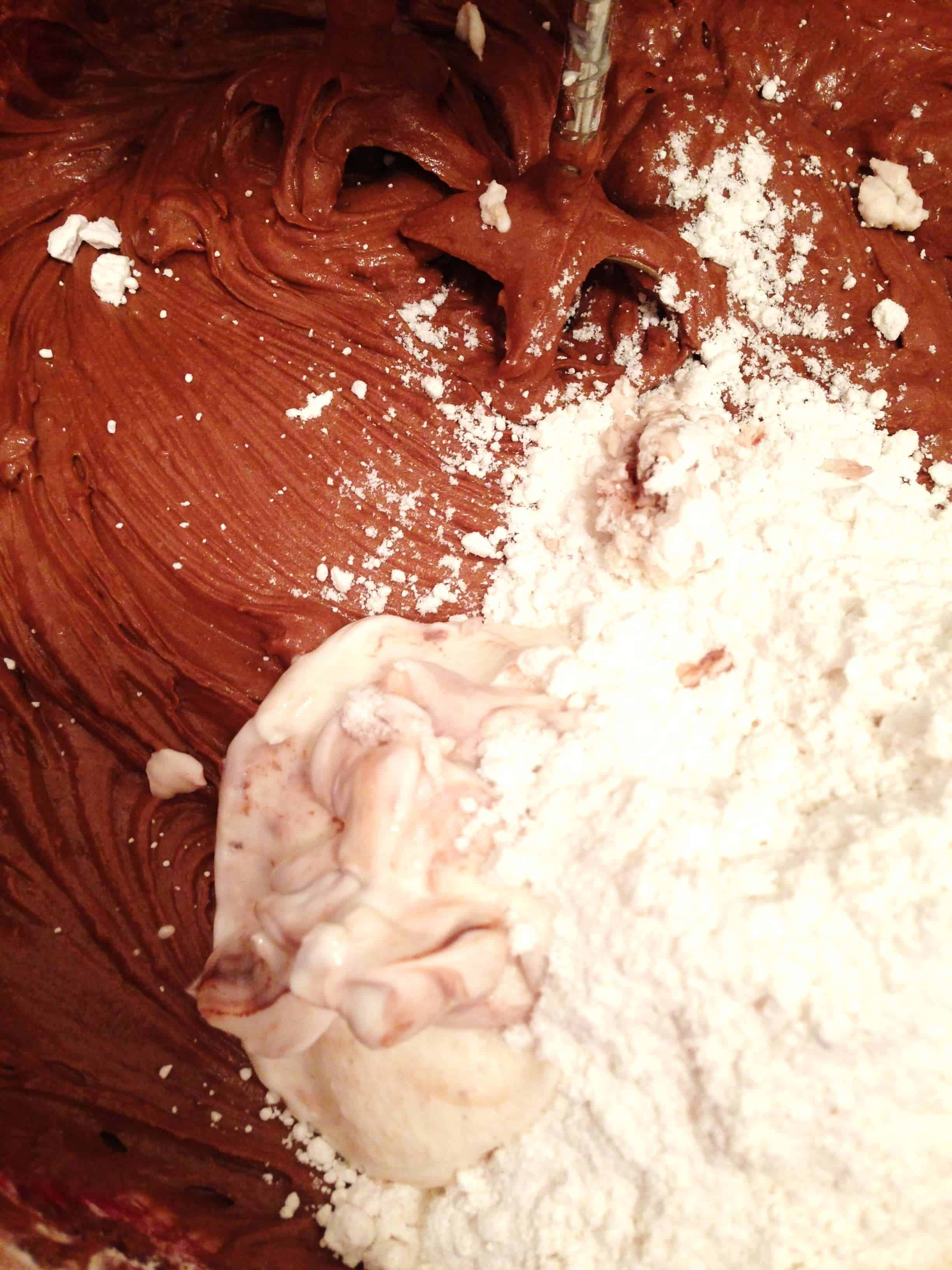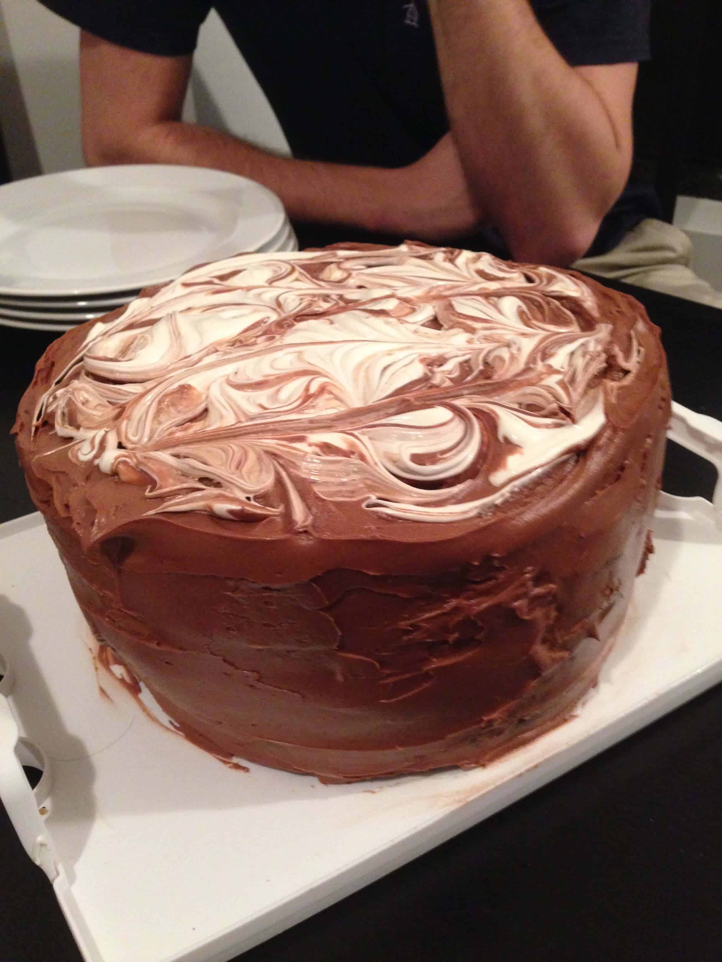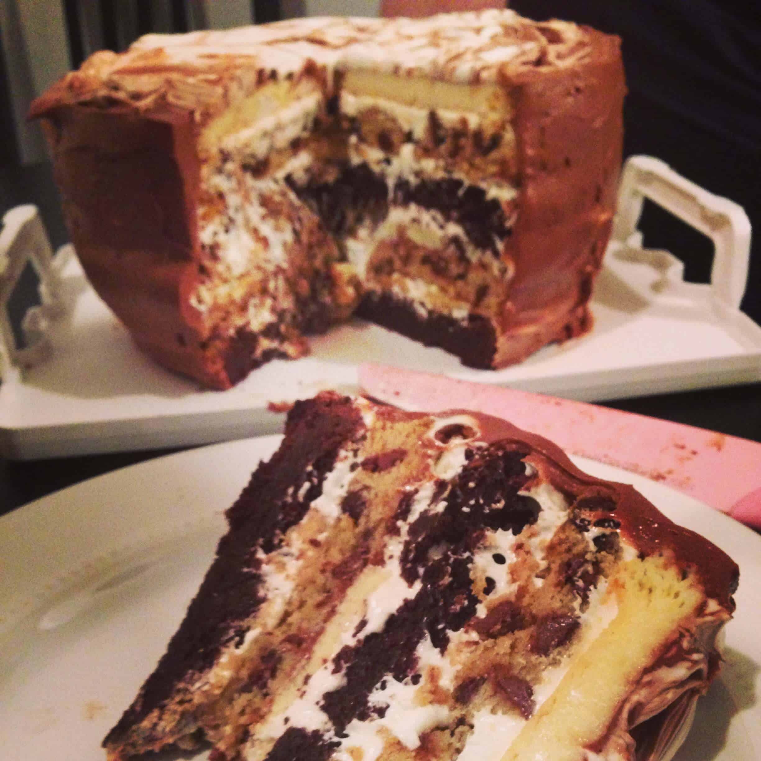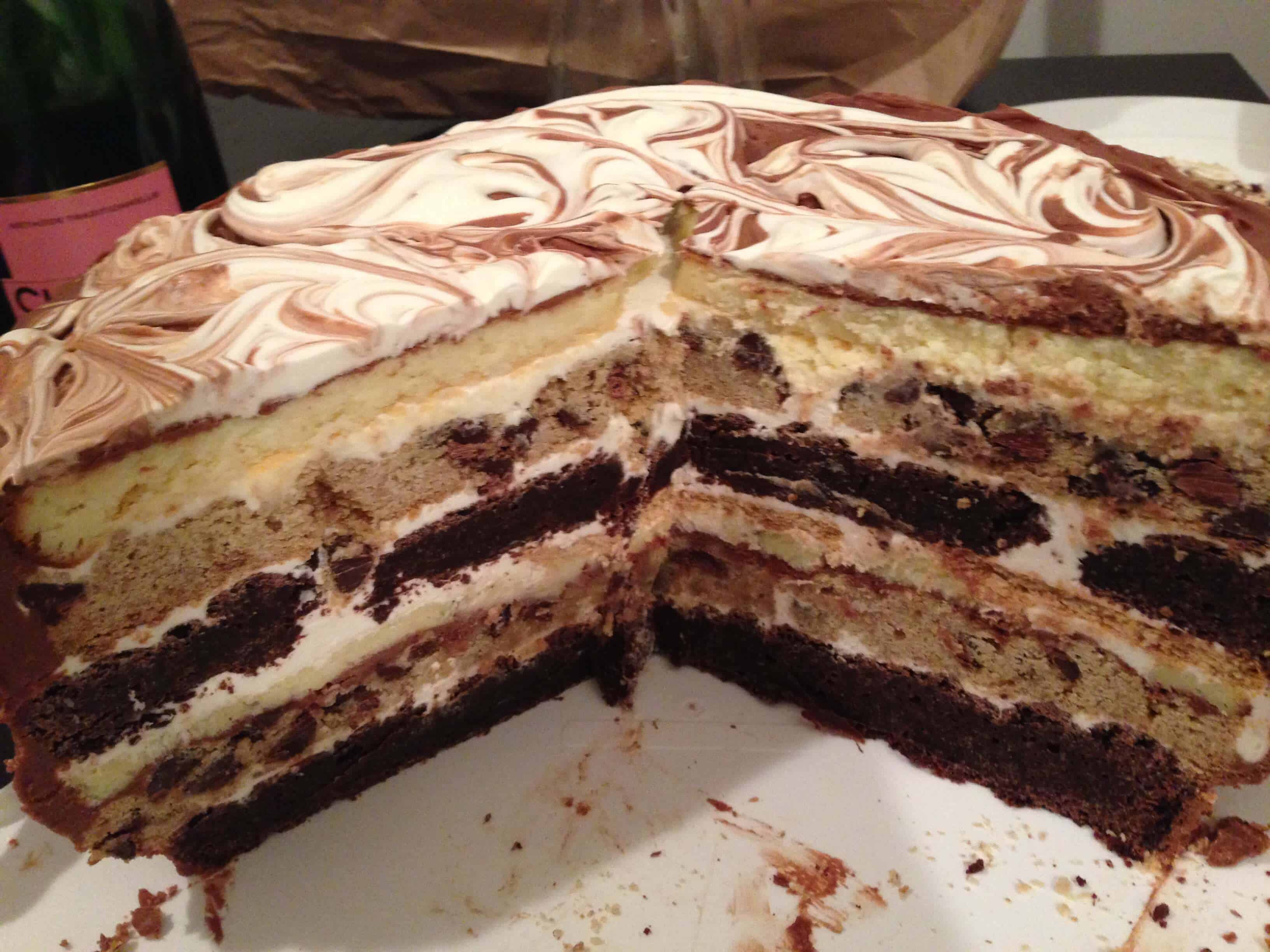 把剩下的巧克力软糖糖霜撒在蛋糕的顶部和侧面,然后用剩下的棉花糖糖霜旋转顶部。蛋糕组装好后,冷藏至可以食用。这块蛋糕非常丰富,可能可以养活一支军队。层次的多样性看起来有点疯狂,但它们在一起味道很好。我们都很喜欢它…而且在