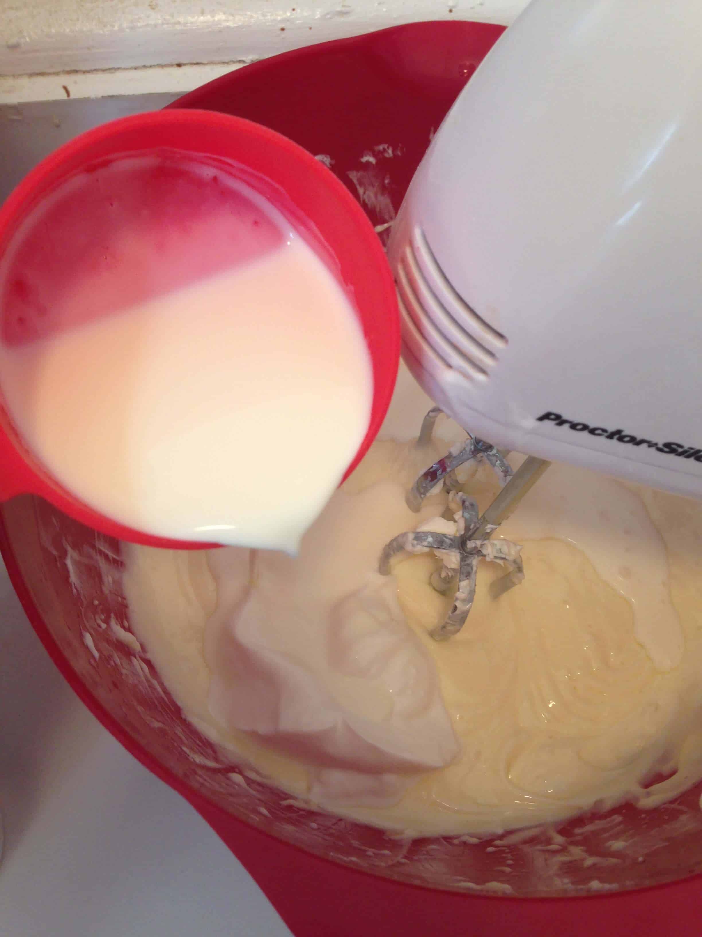 将所有成分在一个大碗里,用手动打蛋器组合,直到顺利。
