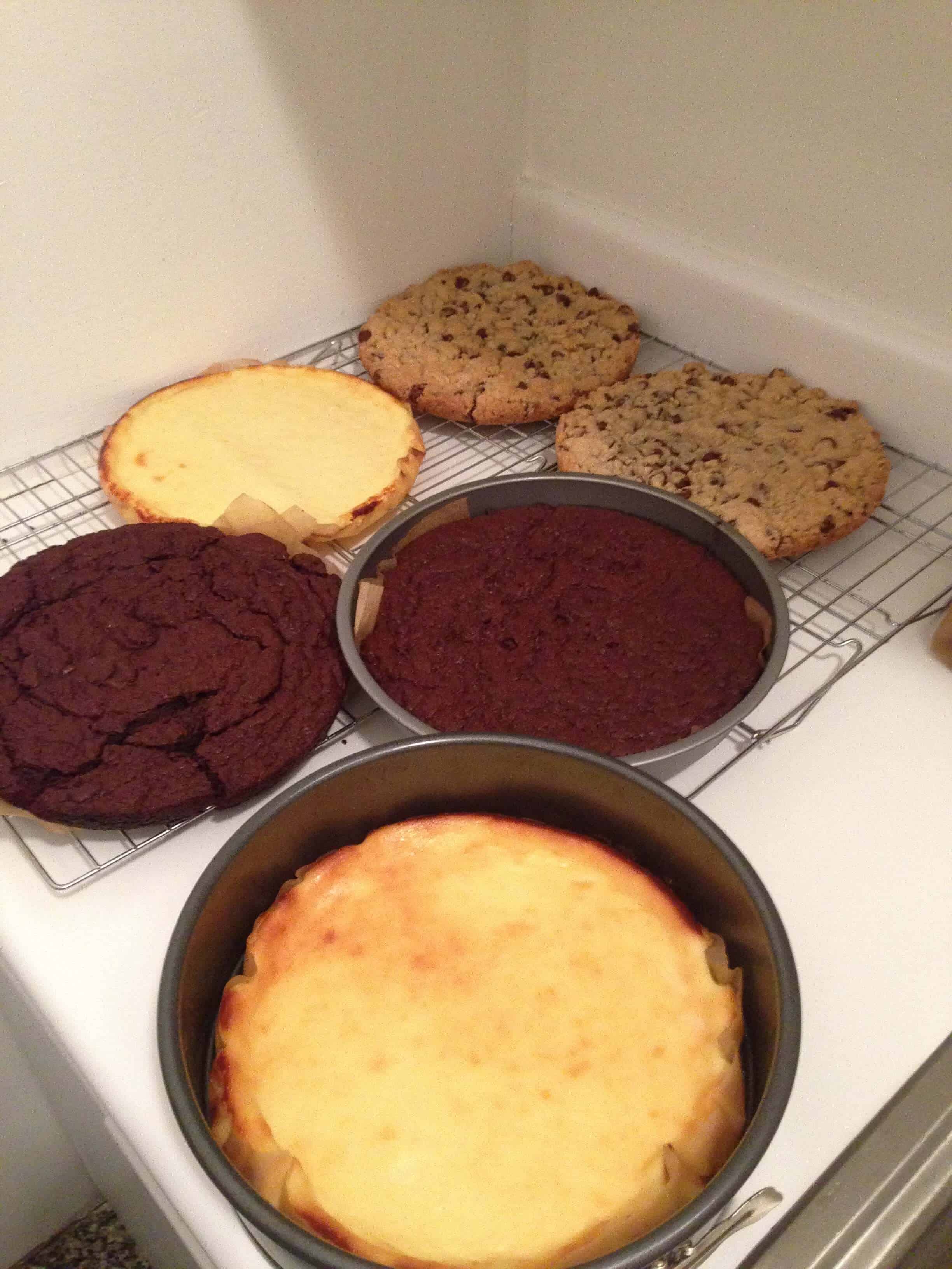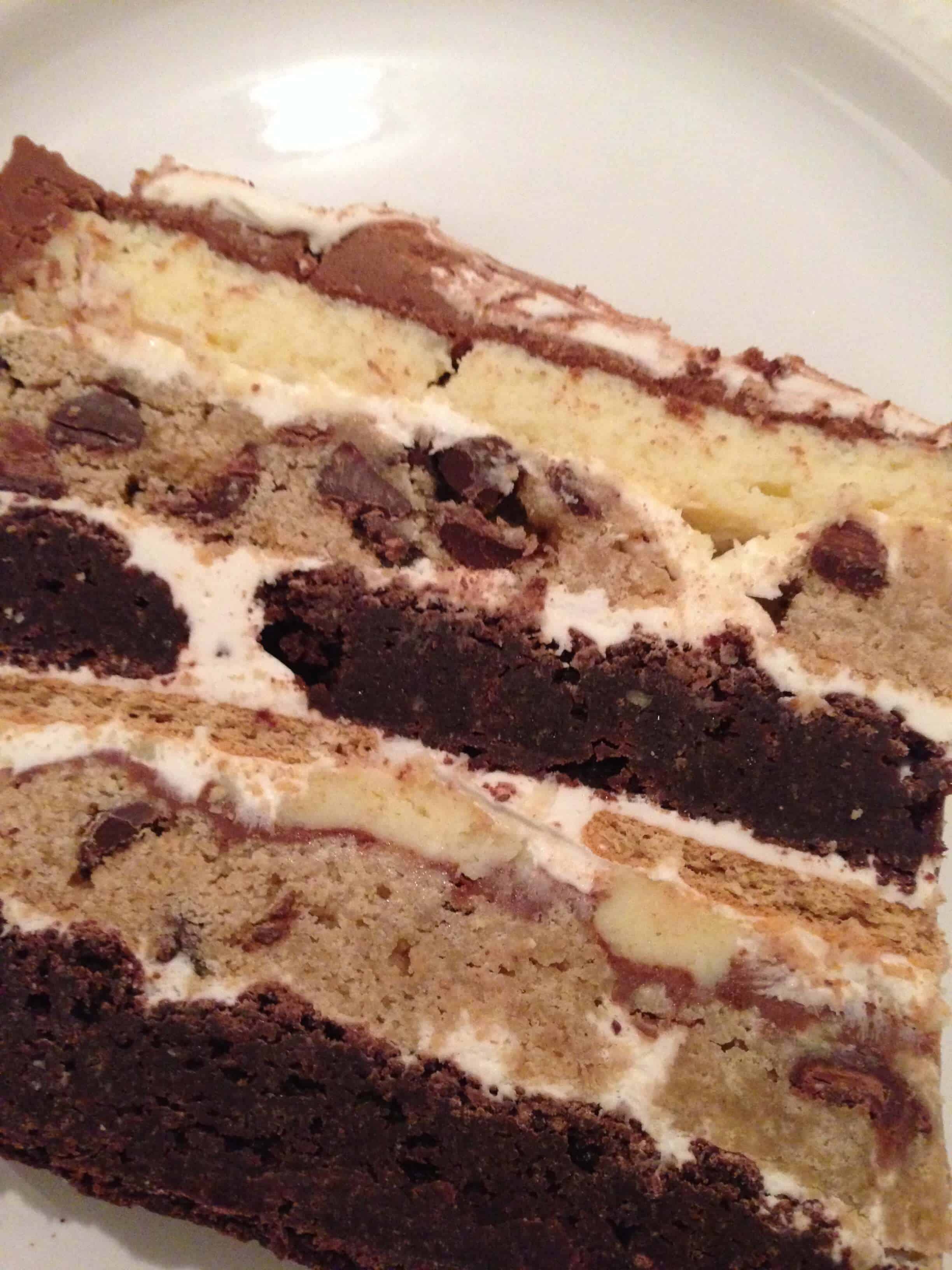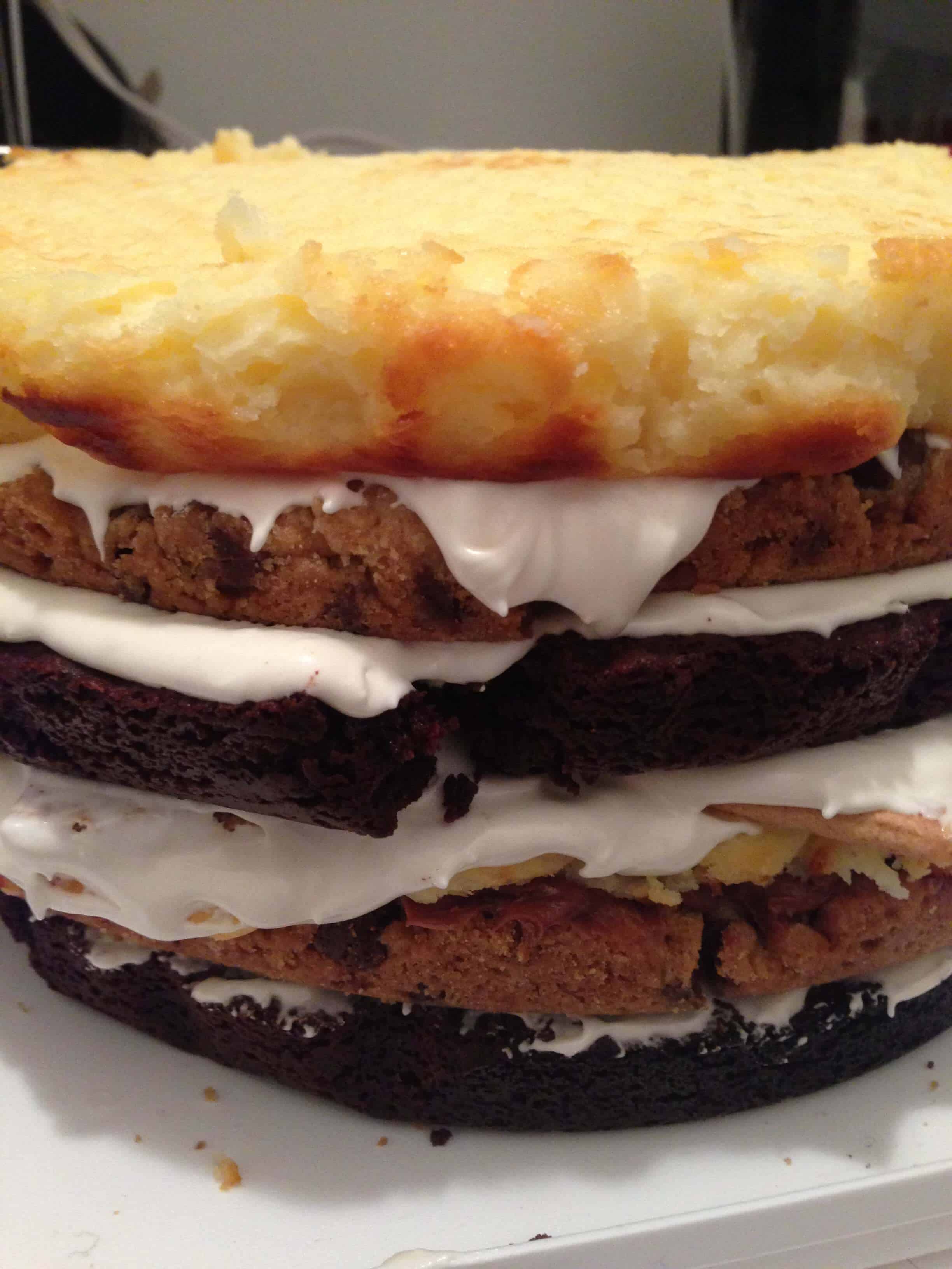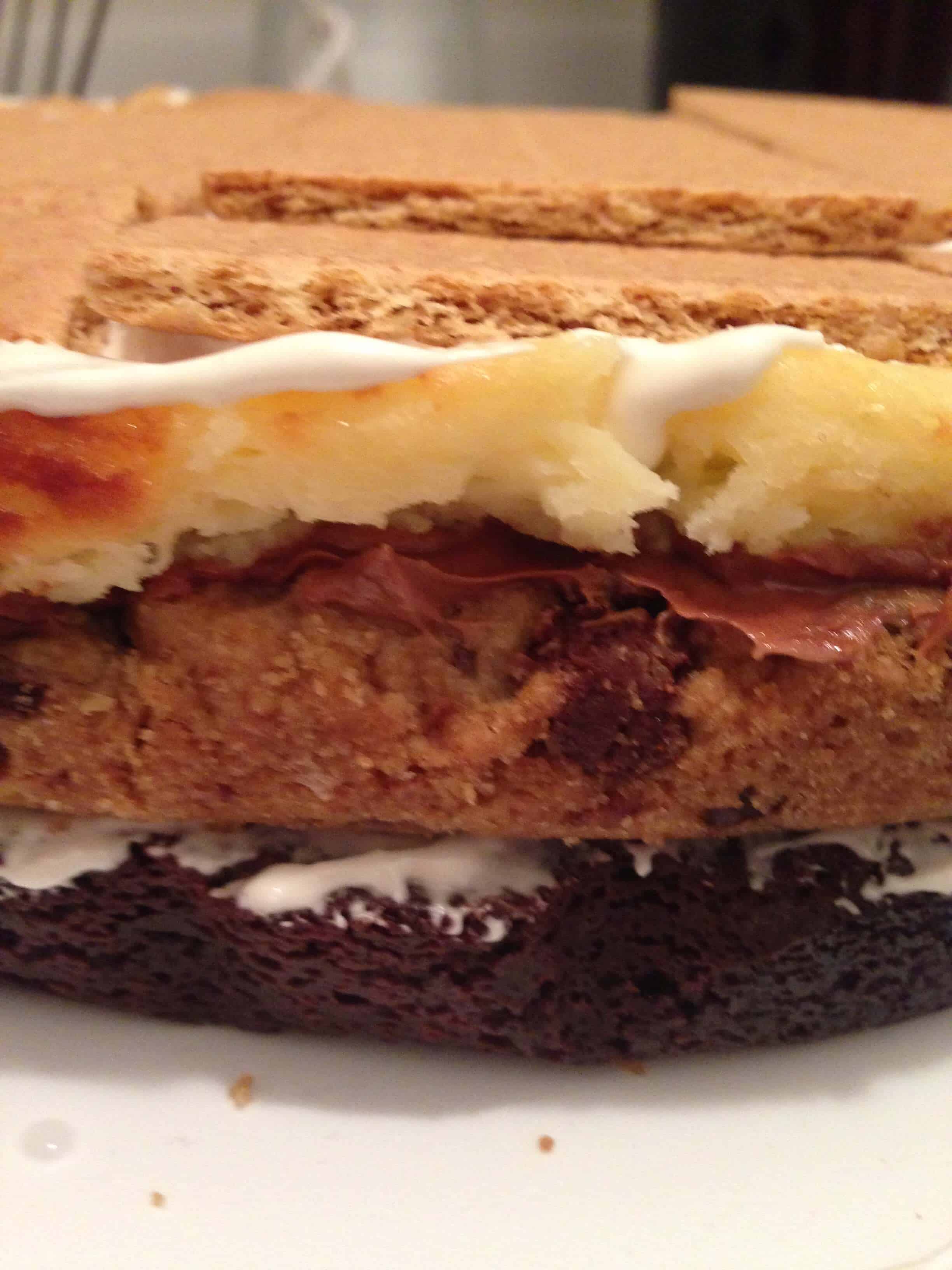 The past few weeks have been phenomenal. I saw my sister marry the love of her life, spent a week in a tropical paradise, then another week at home in Seattle. I also moved to a new apartment! In the midst of all of this, I was out of town for Alan’s birthday and only now have had the time to actually make him a cake. The only way I could make up for this was to make an epic birthday cake. Alan loves anything s’mores related, so I decided to make him a massive s’mores cake It has seven different layers: 2 brownie layers, 2 cheesecake layers, 2 chocolate chip cookie layers, and 1 graham cracker layer. The final product seems a little intense, but it is worth it. I baked each of the layers in the order shown below.