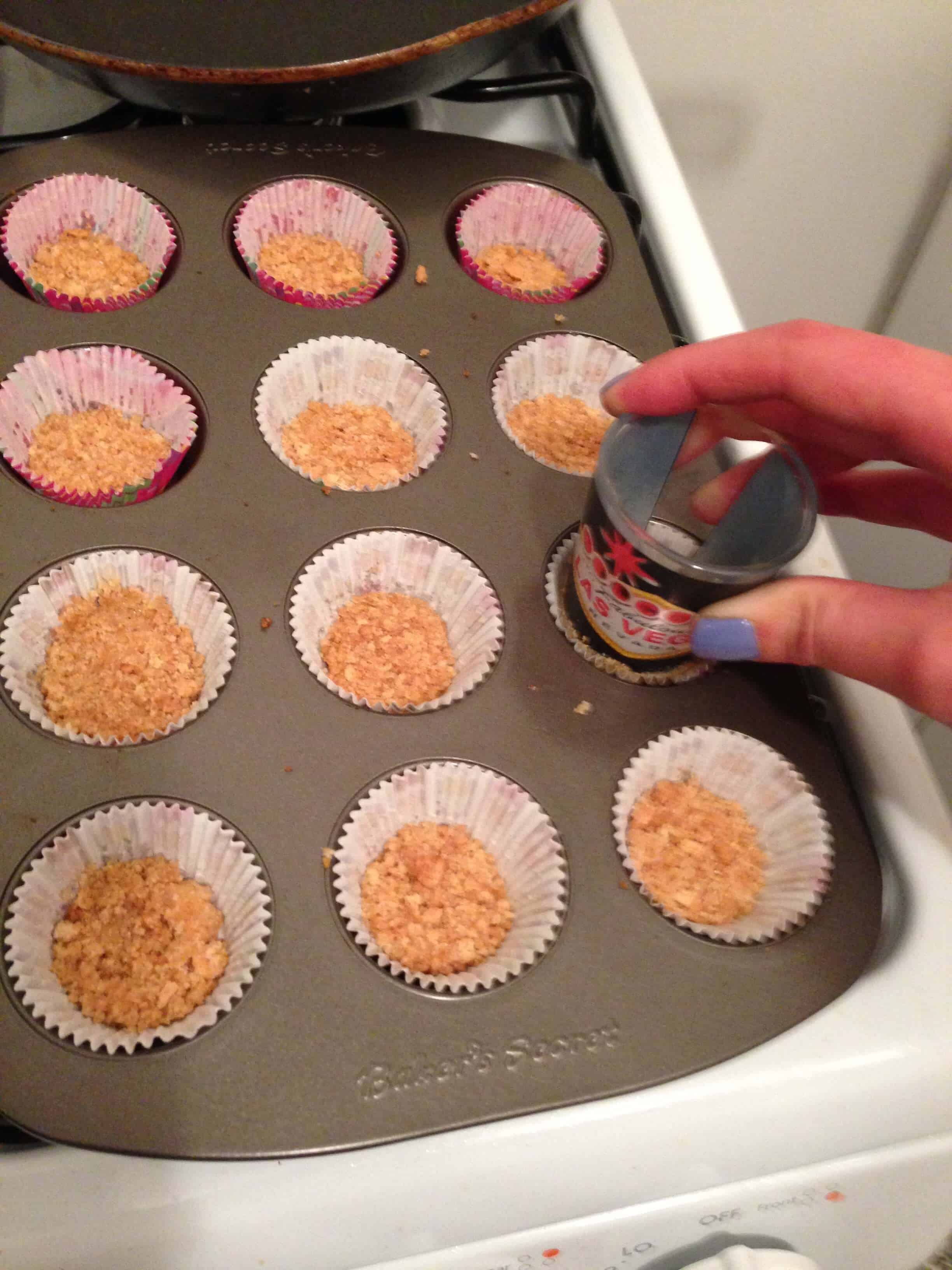 将烤箱预热到350华氏度,在纸杯蛋糕罐里放上烘焙杯。把一套全麦饼干压成细碎。如果有的话,你可以用食品加工机,或者干脆把饼干放在自封袋里,用一个扁平的东西压碎它们。我用的是一个金属杯的底部。将面包屑倒入一个中等大小的碗中,加入融化的黄油和糖。搅拌直到面包屑均匀地涂上黄油,然后将一汤匙的混合物放入每个纸杯蛋糕内衬中(迷你纸杯蛋糕用一茶匙)。用小玻璃杯(或其他平底物体)将全麦饼干屑压在每个衬垫上形成面包皮。烤5分钟,然后完全冷却,让面包皮变硬。