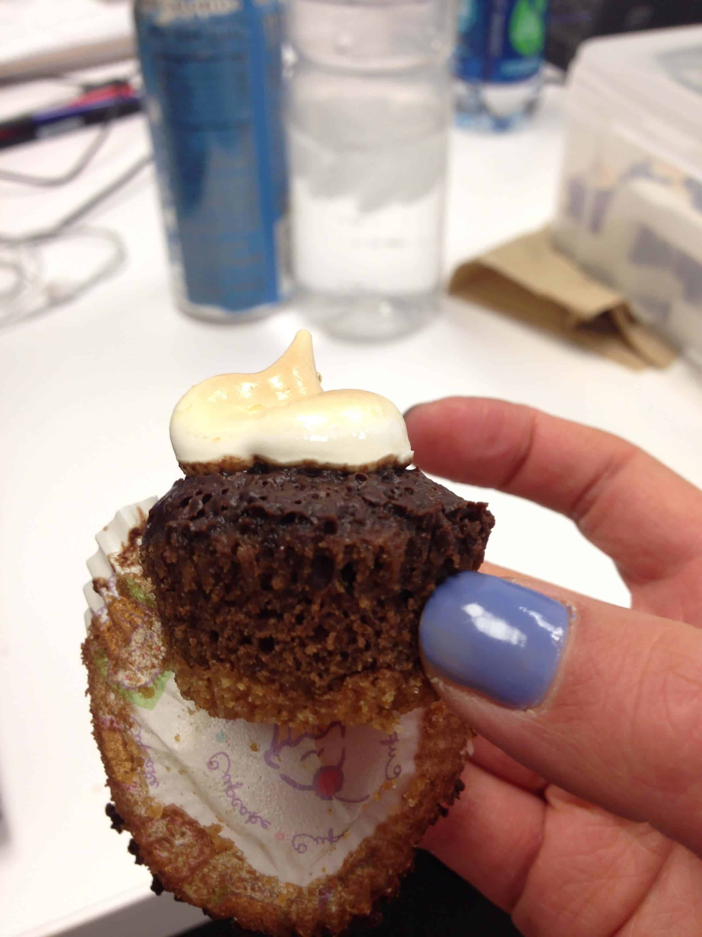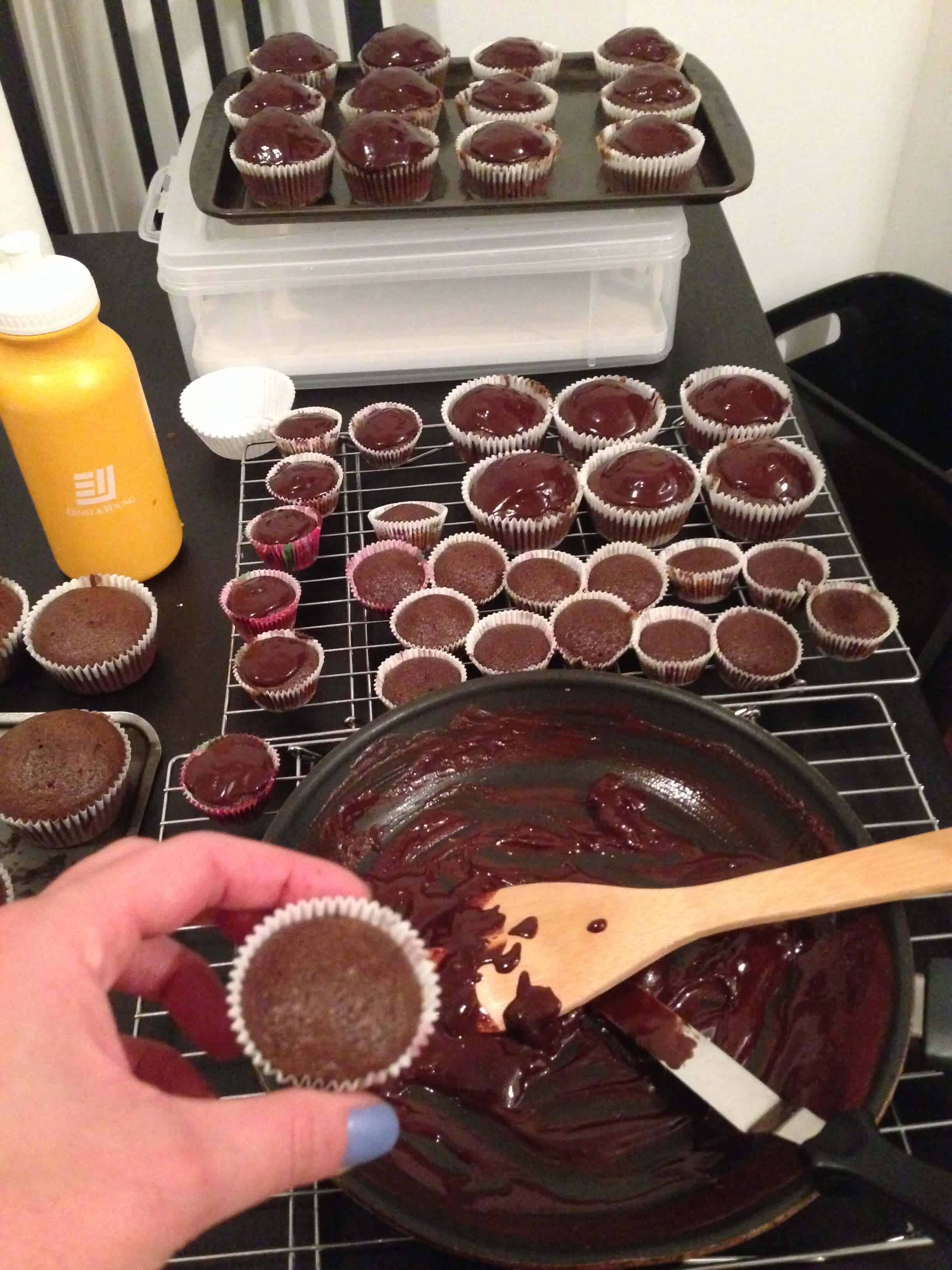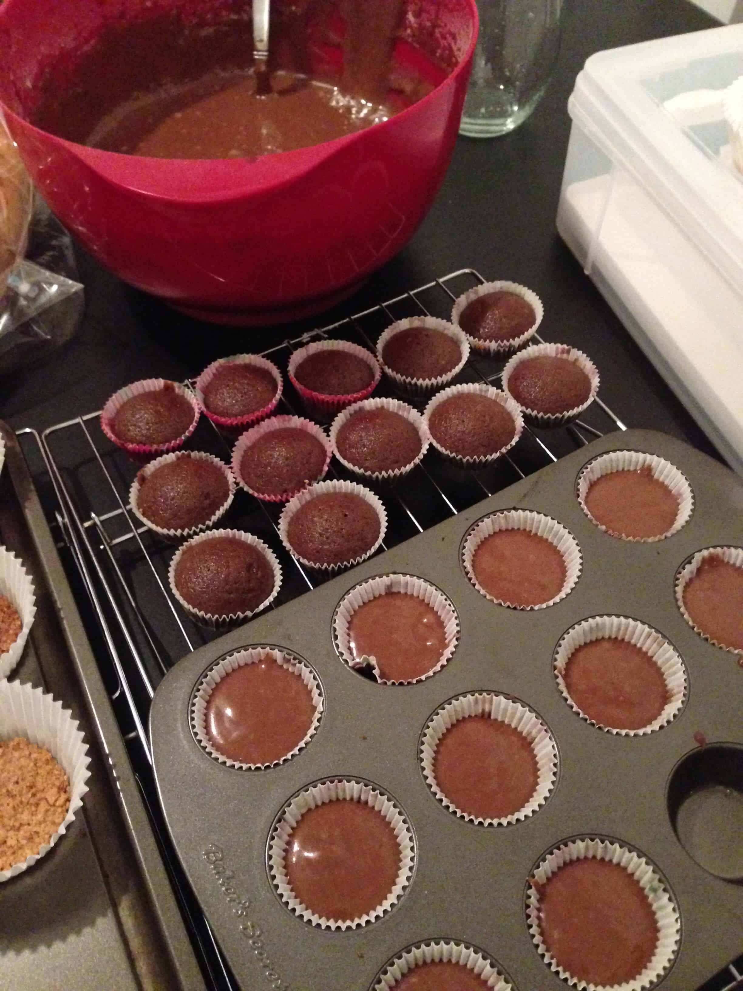 当全麦饼干的外皮在烘烤的时候,开始做面糊。在一个大碗里,将面粉、糖、可可粉、小苏打、泡打粉和盐搅拌均匀。加入鸡蛋、咖啡、白脱牛奶、植物油和香草精,中速搅拌2-3分钟,直到所有材料完全融合。面糊会比普通的蛋糕面糊更稀。将每个纸杯蛋糕内衬填满2/3,烤15-18分钟(对于迷你纸杯蛋糕来说大约10分钟),或者用牙签插入蛋糕中,取出时干净且有一些面包屑。让纸杯蛋糕冷却后再加糖霜。
