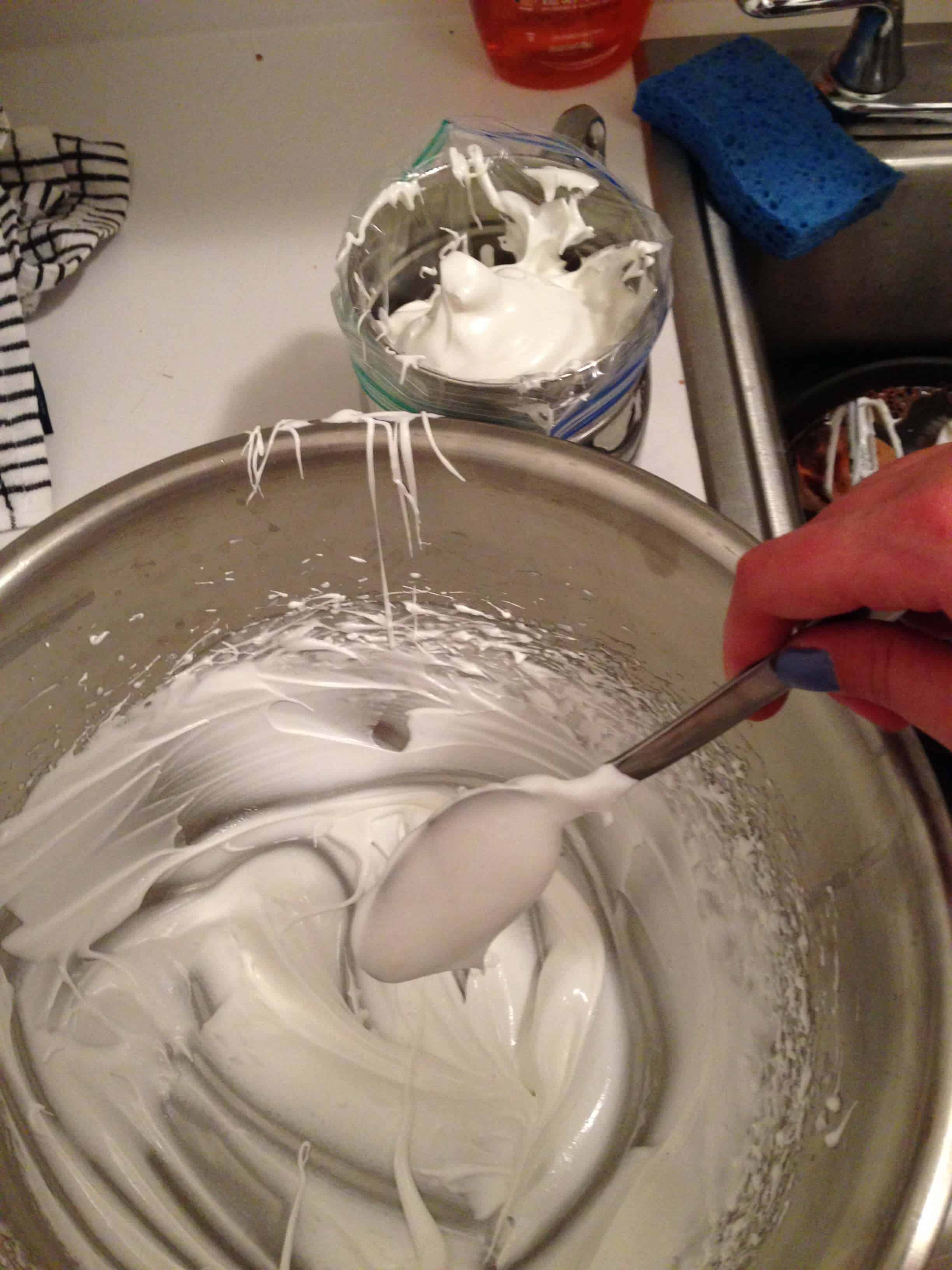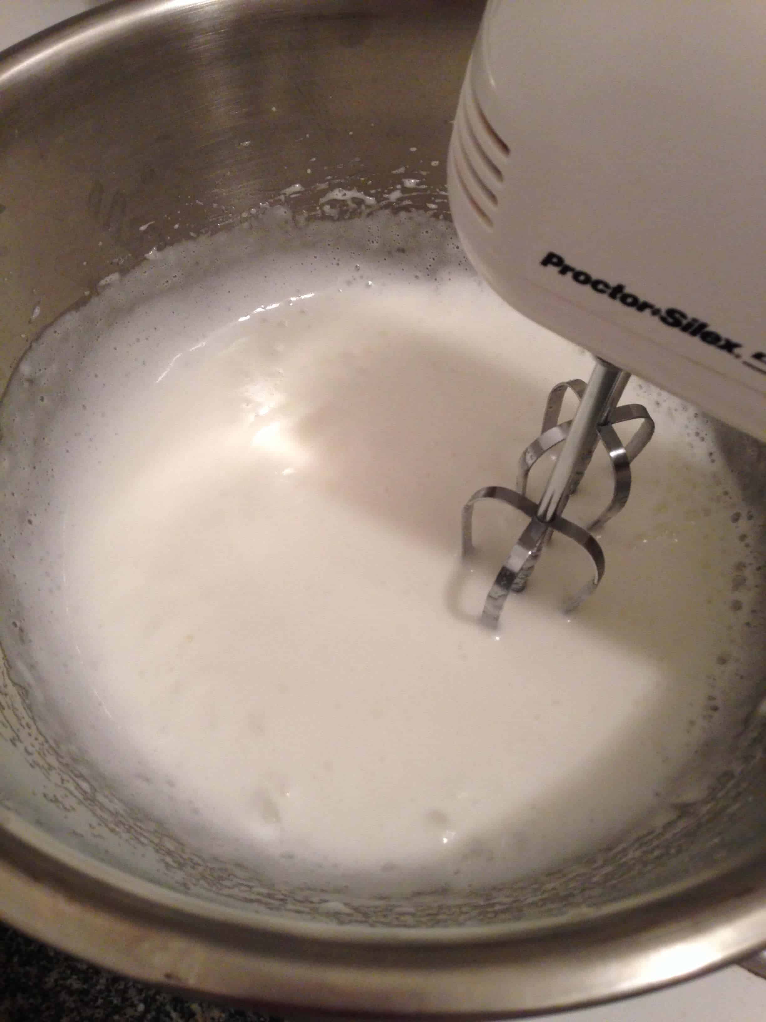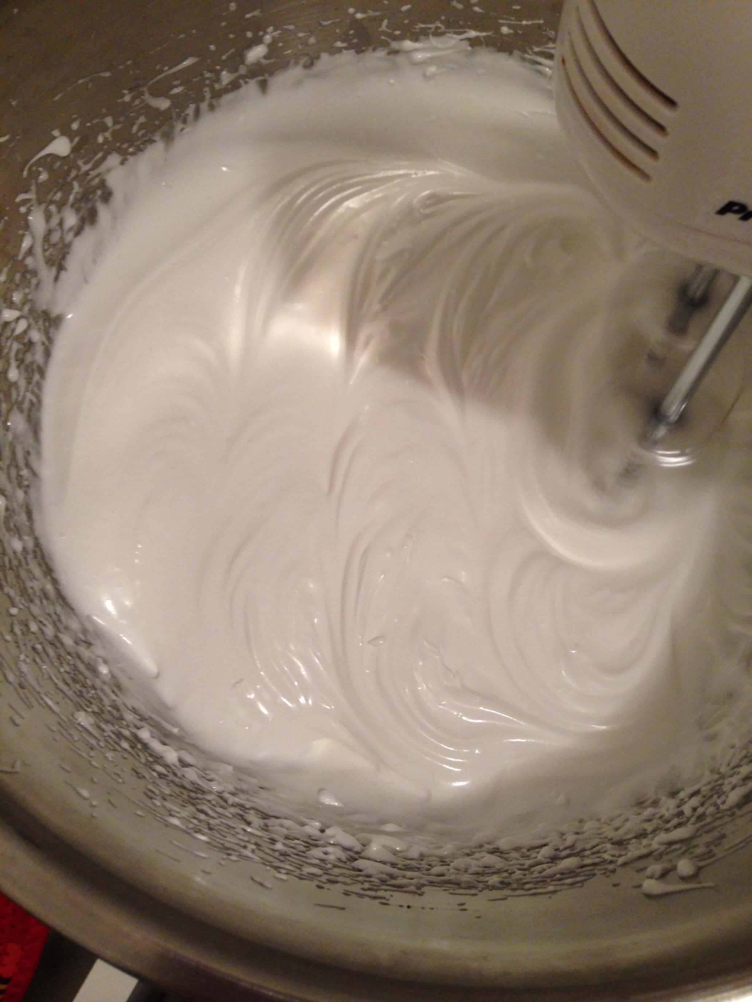 在双层蒸锅中,搅拌蛋白和糖,直到糖完全溶解,蛋白摸起来温暖,大约2-3分钟。从火上移开,继续搅拌直到蛋清变硬变亮(大约5分钟)。