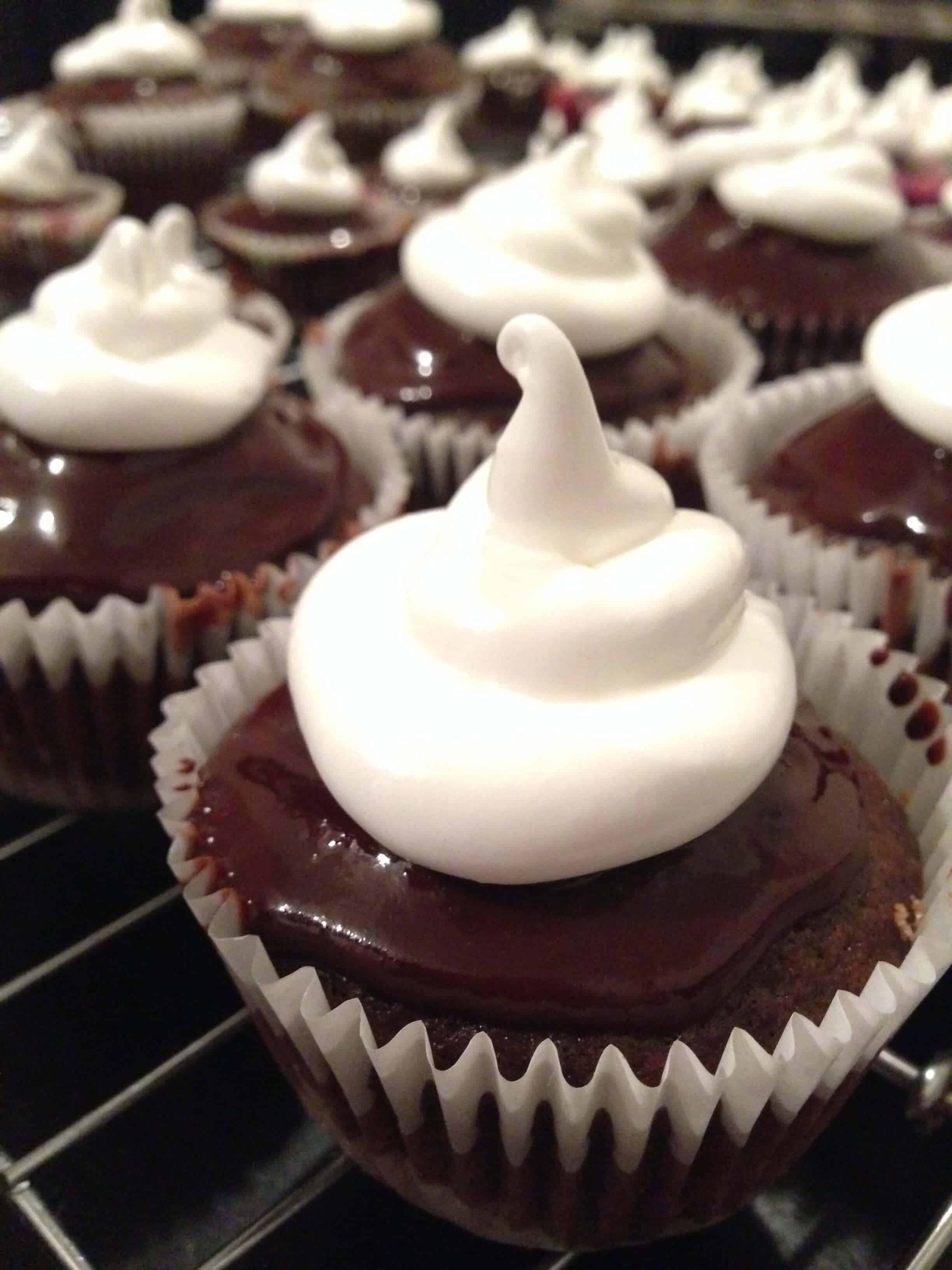 用刀或抹刀在每个纸杯蛋糕上涂上一层厚厚的巧克力酱,将巧克力延伸到纸杯蛋糕的边缘。让它凝固几分钟。将蛋白霜装入一个密封的大塑料袋,剪掉边角,放到纸杯蛋糕上。