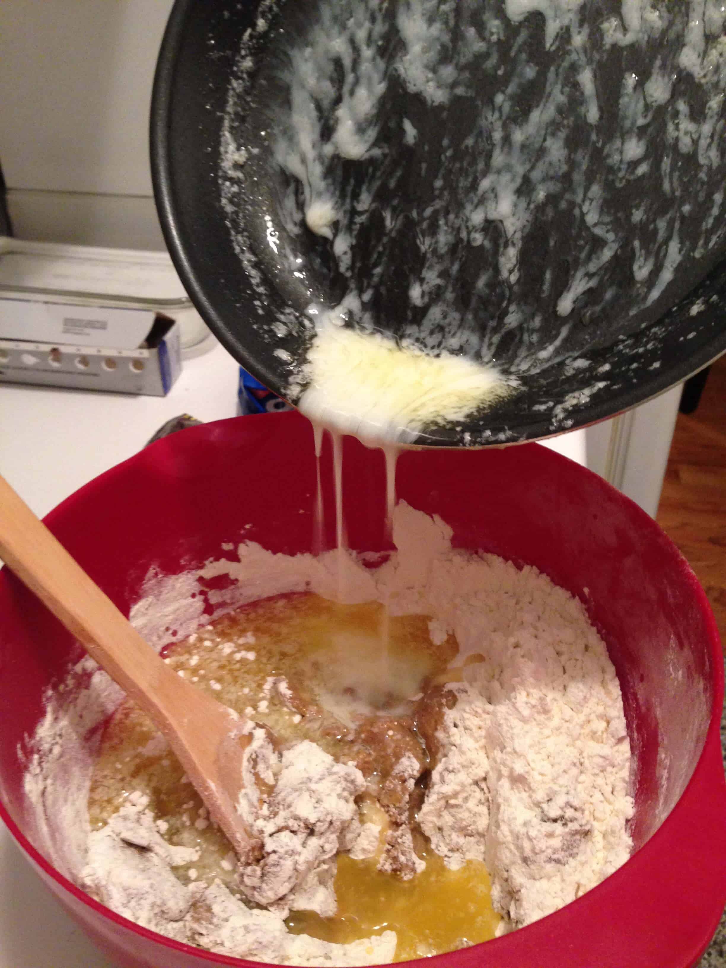 烤箱预热到350华氏度。用低温融化黄油,然后冷却。把鸡蛋打入一个大的搅拌碗,加入红糖和一杯面粉。混合,然后加入第二杯面粉。倒入融化的黄油和香草。混合直到配料完全混合。