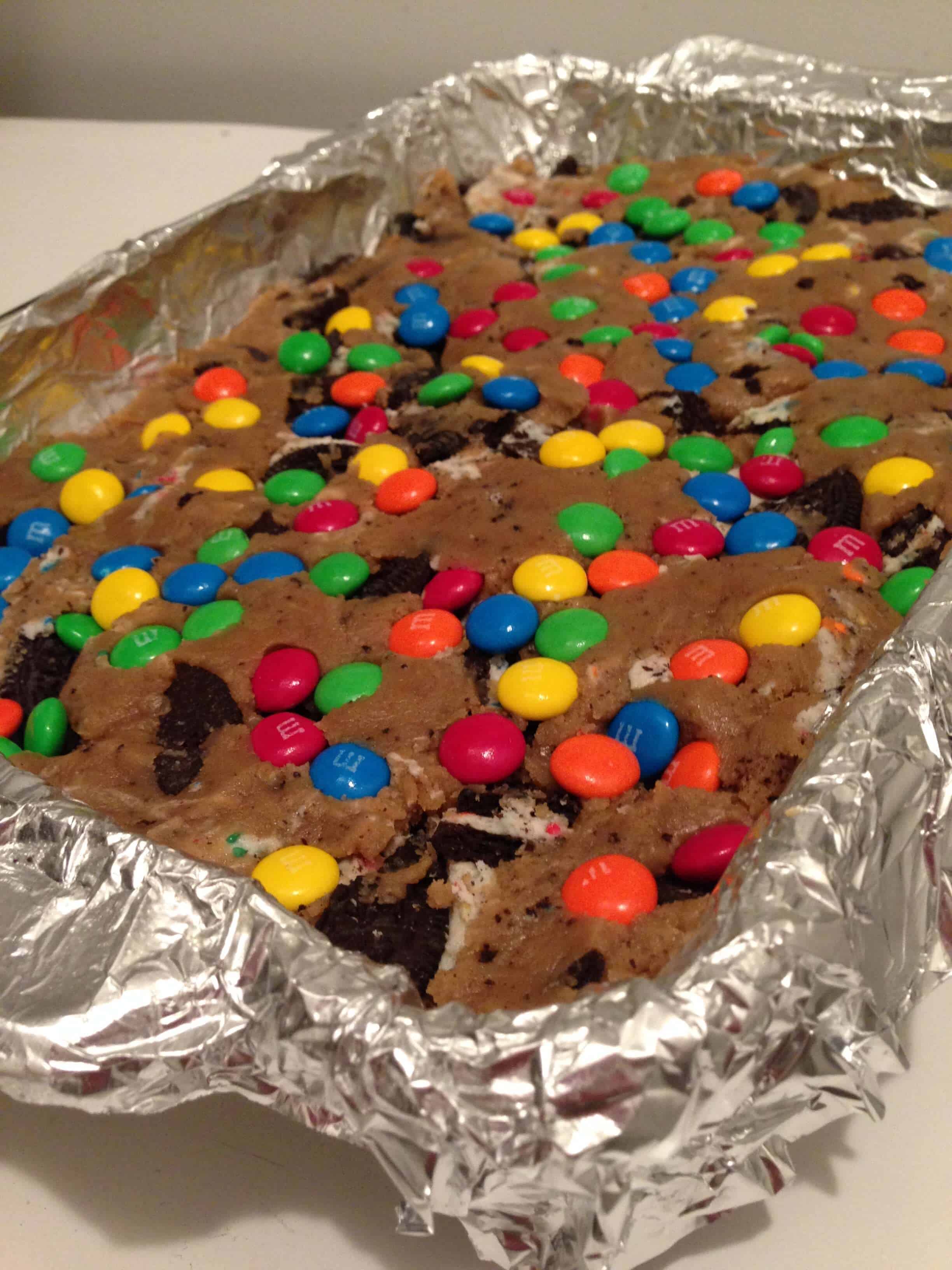 加入奥利奥,轻轻搅拌直到奥利奥均匀分布。把曲奇面团放进一个抹了油的烤盘里(8英寸)。x 13英寸),并将M&Ms洒在顶部。轻轻地将M&Ms压入面团。烤28分钟,或直到边缘变成金棕色。切菜和上菜前要充分冷却。
