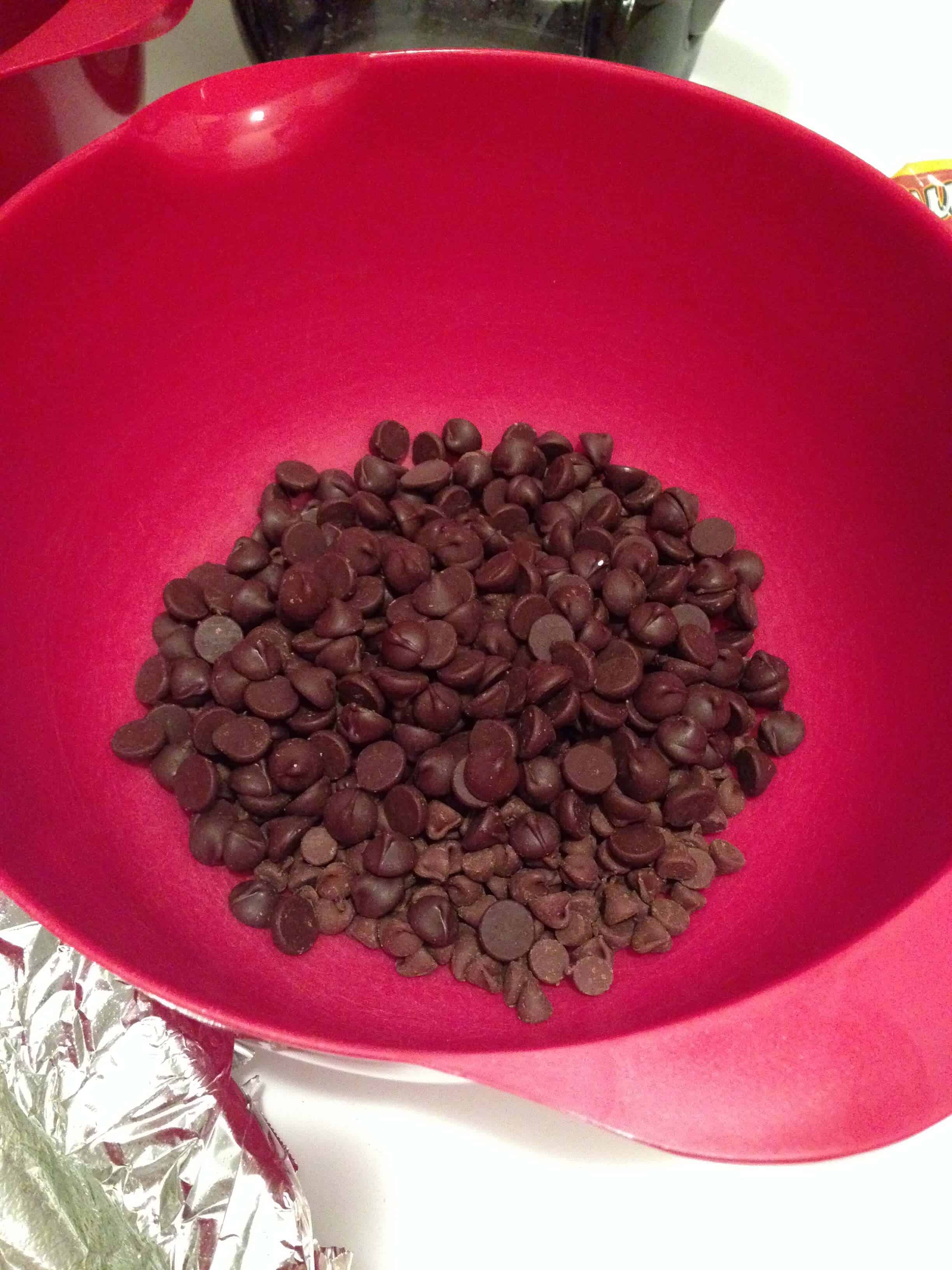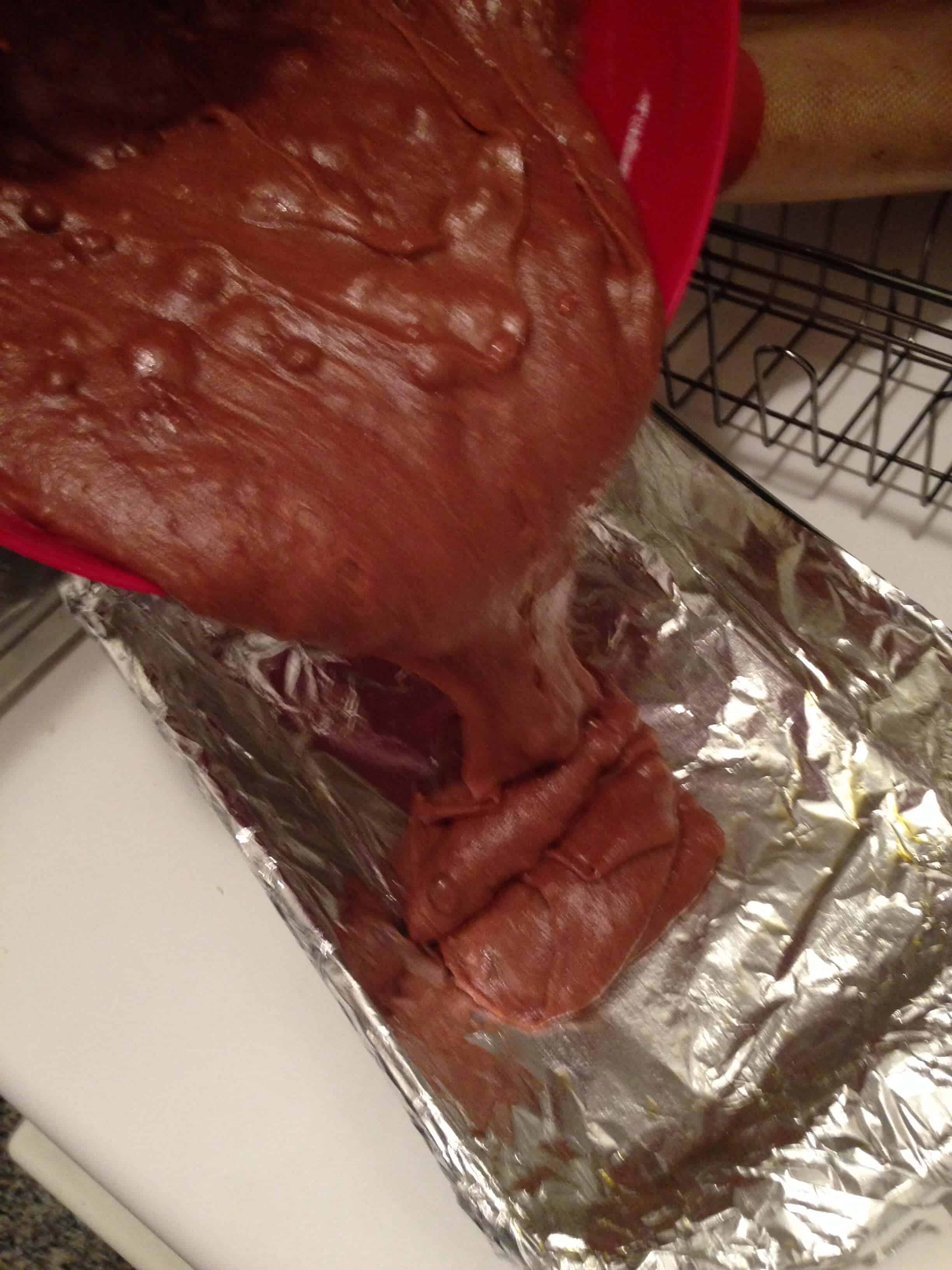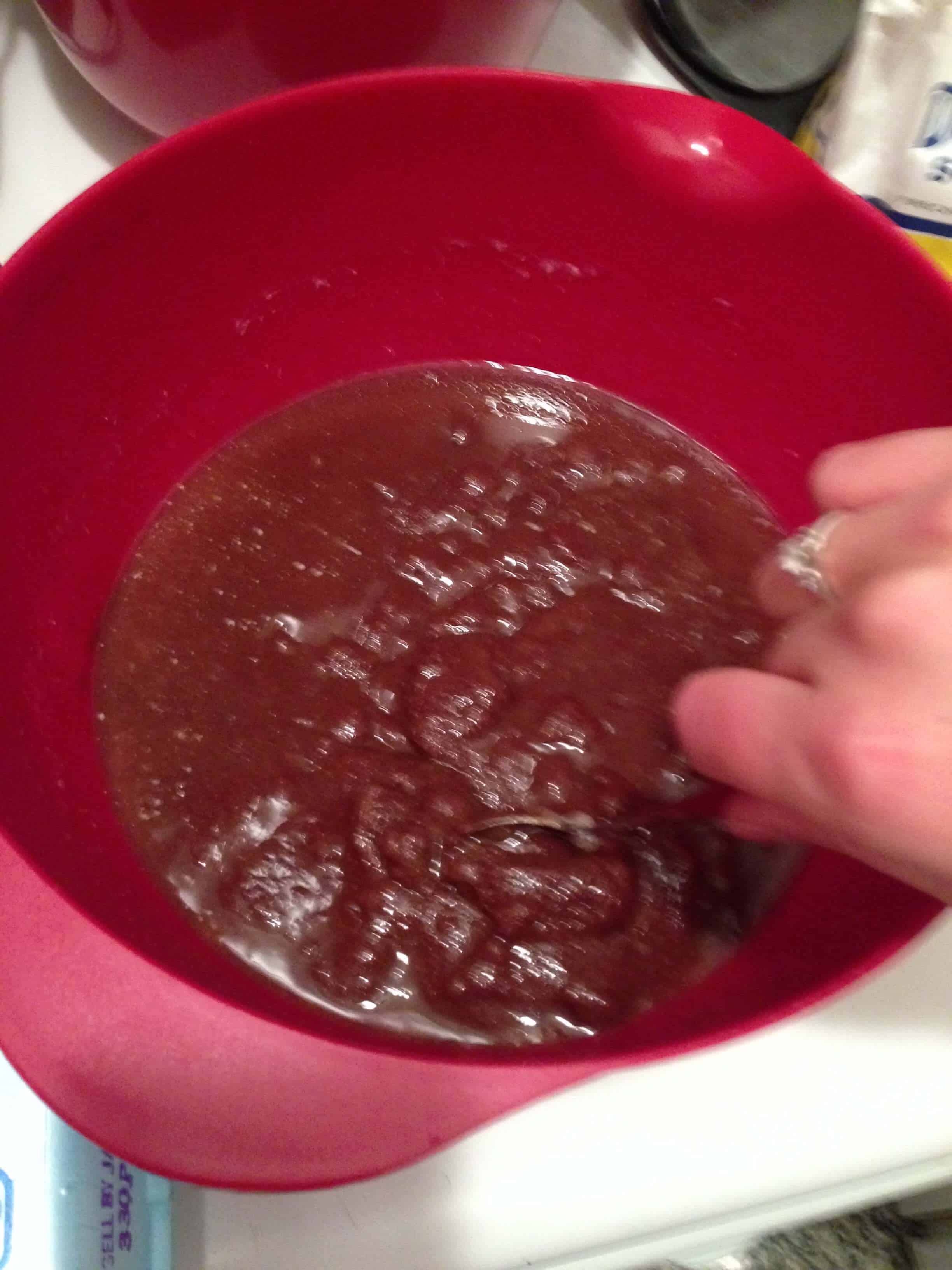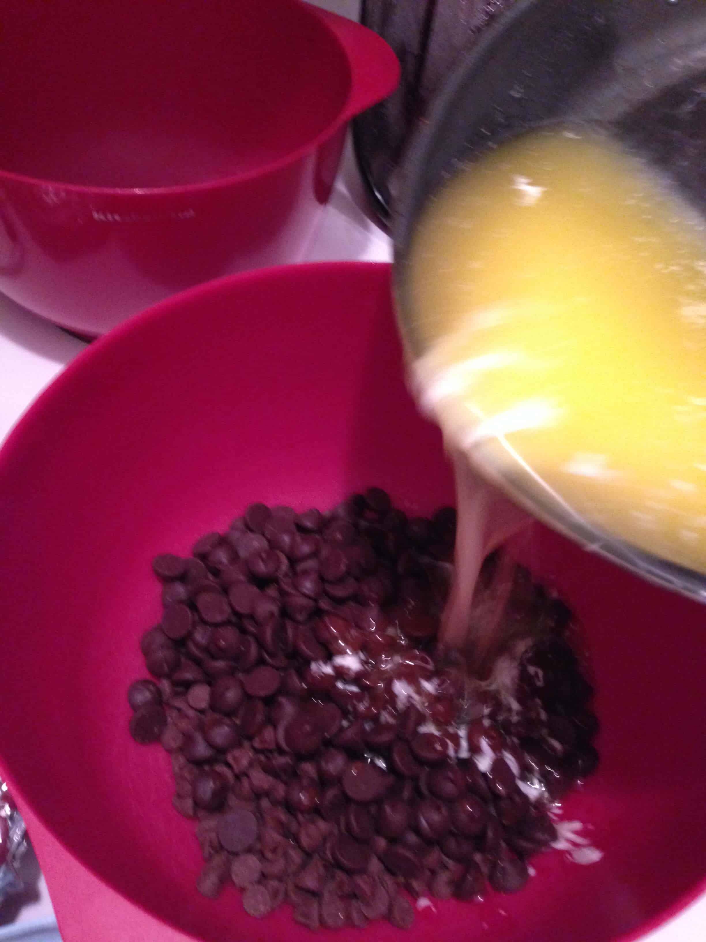 加入鸡蛋和香草精,搅拌均匀。加入融化的巧克力。加入面粉,搅拌均匀(不要过度搅拌)。拌入巧克力片。将面糊倒入备好的平底锅中。烤25到35分钟。将牙签插入烤箱中央,拔出时请仔细观察并取出烤箱。让完全冷却。