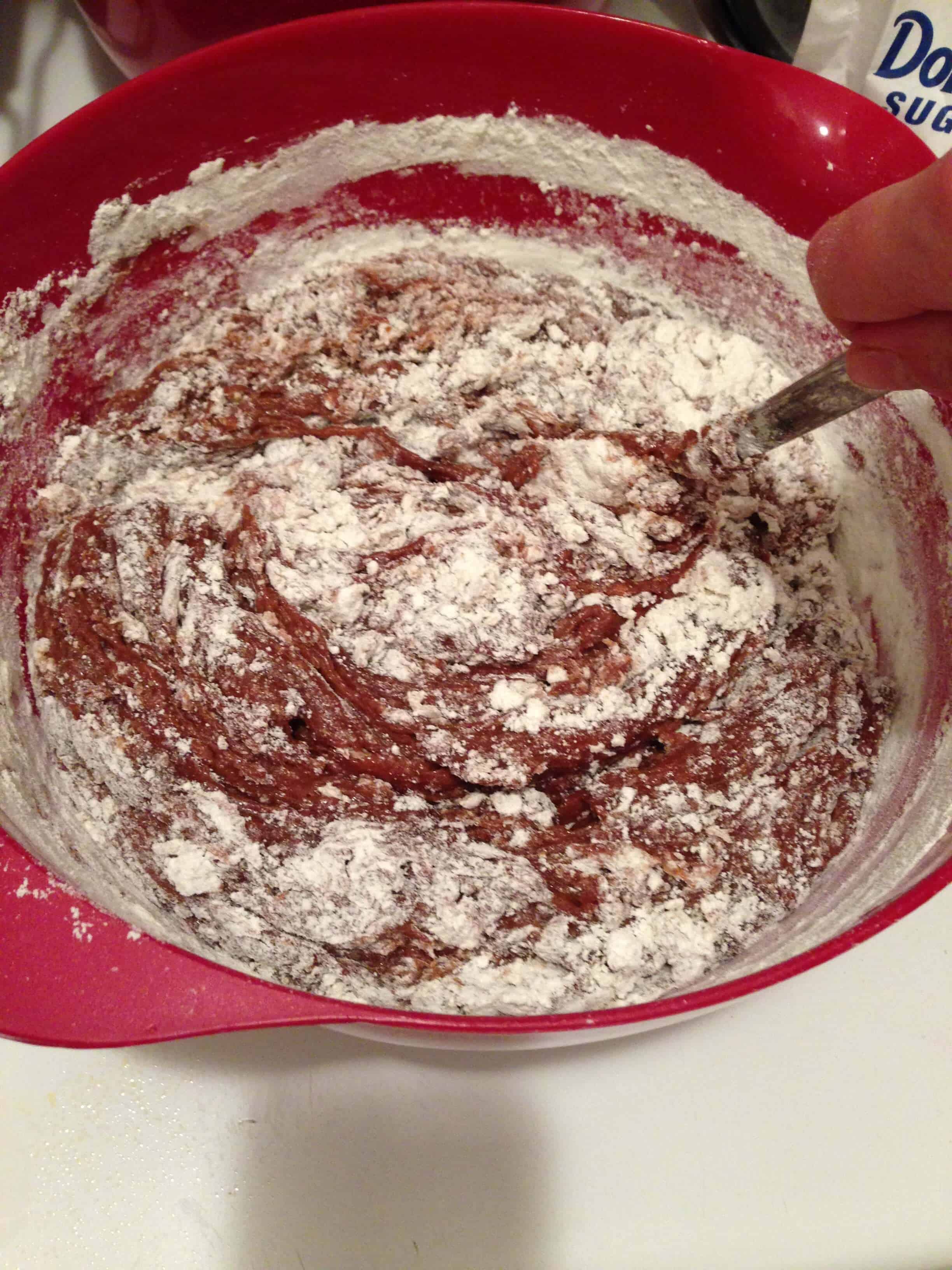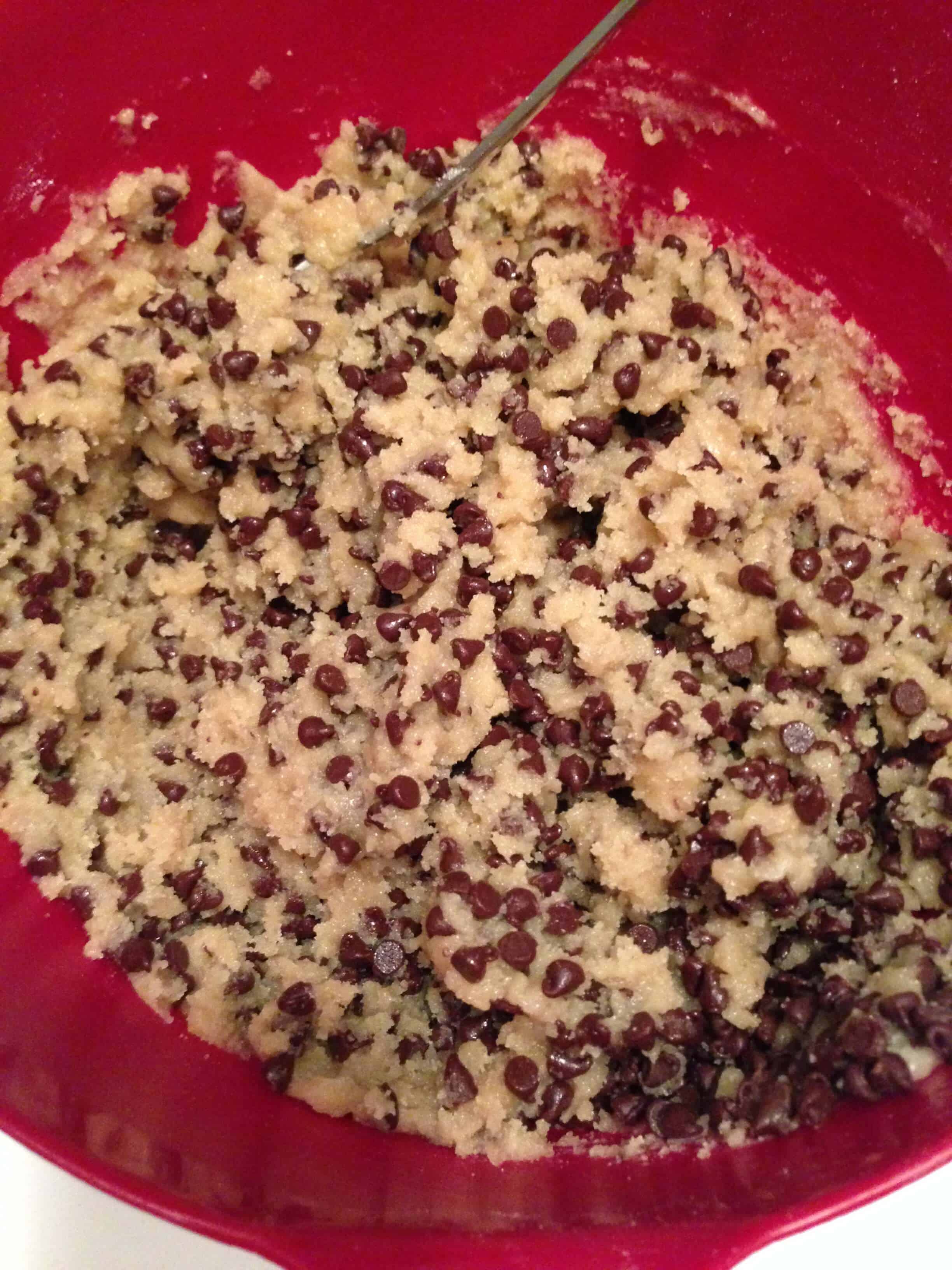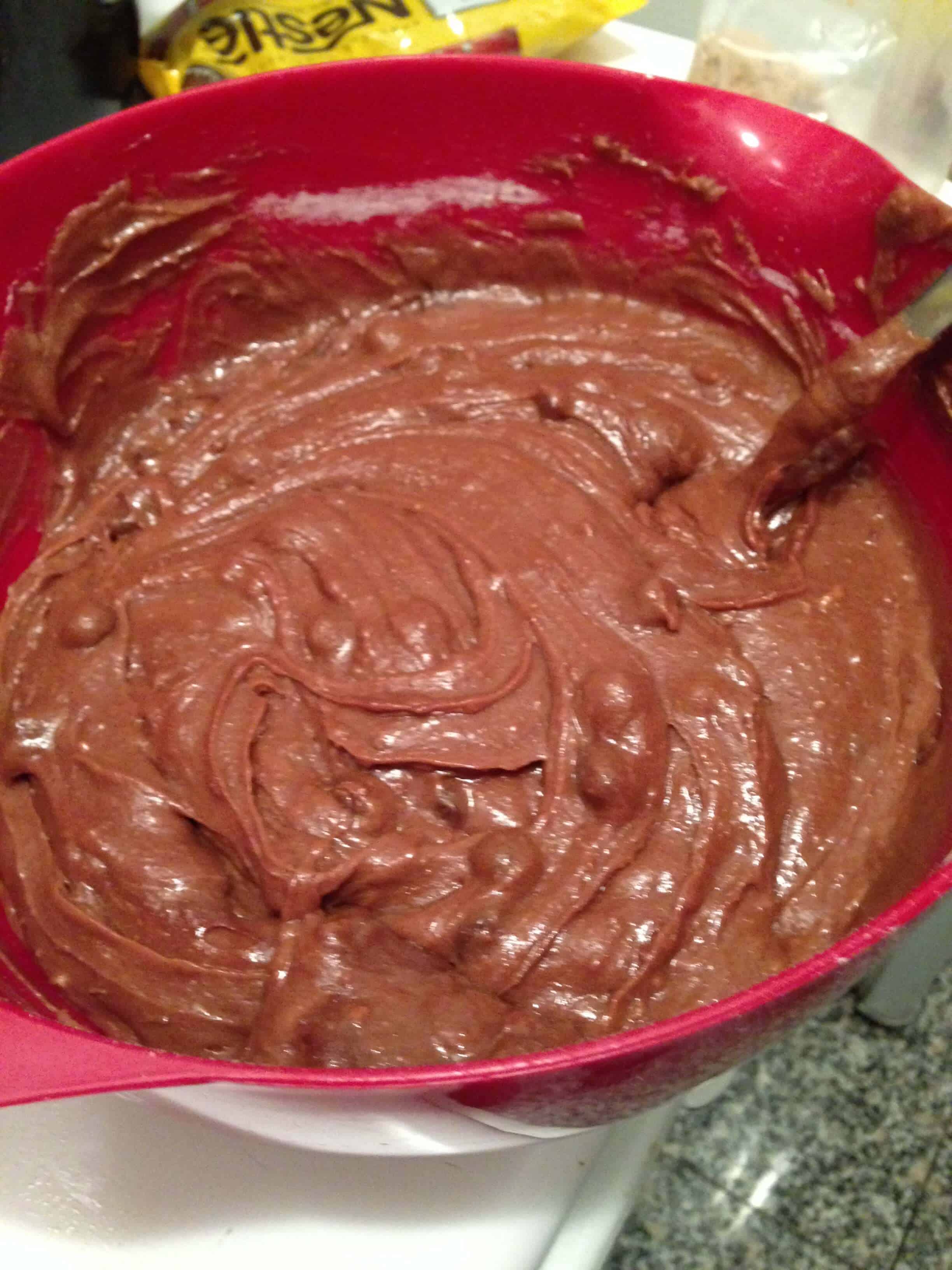 在做布朗尼蛋糕的时候,准备好曲奇饼。在一个中等大小的碗里,用电动搅拌机把融化的黄油、红糖和白糖混合在一起。加入牛奶、香草精和面粉,搅拌至完全混合。拌入巧克力片。