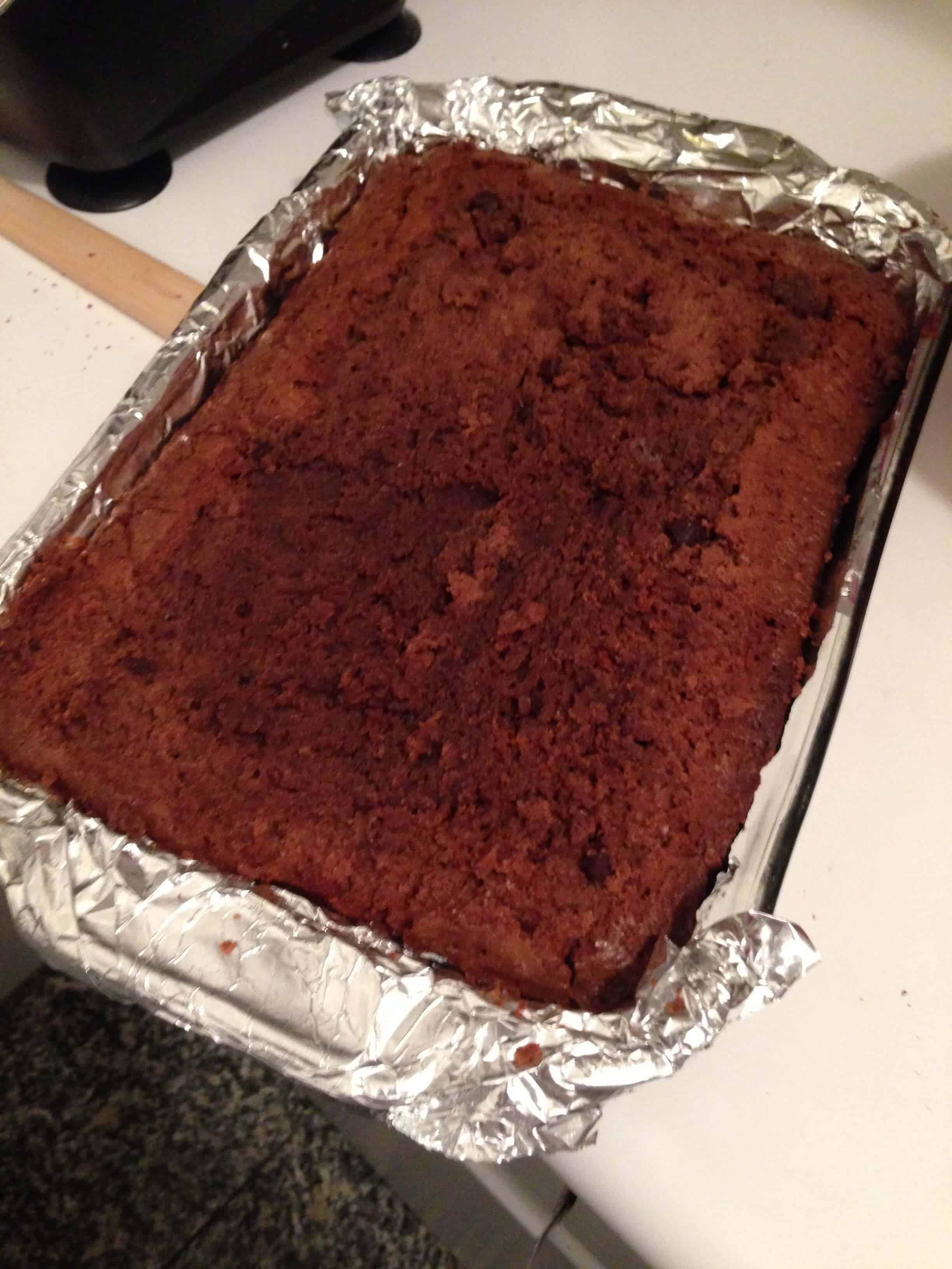 烤箱预热到325华氏度,在一个9×13英寸的烤盘上喷上不粘锅。在一个中等大小的玻璃碗中,在微波炉中融化巧克力(每隔30秒搅拌一次),或者在炉子上用小火加热。融化,直到巧克力部分融化,然后让余热继续充分融化巧克力,继续搅拌。放置一边稍微冷却。在一个大碗里,把黄油和红糖搅拌在一起。
