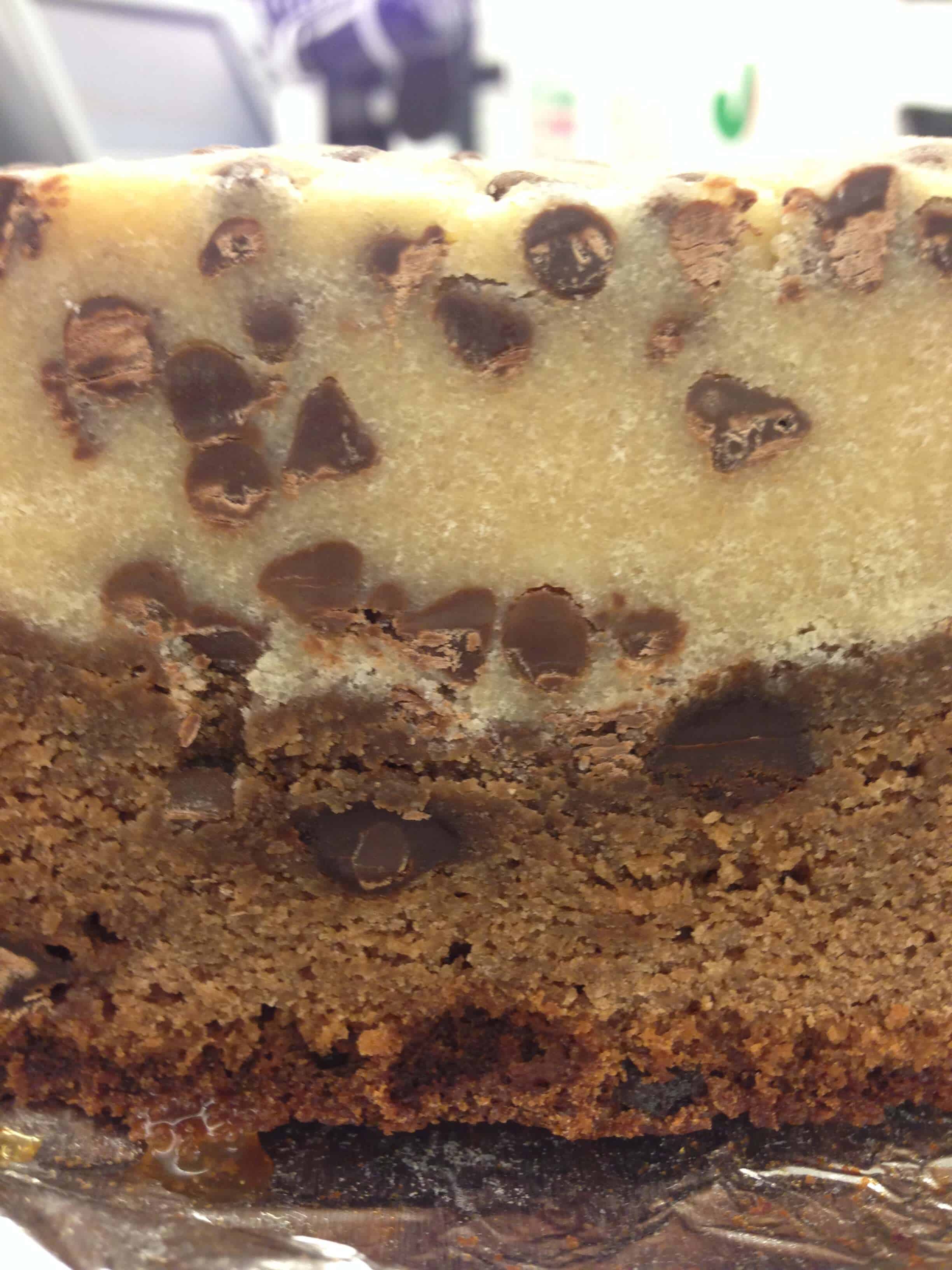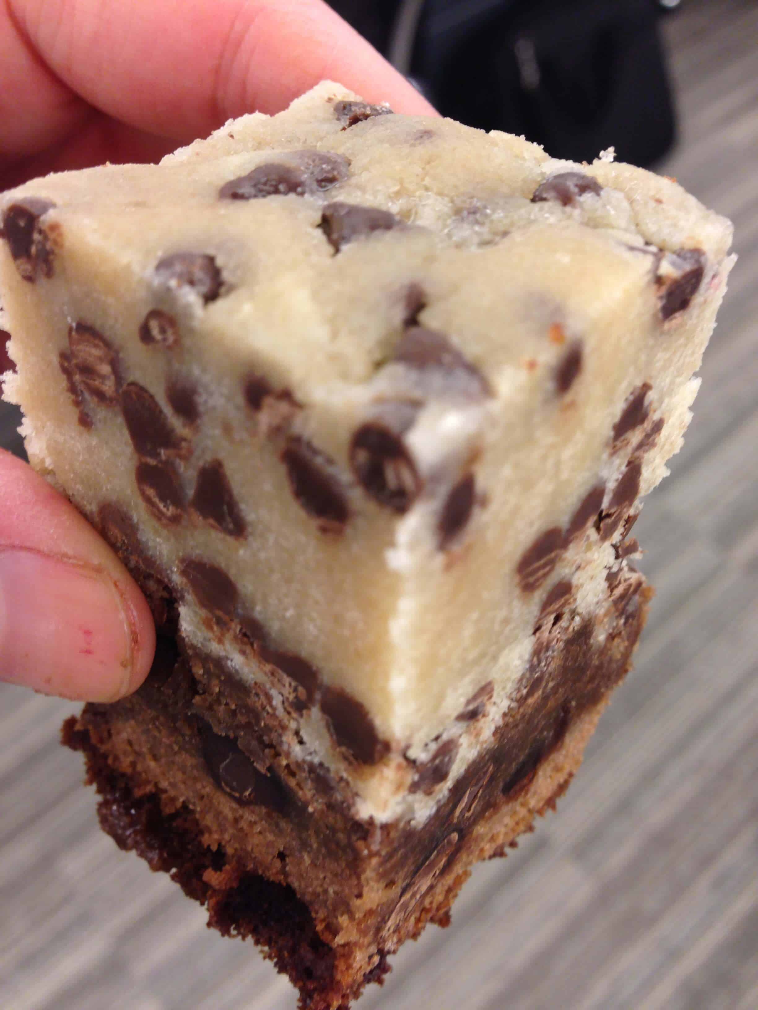 将饼干面团铺在冷却的布朗尼上。放入冰箱,直到面团变硬。可以加快这个过程,把它放在冰箱里。面团越硬,就越容易切成整齐的方块。一定要用锋利的刀切布朗尼。