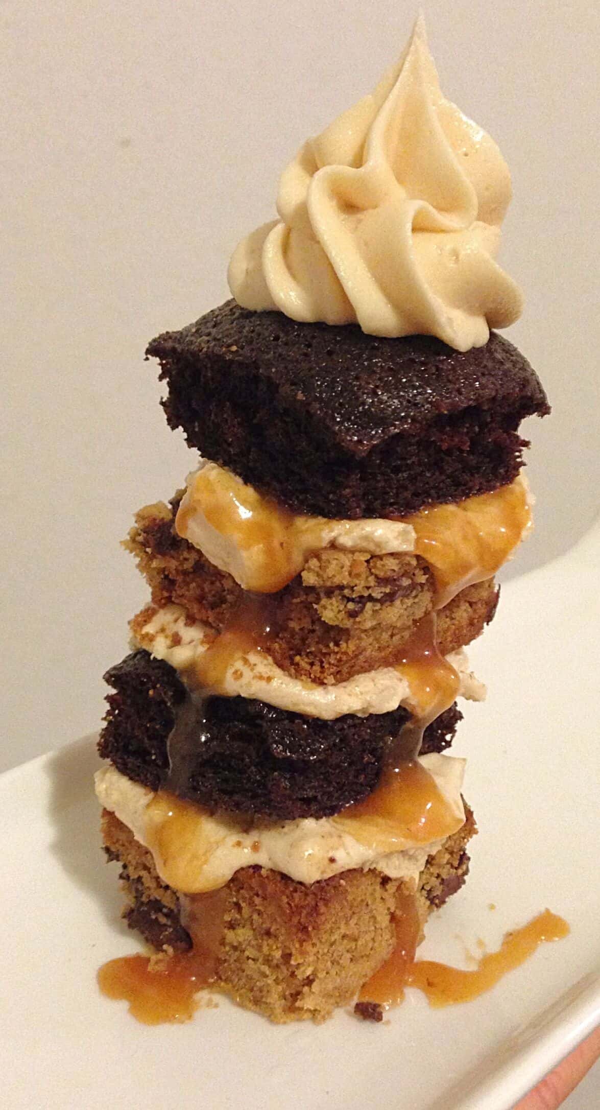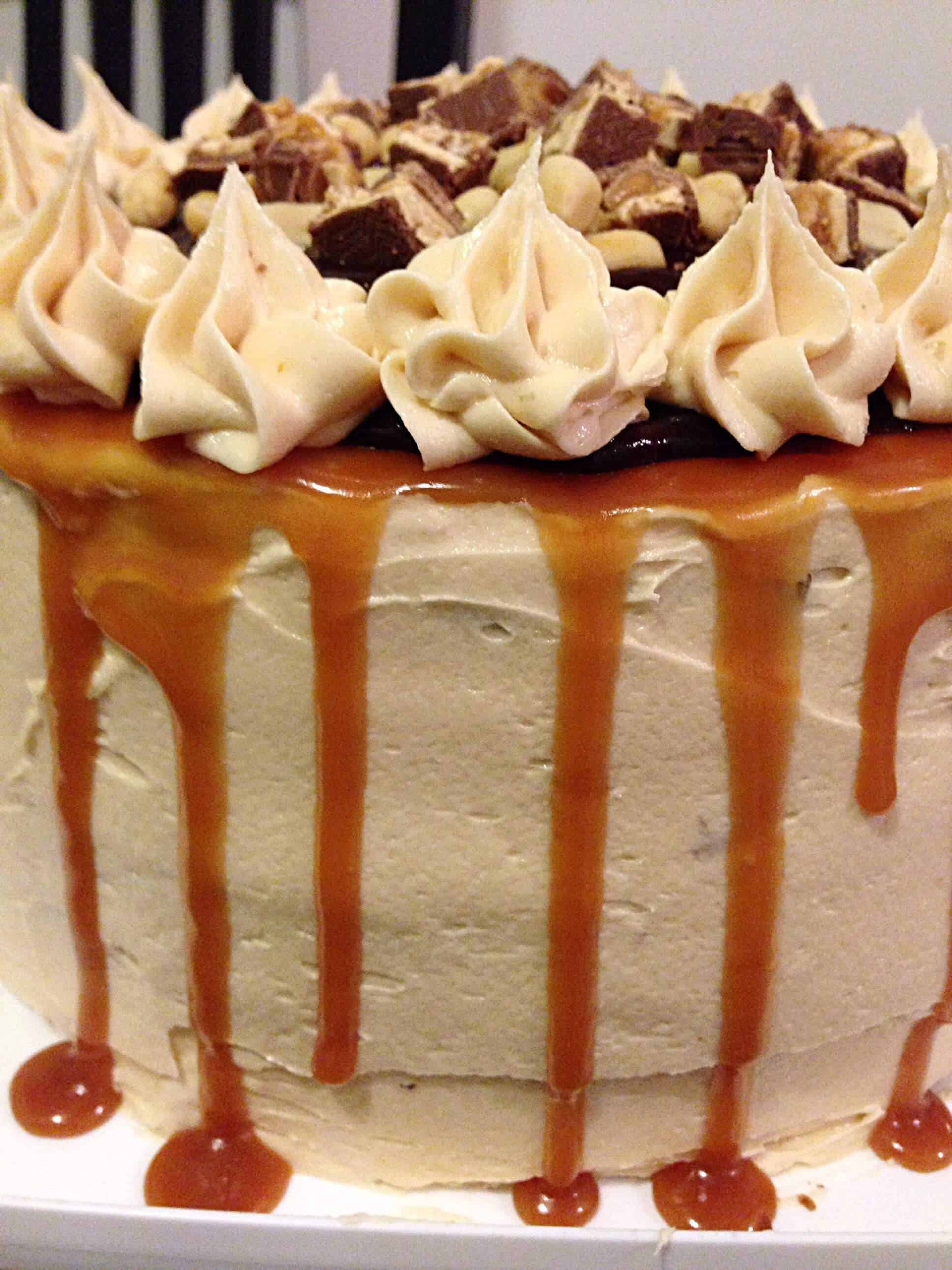 我还剩下一些饼干和巧克力面糊,所以我决定用一个拆了的士力架塔来做实验。It basically is a mini square tower of the cake It tasted wonderful. There is a great textural component from the nougat and peanuts, and the peanut butter cookie was a pleasant surprise. The star of the show is definitely the salted caramel sauce, and the caramel buttercream. I love the hint of salt from the caramel and peanuts, it really balances out the sweetness of this cake. I was really happy with the way this cake turned out, and loved the final product. If I were to make this cake again, I would consider toasting or candying the peanuts, just to add a little more pizzazz.