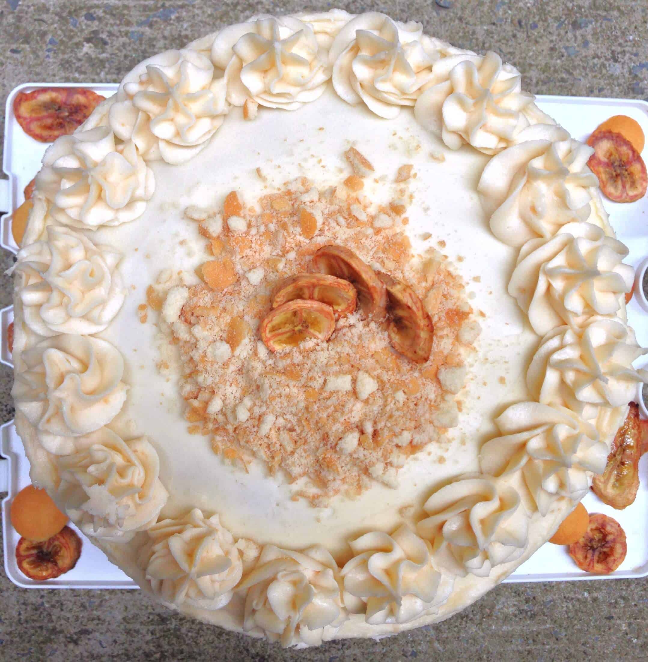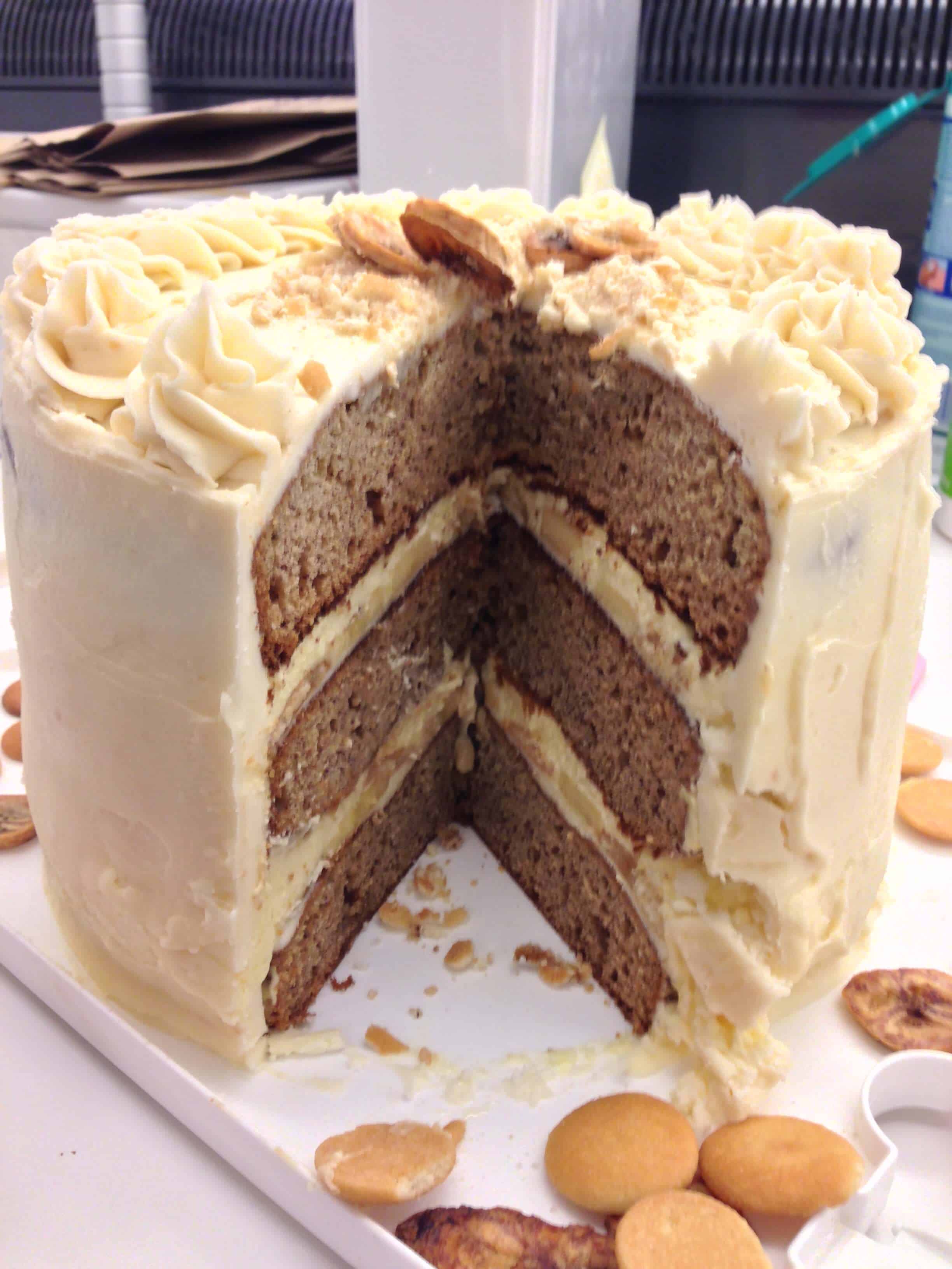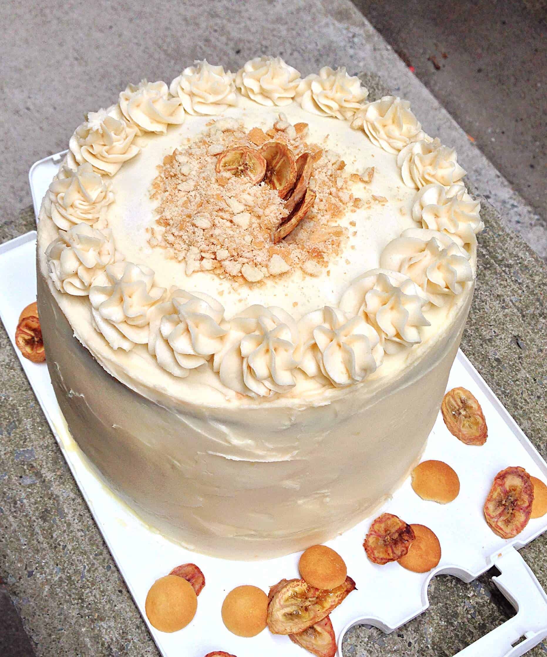 开始香蕉蛋糕基地。烤箱预热至275度。黄油、面粉,把烤盘纸放在四个九英寸的圆形蛋糕盘里(我做了三层,但希望我已经做了四层!)如果你试着把所有的面糊放在三个平底锅里,顶部会变得太圆)。在一个小碗里,把香蕉泥和柠檬汁混合,放在一边。在一个中等大小的碗里,混合面粉,小苏打和盐,然后加入鸡蛋,一次一个。在一个大碗里,将黄油和糖搅拌至松软。加入香草精,然后将香蕉混合物加入面粉混合物中,与白脱牛奶交替搅拌。将面糊倒入准备好的平底锅中,烘烤约45分钟,或者直到插入中间的牙签干净为止。
