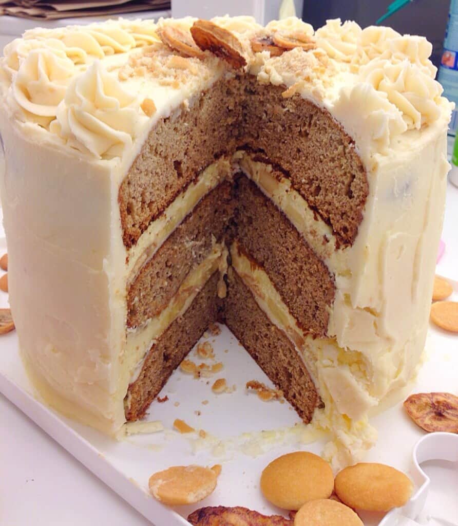 一旦蛋糕的所有成分冷却/凝固,组装蛋糕。在每个蛋糕上涂上一层糖霜、nilla威化饼、香蕉和1/3的布丁。重复以上步骤,然后在蛋糕表面涂上一层薄薄的面包屑。放入冰箱冷藏30分钟,让馅料稳定下来,让面包屑变硬。在蛋糕外面涂上一层厚厚的糖霜,在上面撒上奶油漩涡,再用碎香草威化饼和香蕉片装饰。