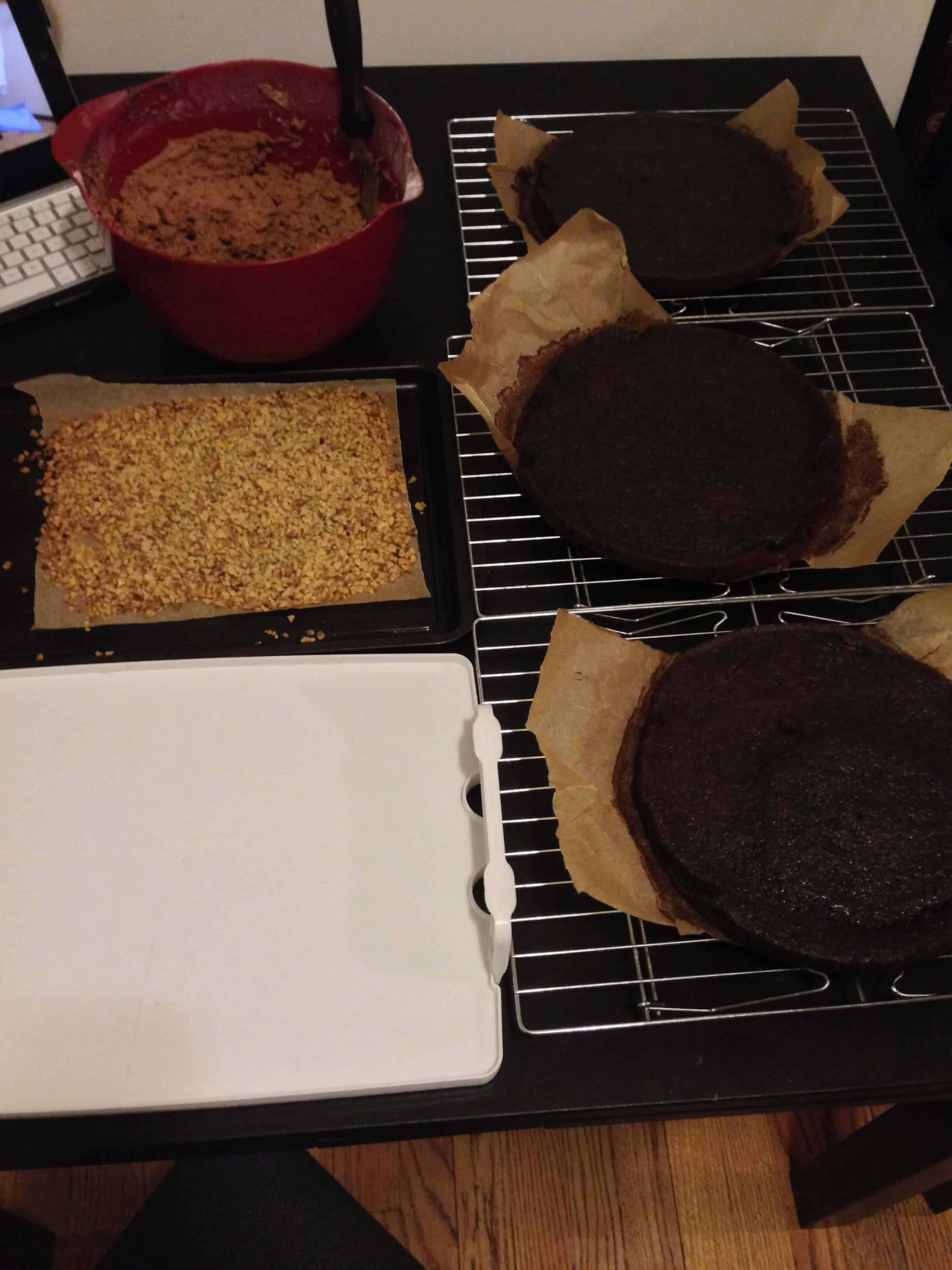 匀中准备锅面糊(我选择了把四层,但是层数很容易改变)。烤20分钟,直到插入一块蛋糕的中心牙签出来几乎是干净的(有一些潮湿面包屑)。冷却上线架20分钟蛋糕(在盘),然后小心地将其出到冷却支架完全冷却。