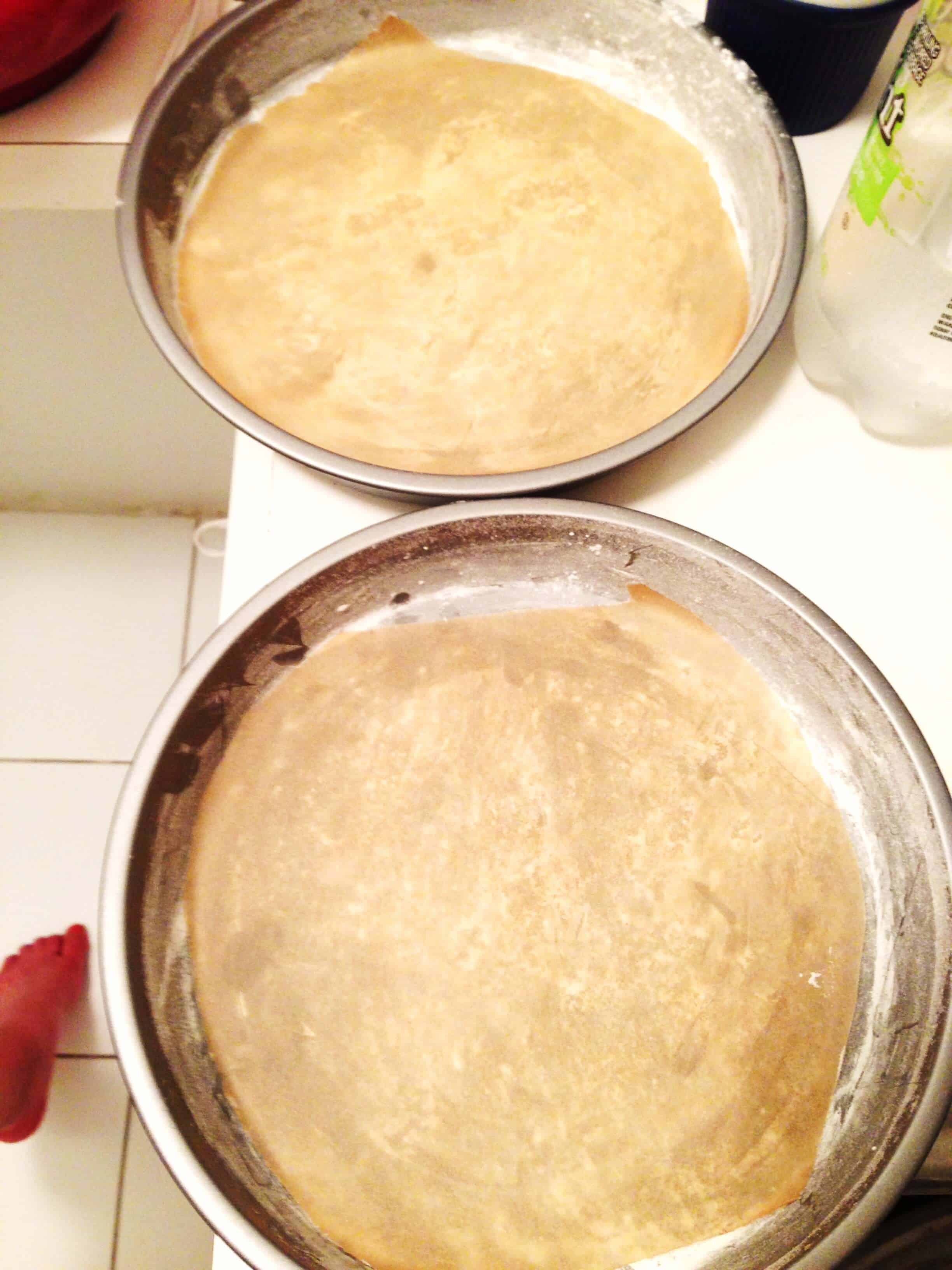 将烤箱预热到325油脂和在9英寸圆形蛋糕盘(参见图片)铺设羊皮纸的条带。在一个中型碗,一起搅拌面粉,小苏打,发酵粉,可可粉和盐。搁置。在一个大碗里,结合糖,植物油,鸡蛋,牛奶,香草和粉红色食用色素。拌入咖啡和白醋。结合湿成分与干燥的成分一点在时间,每次加入后搅拌,直到justcombined。划分面糊均匀地涂在中间齿条蛋糕pans.Bake的所需数量之间进行18-22分钟,或直到牙签出来干净。烘烤时会根据你如何烤层的厚,但如果你选择使用一个9英寸的盘,并进行3-4层,这应该是一个准确的烘烤时间。继续蛋糕密切关注,你不把它们想通过烘烤!该层也将继续煮,当它冷却。让这些层中泛约五分钟冷却,然后从盘移除它们到线架来完成冷却。滑动刀或偏移周围的平底锅内小铲起油锅蛋糕。