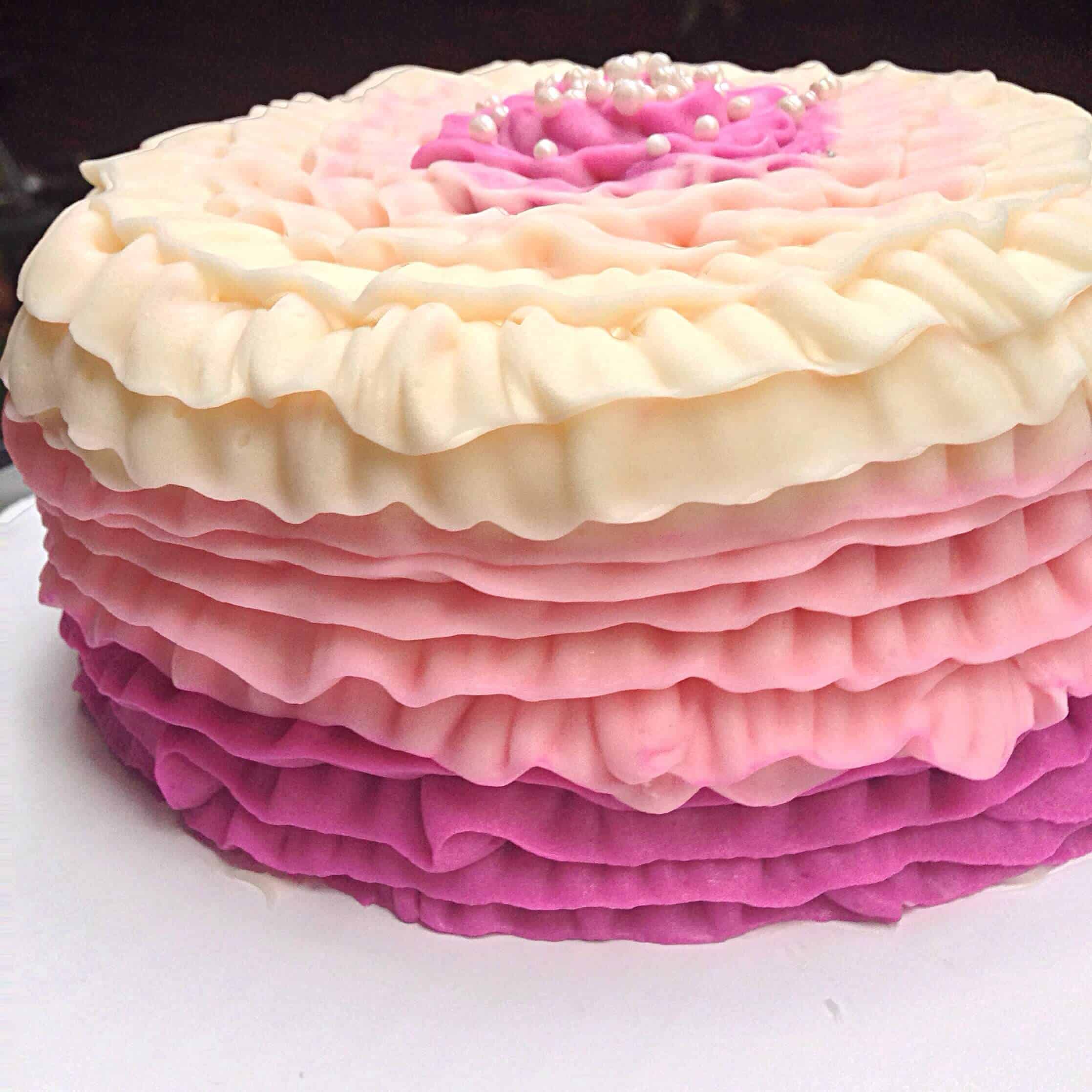 霜冻蛋糕当蛋糕完全冷却奶油奶酪结霜。轻轻霜冻每一层,然后覆盖滤饼的整个外部。确保交替层顶起来,自上而下,以帮助蛋糕保持水平。让这个面包屑外套晚上变硬了,和预留的剩余结霜。颜色衰落的粉红色调,并完成了第二天早晨结霜。我决定用我的花瓣尖,使褪色的褶皱。