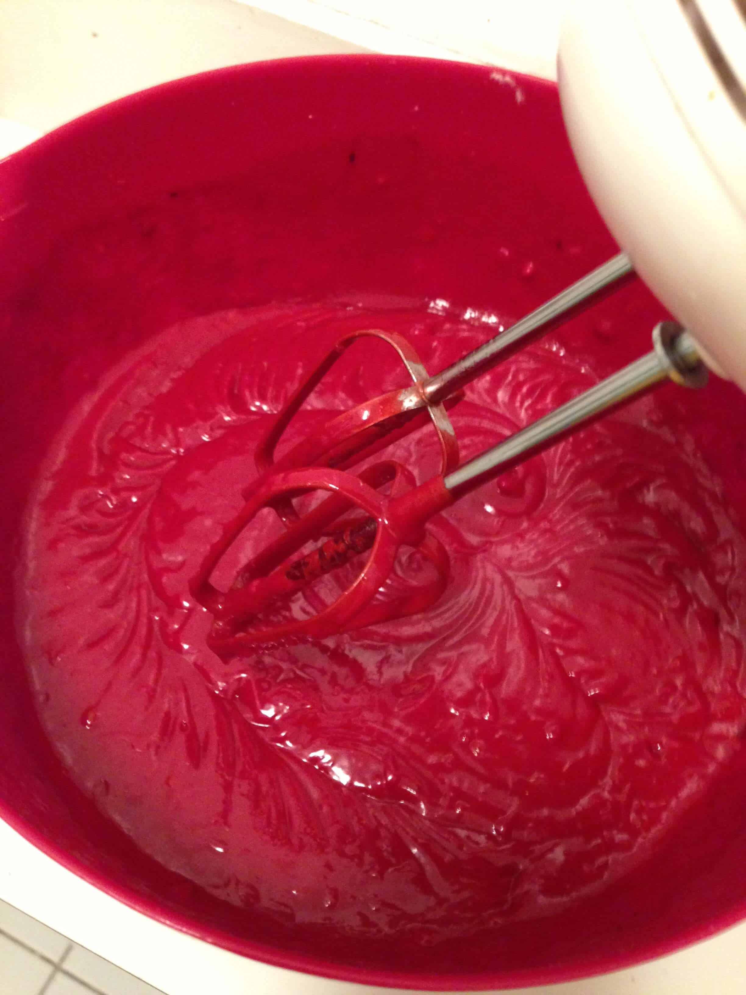 在一个大碗里,结合糖,植物油,鸡蛋,牛奶,香草和红色食用色素。