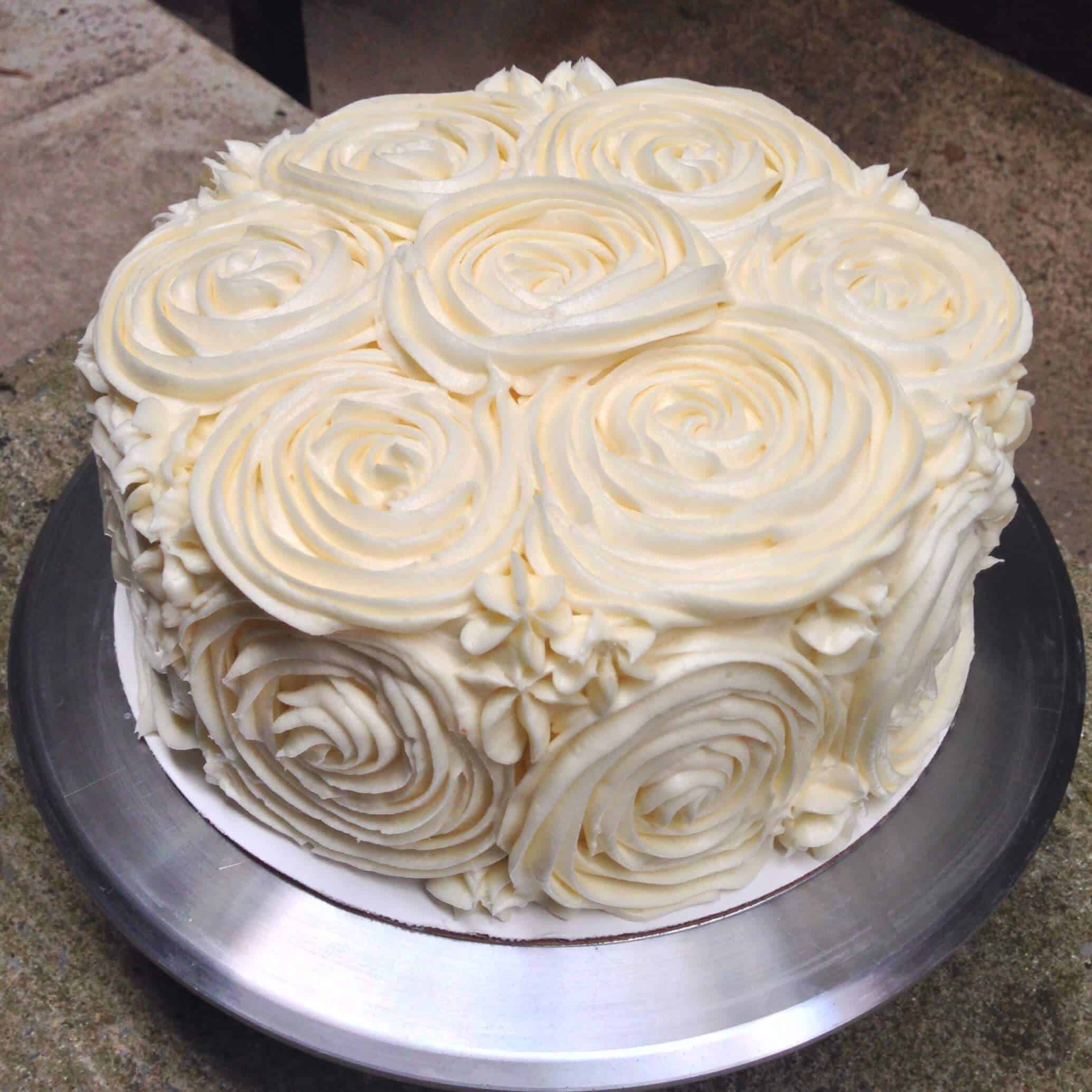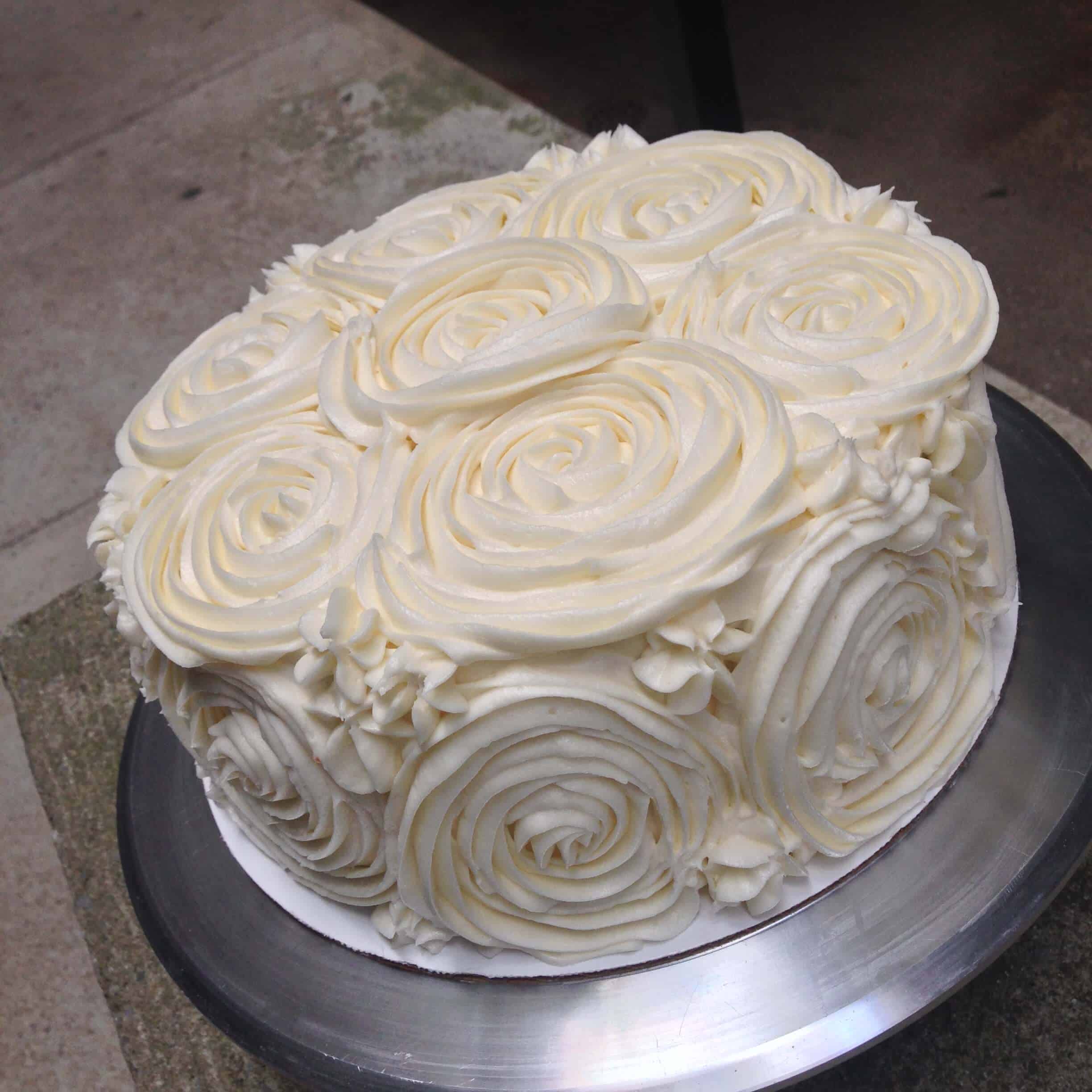 第二天早上完成磨砂,光滑外部,装饰的管道。我决定用玫瑰装饰这个蛋糕
