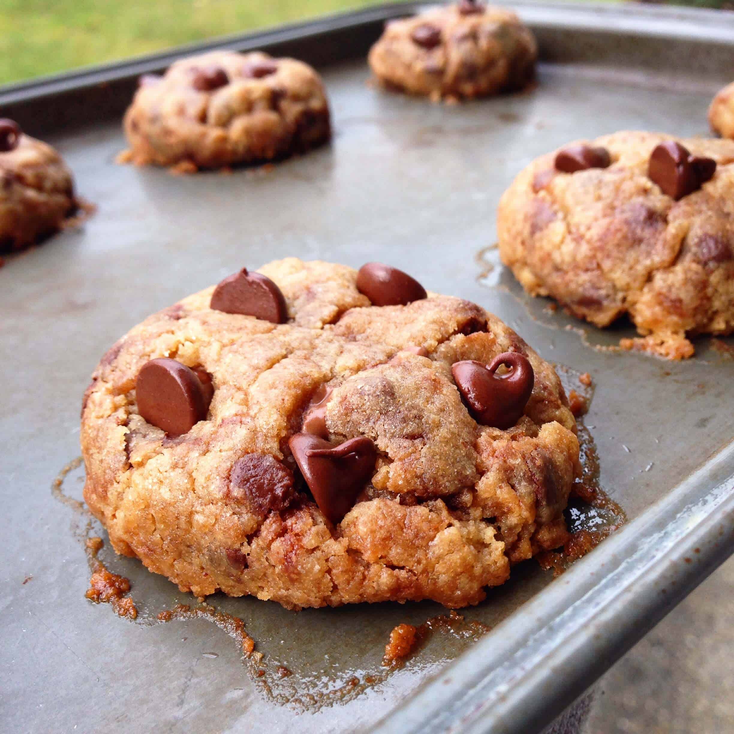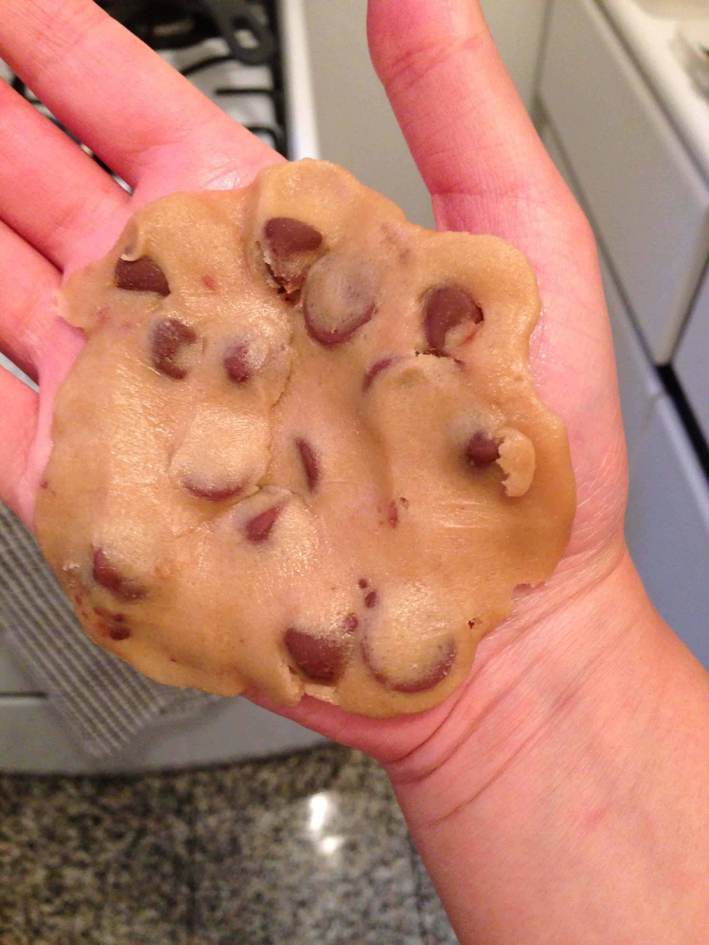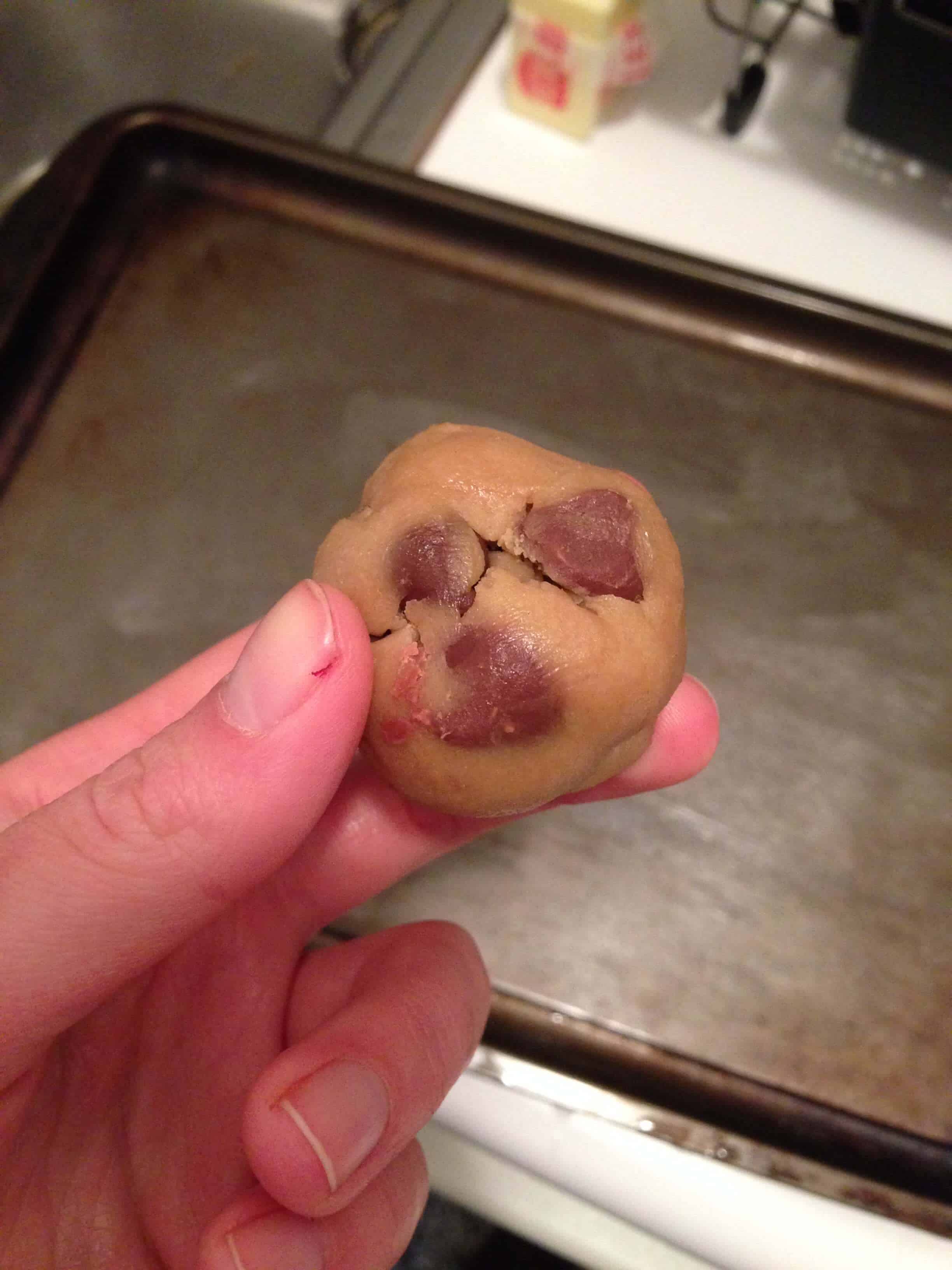 第二天早上,把烤箱预热到350度。用1又1/2大汤匙的曲奇面团做成面团球,在手掌上压平。将一杯Reese’s花生酱放在中间,将面团卷起来,轻轻地揉成一团。