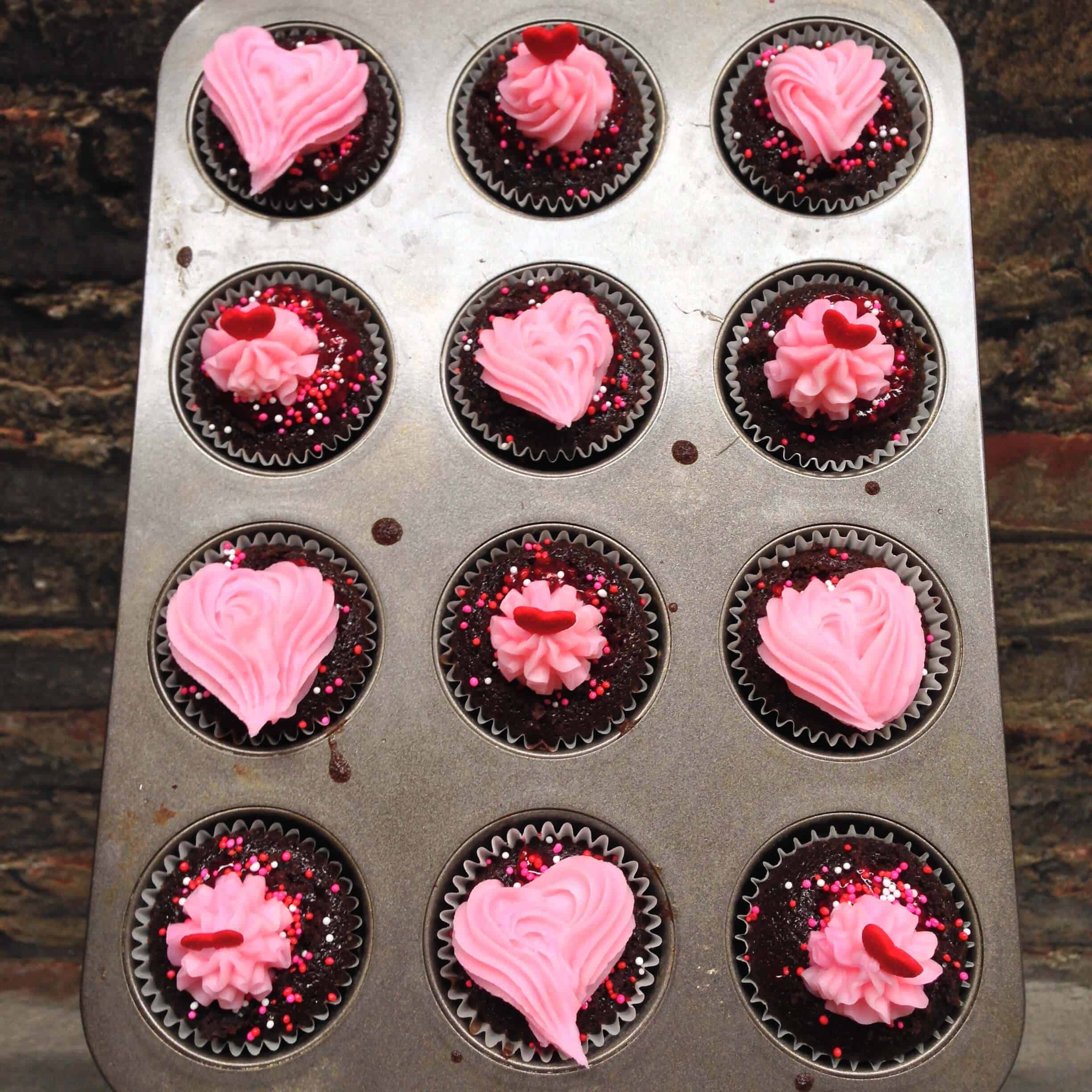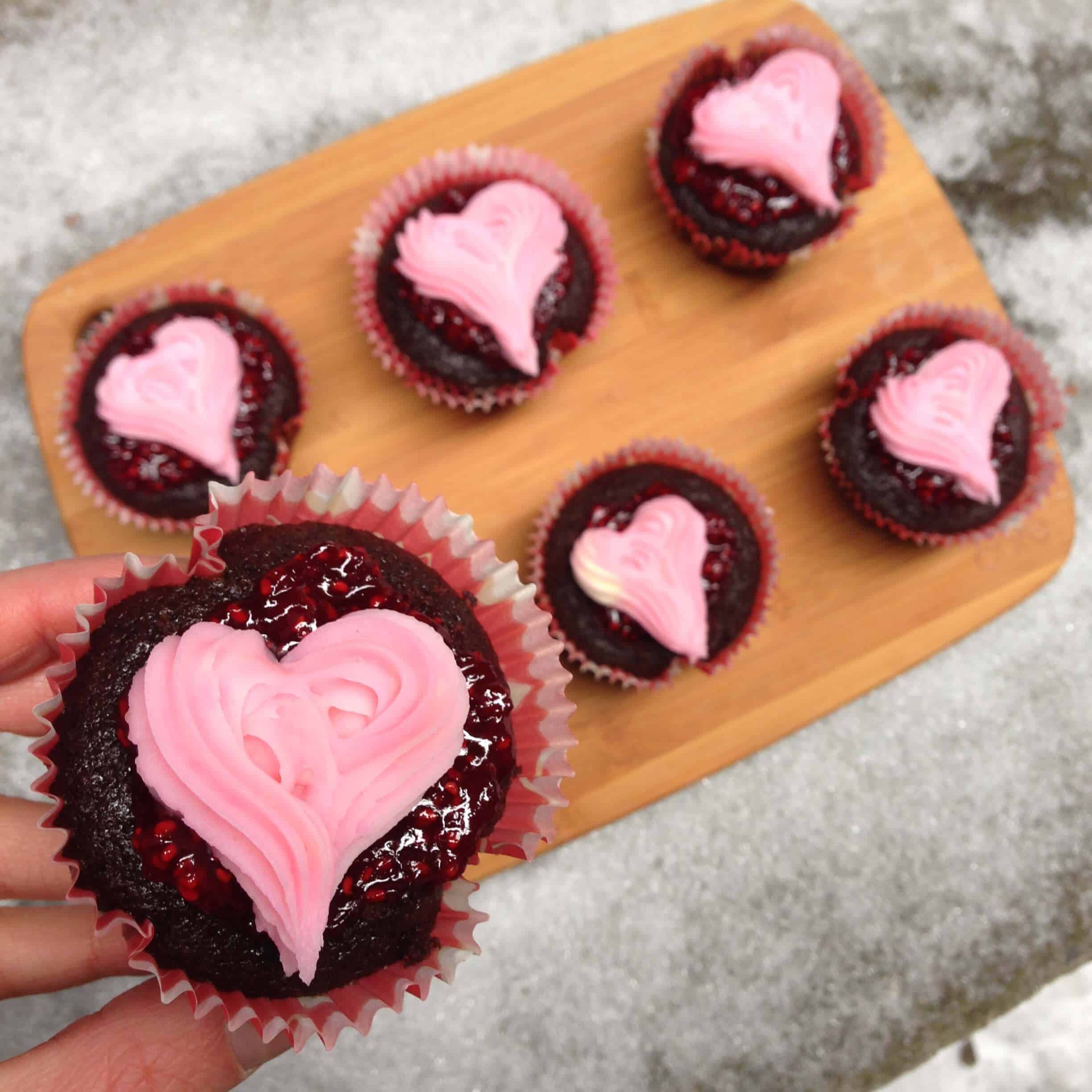 情人节快到了,我想为同事们做些节日纸杯蛋糕。最后我做了黑巧克力纸杯蛋糕,里面有覆盆子果酱、粉色香草奶油、粉色和红色的糖屑。我用了我最喜欢的巧克力纸杯蛋糕食谱,灵感来自我最喜欢的烘焙博客之一the棕色的眼贝克。