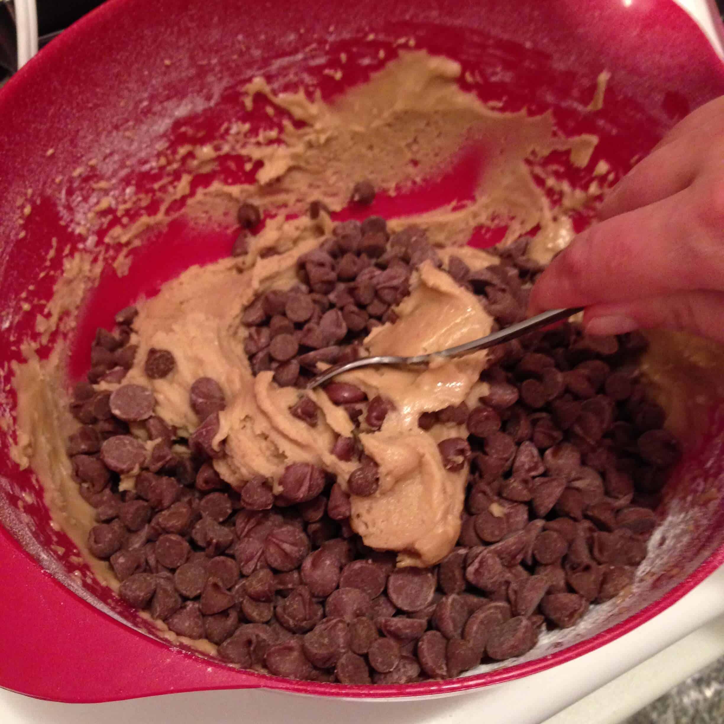 用电动搅拌器,搅拌黄油和糖。击败鸡蛋,蛋黄,香草和酸奶,直到结合。加入面粉,小苏打和盐,并击败只是直到结合低速。轻轻地折叠在所有巧克力芯片。
