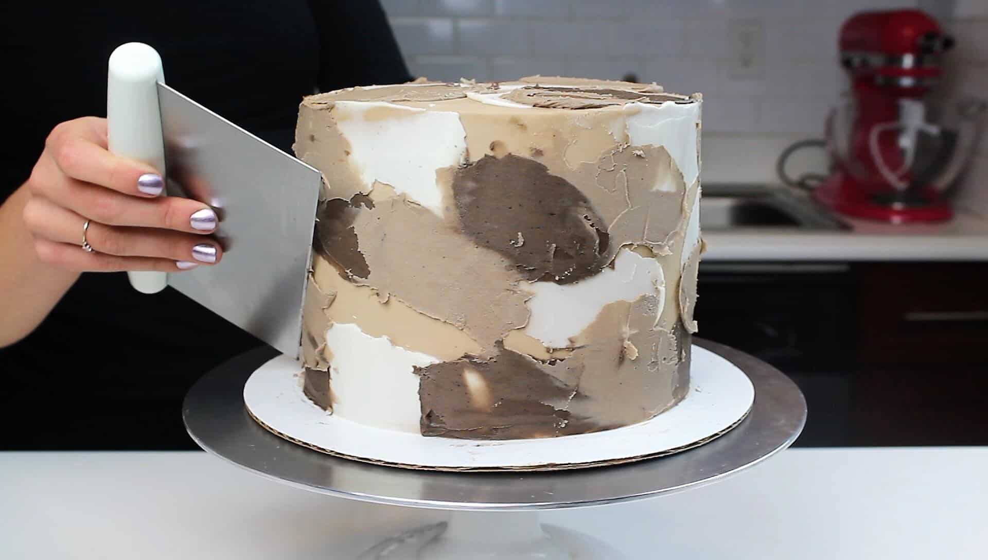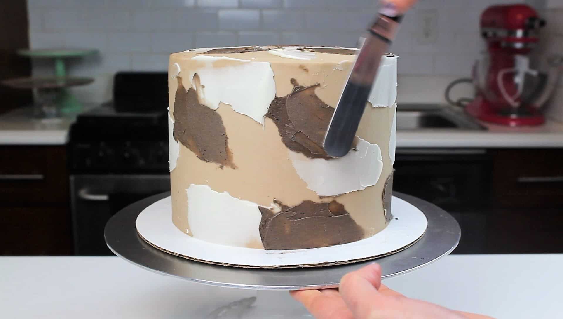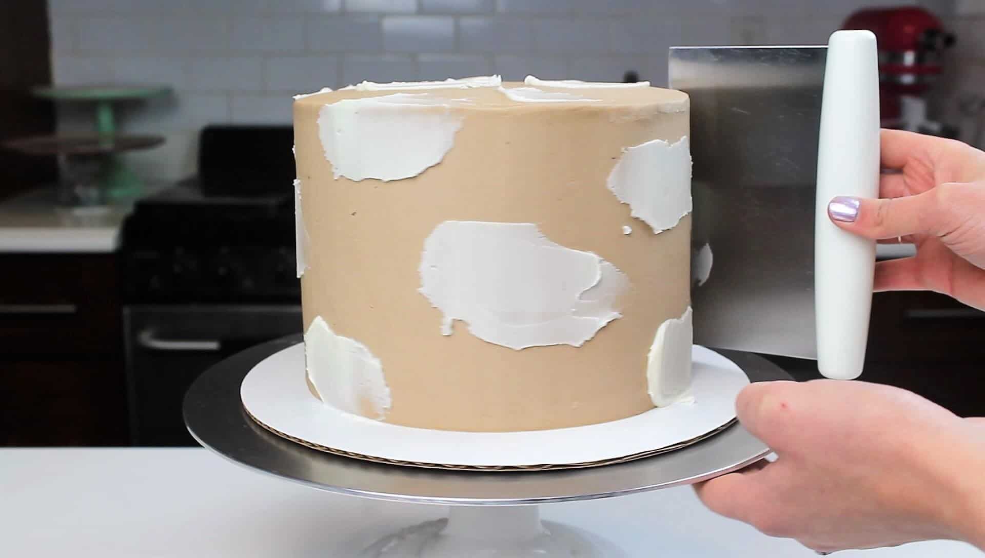 要创造出奶油质感的外观,用一个小的抹刀在蛋糕周围涂抹白色的奶油。