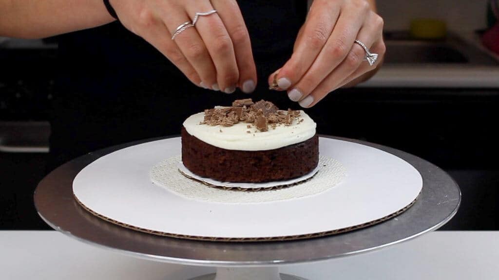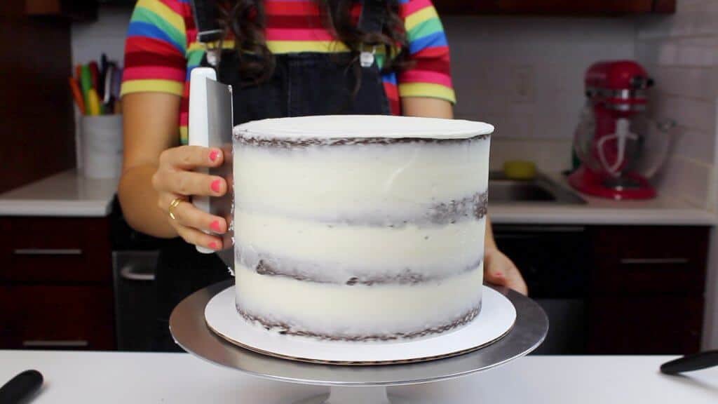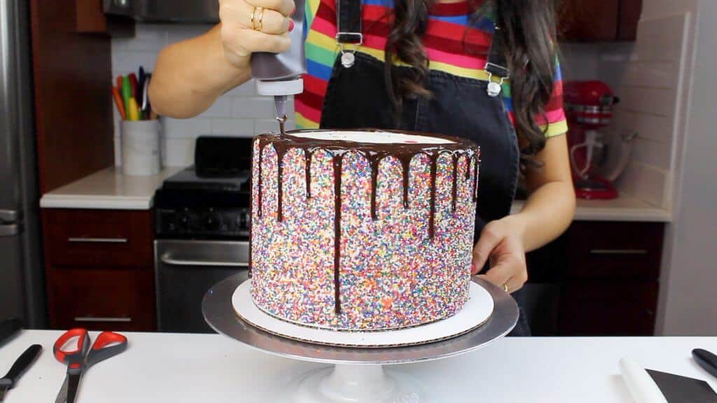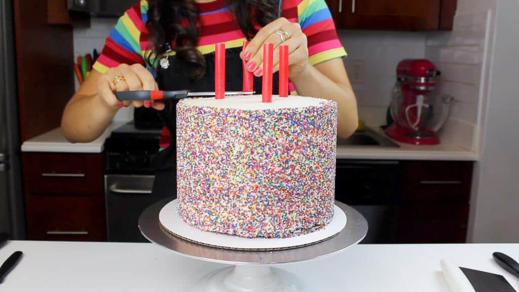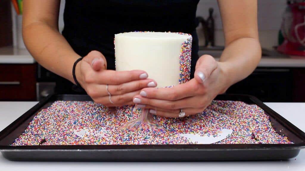 The cake was chilled for about 5 minutes in the freezer to allow the crumb coat to firm up, but then we rolled the cakes directly into the spinkles after adding the second layer of frosting It’s scary because the frosting isn’t super firm, but it has to be that way so the sprinkles will stick! Just be very careful as you roll it <3