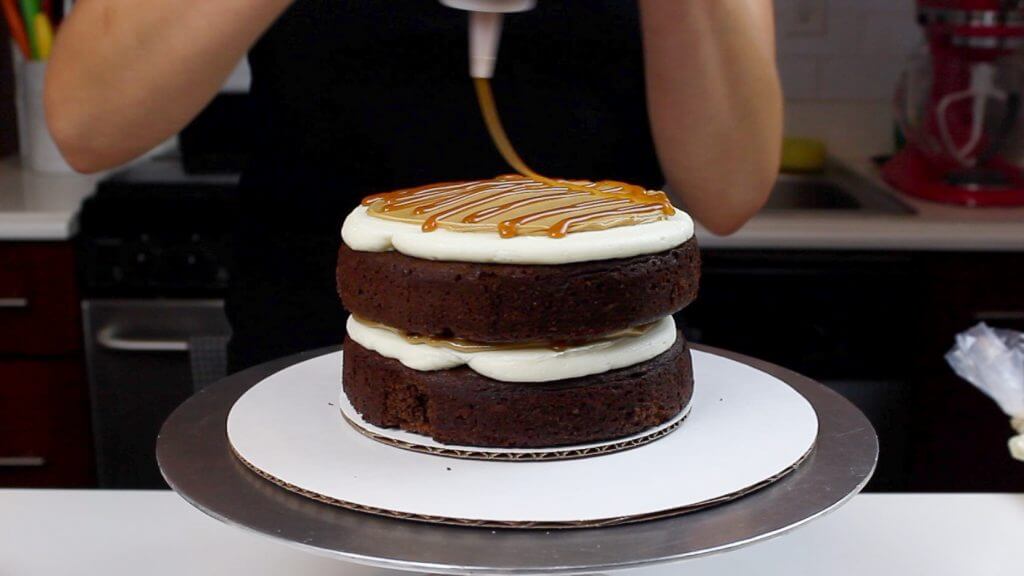 这里的关键是不要太多结霜添加到蛋糕的顶部,否则将样渗出出你持有蛋糕滚。