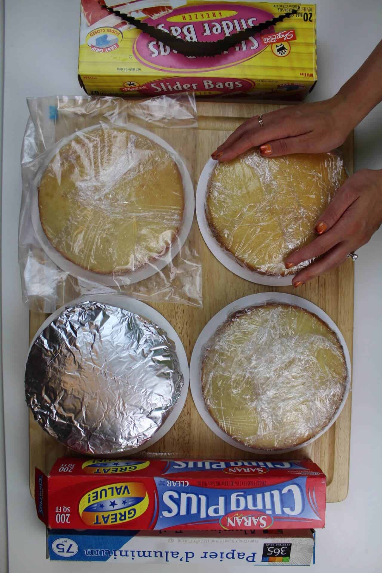 我喜欢特百惠的路线,因为它的减少浪费,但当冷冻蛋糕层的时间更长(超过几天),我认为保鲜膜效果最好。
