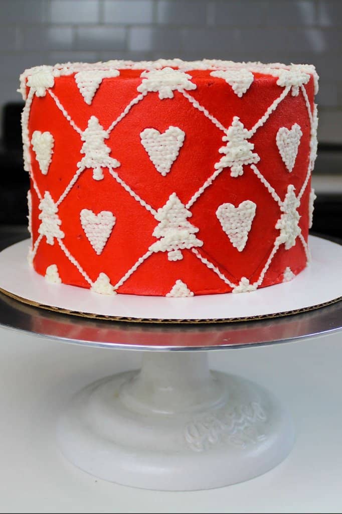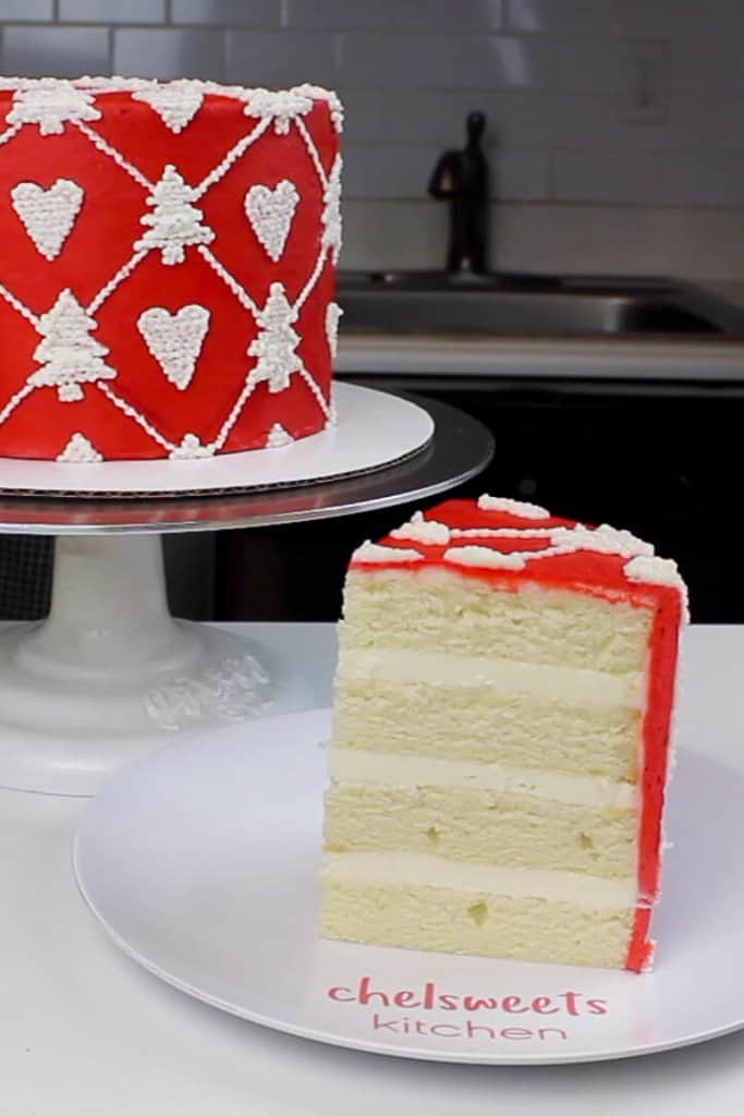 明白我的意思对白色丝绒蛋糕层?他们看起来如此原始和当与鲜艳的红色奶油配对完善。如果你想观看完整的视频教程,这里是我创造的这个在YouTube视频毛衣蛋糕。