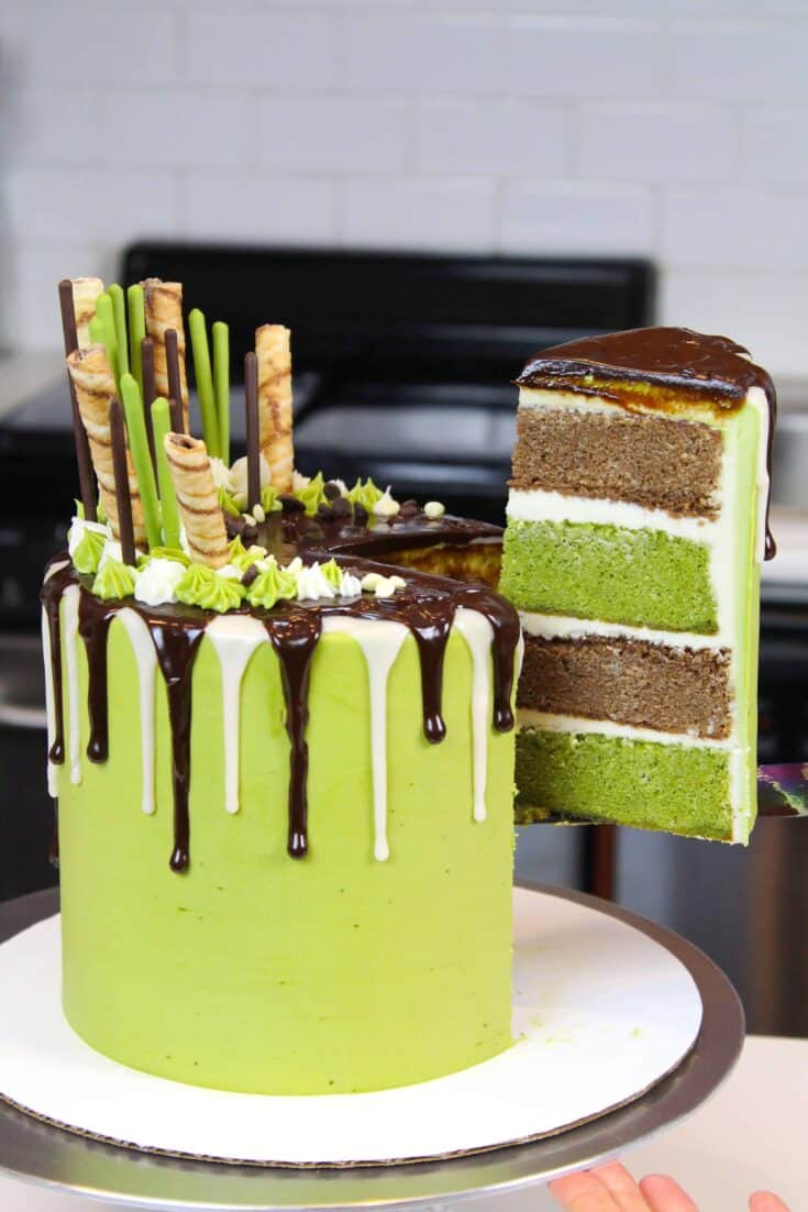 这抹茶蛋糕食谱简直是美味!它是用巧克力和抹茶蛋糕层,抹茶奶油制成,并装饰有黑巧克力和白巧克力滴。