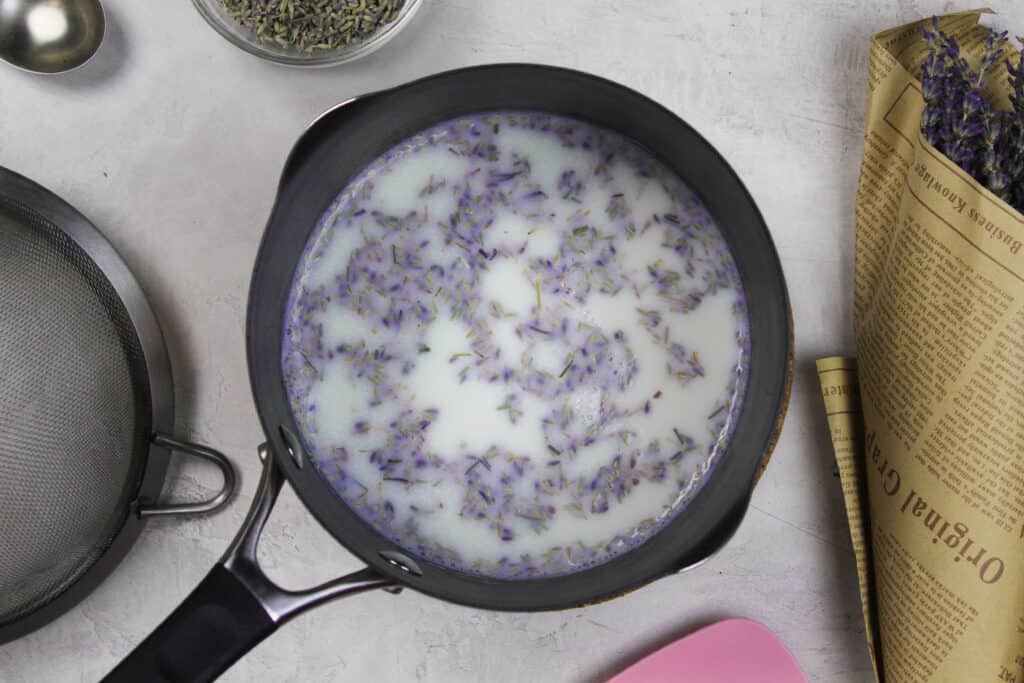 我发现最好的方法是把干薰衣草浸泡在炖牛奶里。待混合物静置15分钟后,用细网过滤器将牛奶过滤。