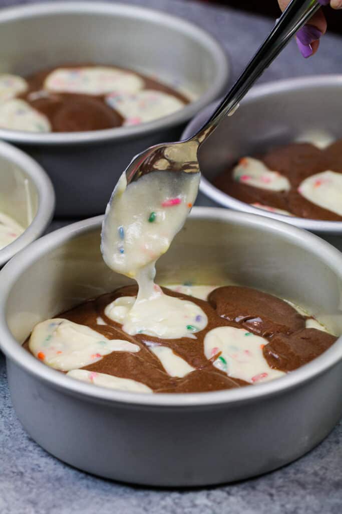 - 在准备好的蛋糕锅中交替放入巧克力和香草蛋糕面糊,将其填入大约一英寸高的面糊(我喜欢用a电子厨房秤为了确保每个盘都有面糊的相同金额)。