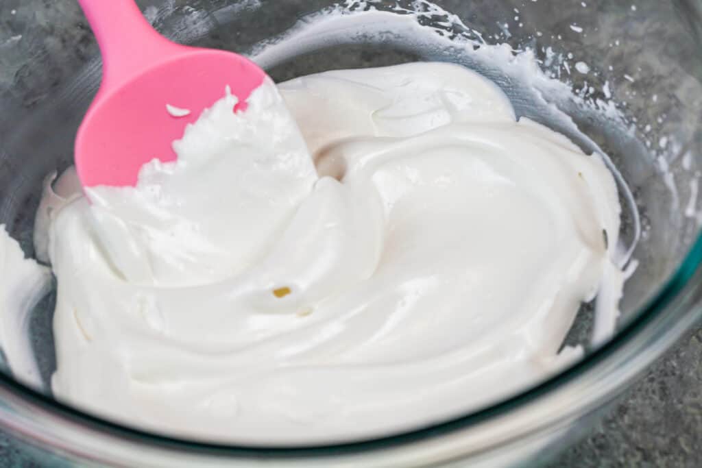 - 加入1茶匙香草精,中速搅拌至完全融合。一旦准备好,糖霜应该看起来有光泽,有坚硬的山峰。