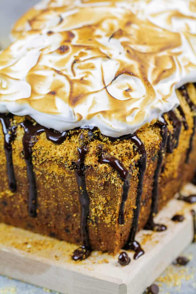 这款s'mores香蕉面包真是太好吃了!!上面淋上巧克力甘纳许,再撒上烤棉花糖糖霜!